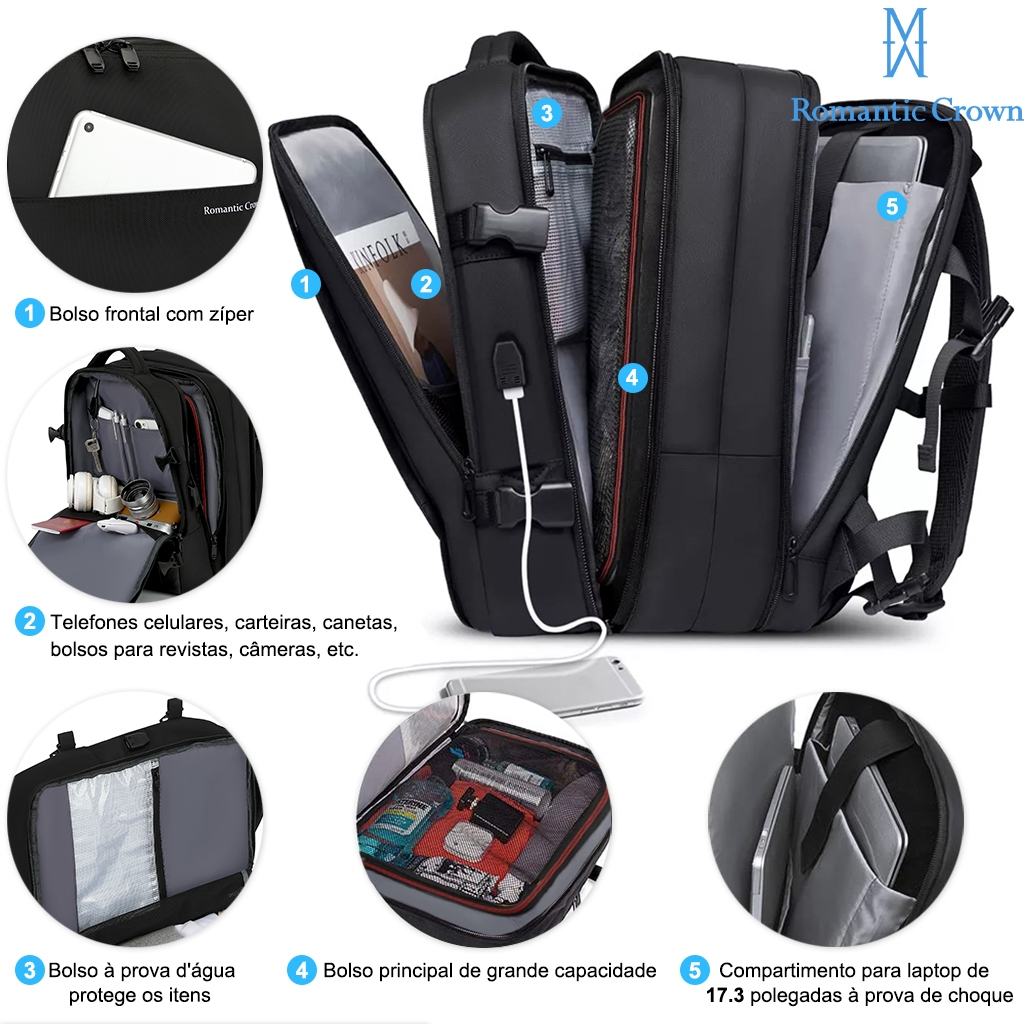 ROMANTIC CROWN Mochila Viagem Executiva Expansível 45L Masculina e Feminina Reforçada para Notebook