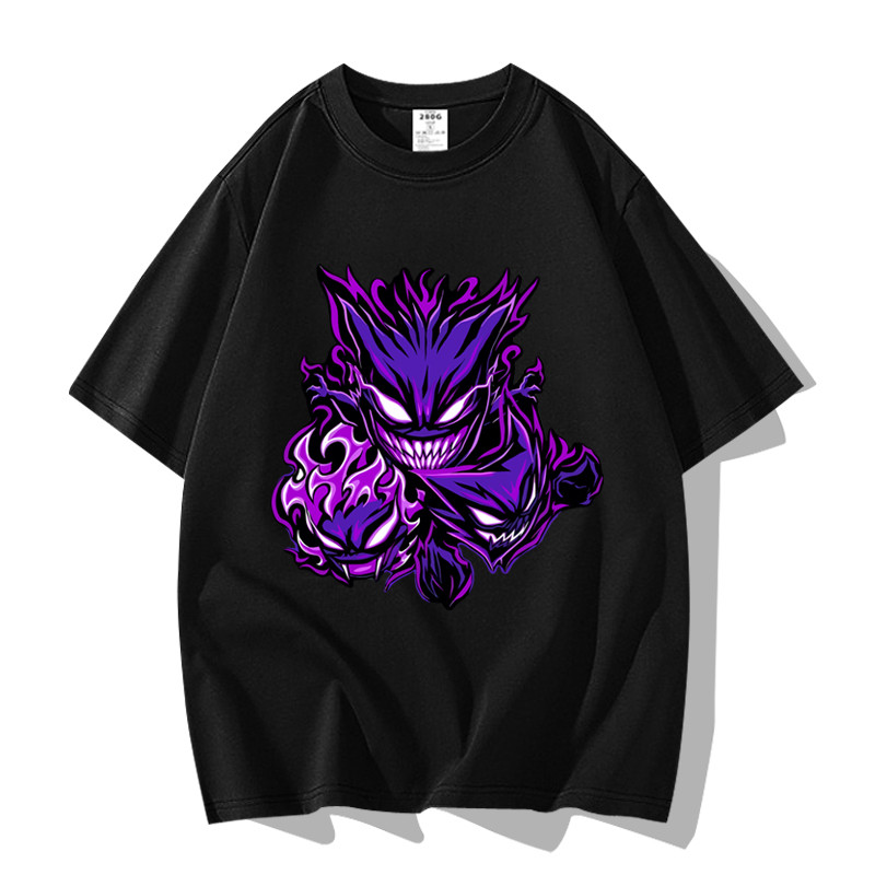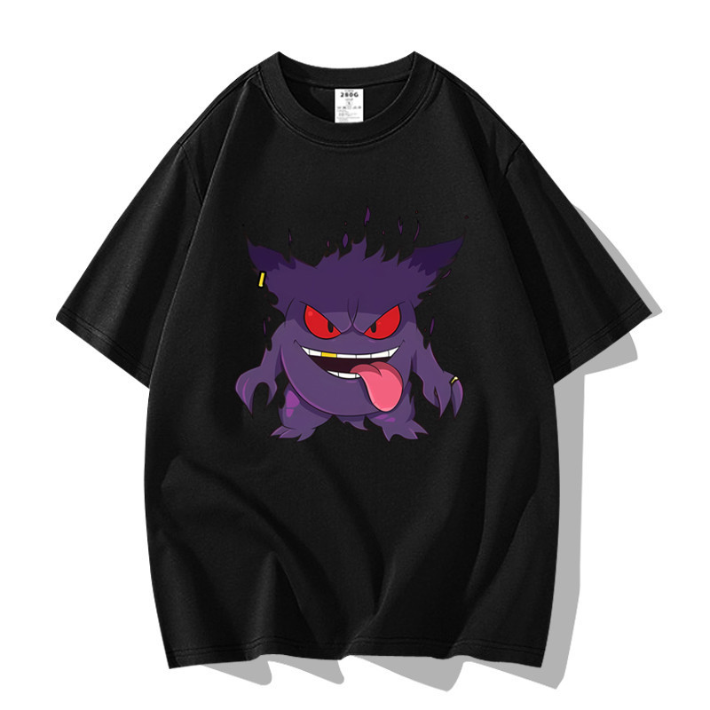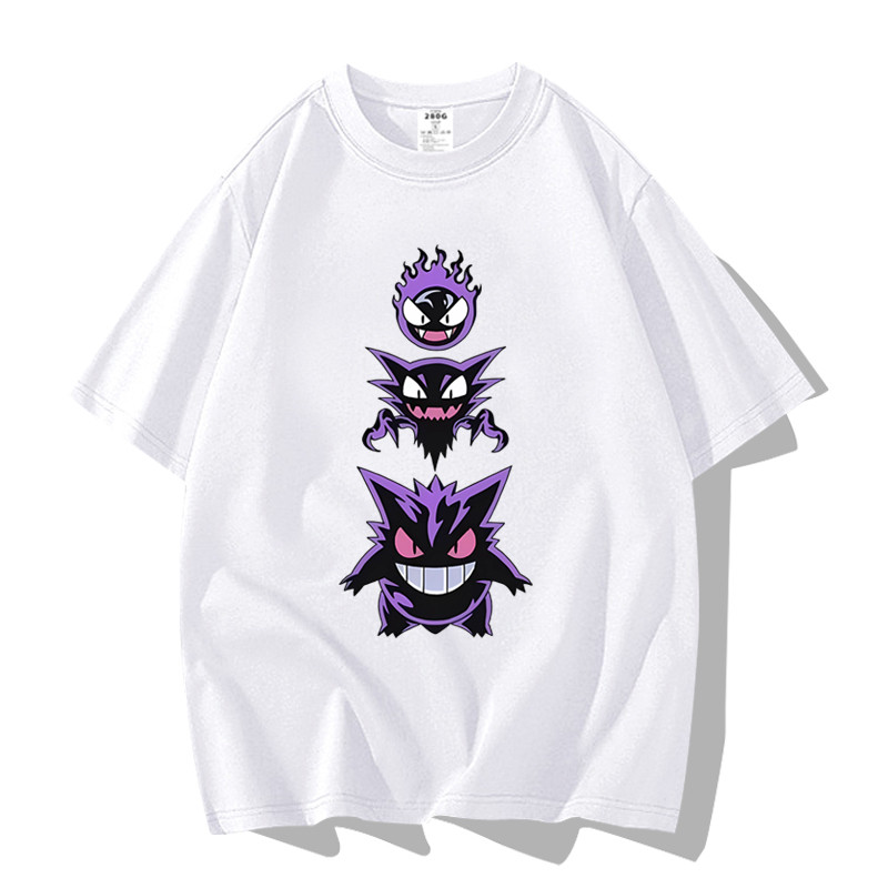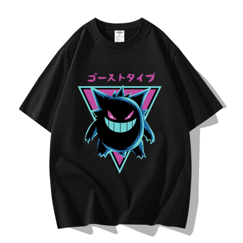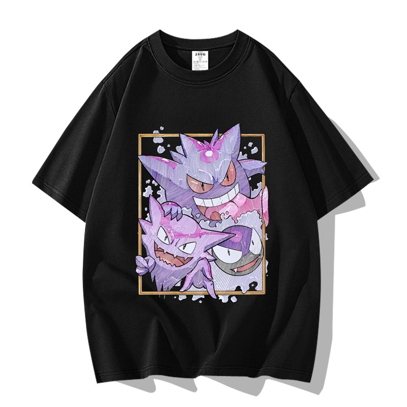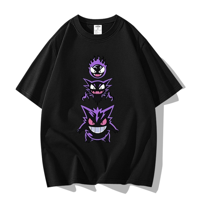 Camiseta Preta Unisex com Design dos Personagens Pokémon Gengar e Seus Evolutivos, Estilo Pop Culture