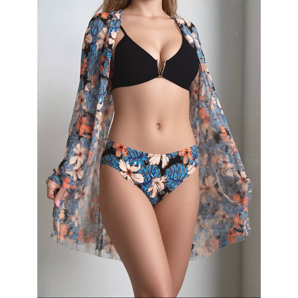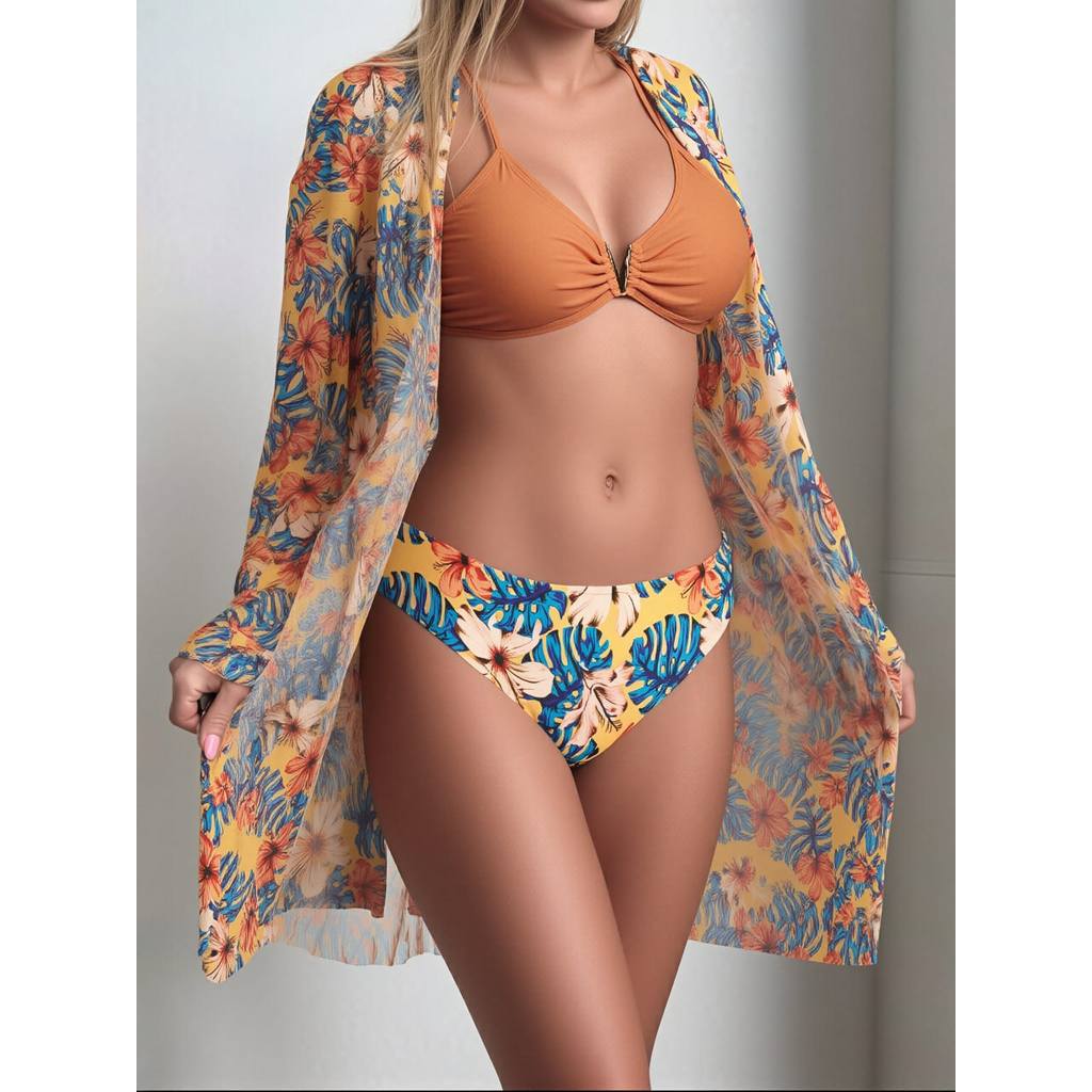 Biquíni top bojo renovável feminino conjunto estampa floral três peças metal-V moda praia piscina lazer natação