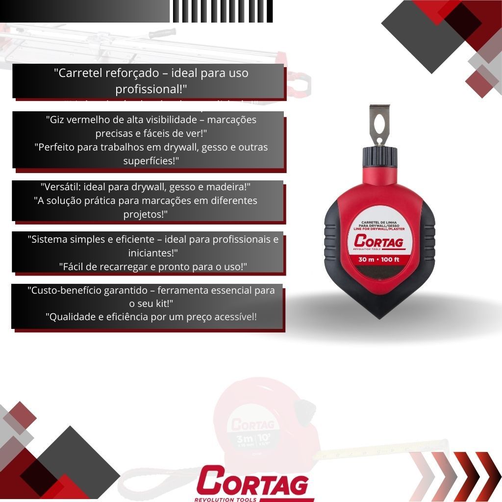 Carretel de Linha 30m com Giz Vermelho para Drywall Gesso Obra Cortag