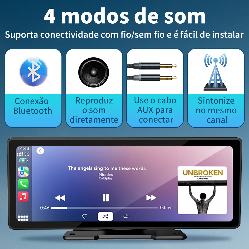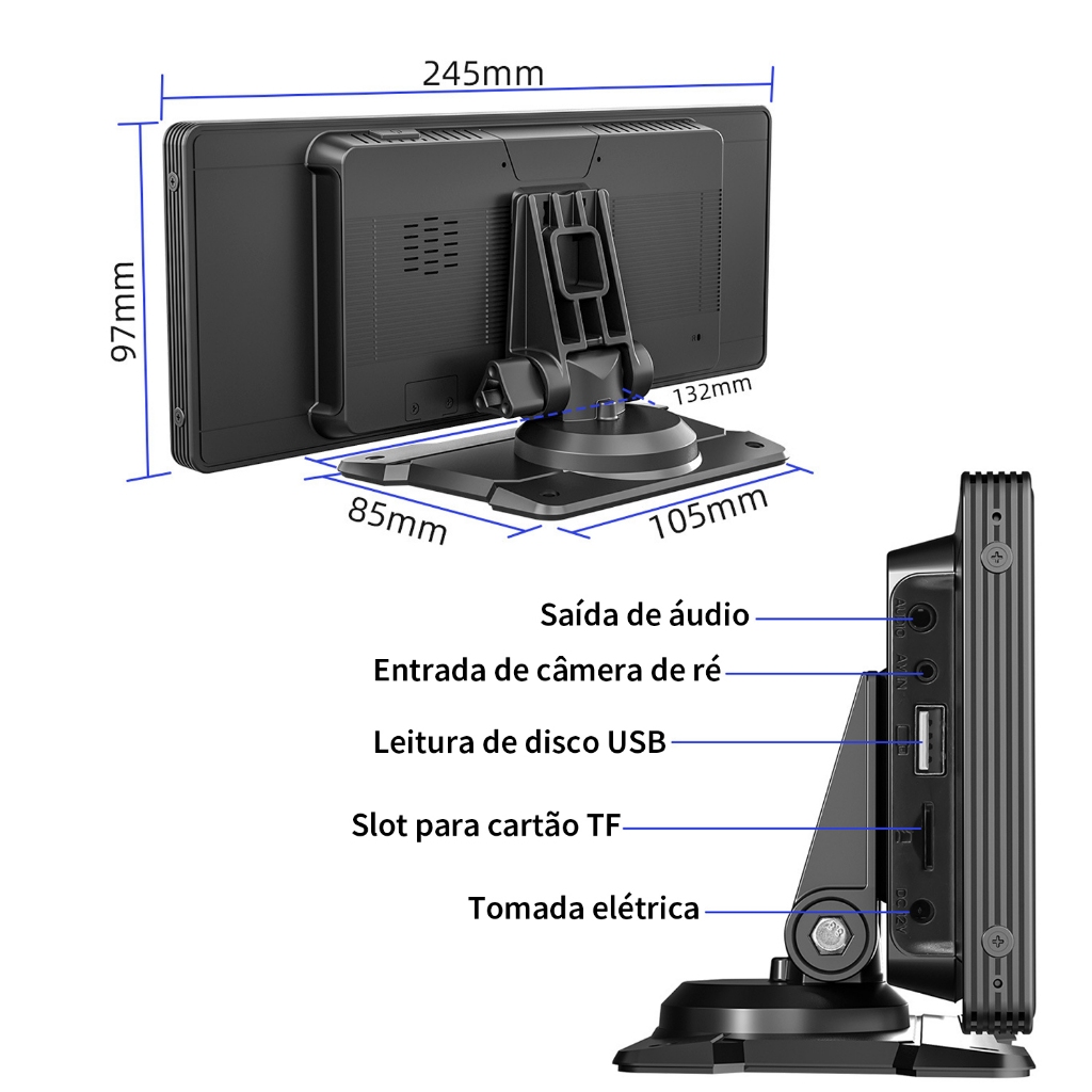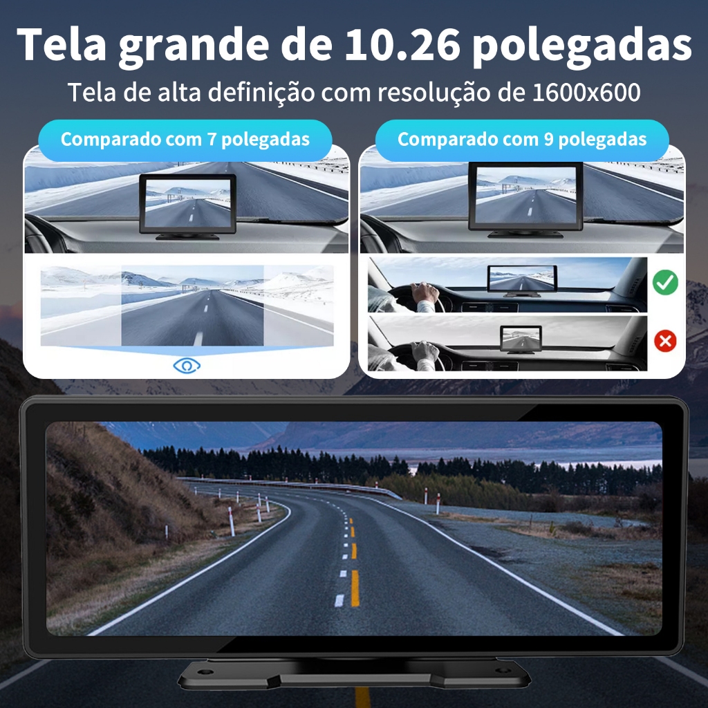 Tela 10.26" HD Suporta Câmera AHD, CarPlay/Android Auto Wireless/Cabo, Bluetooth 5.0, Toque, Auxílio Vídeo Ré, USB/TF