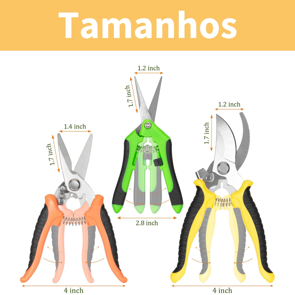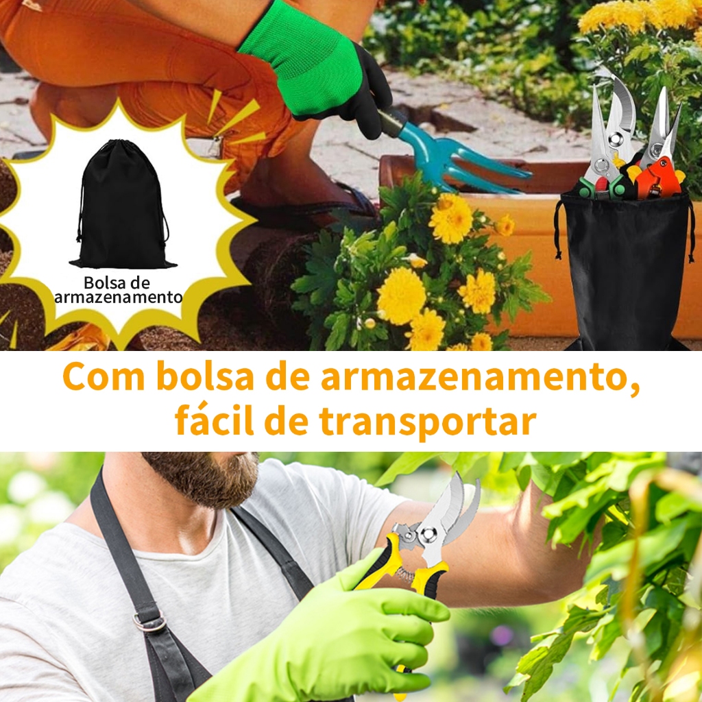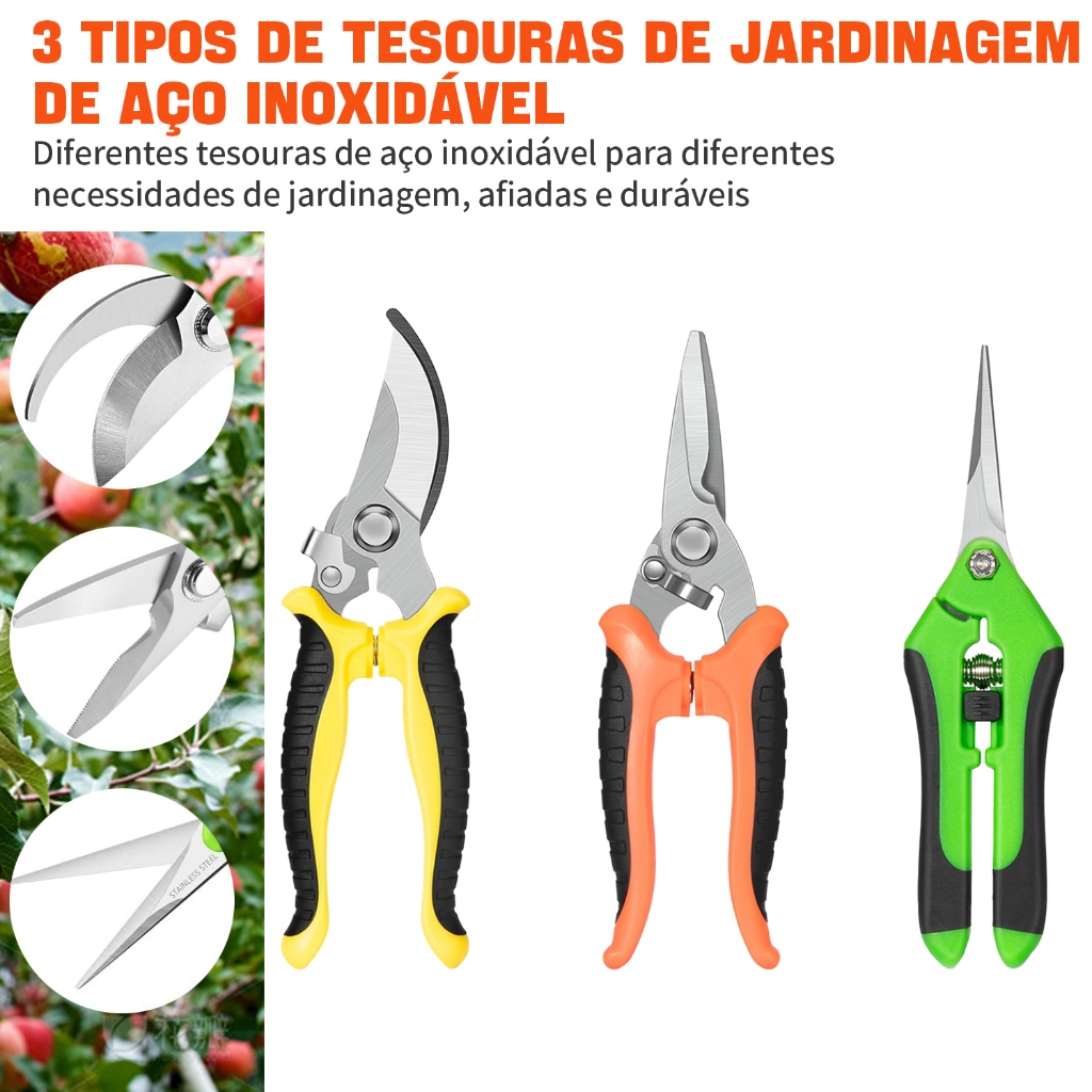 Tesoura de Jardinagem Kit 3 Peças Profissional - Aço Inoxidável para Poda, Flores e Frutas com Bolsa Inclusa