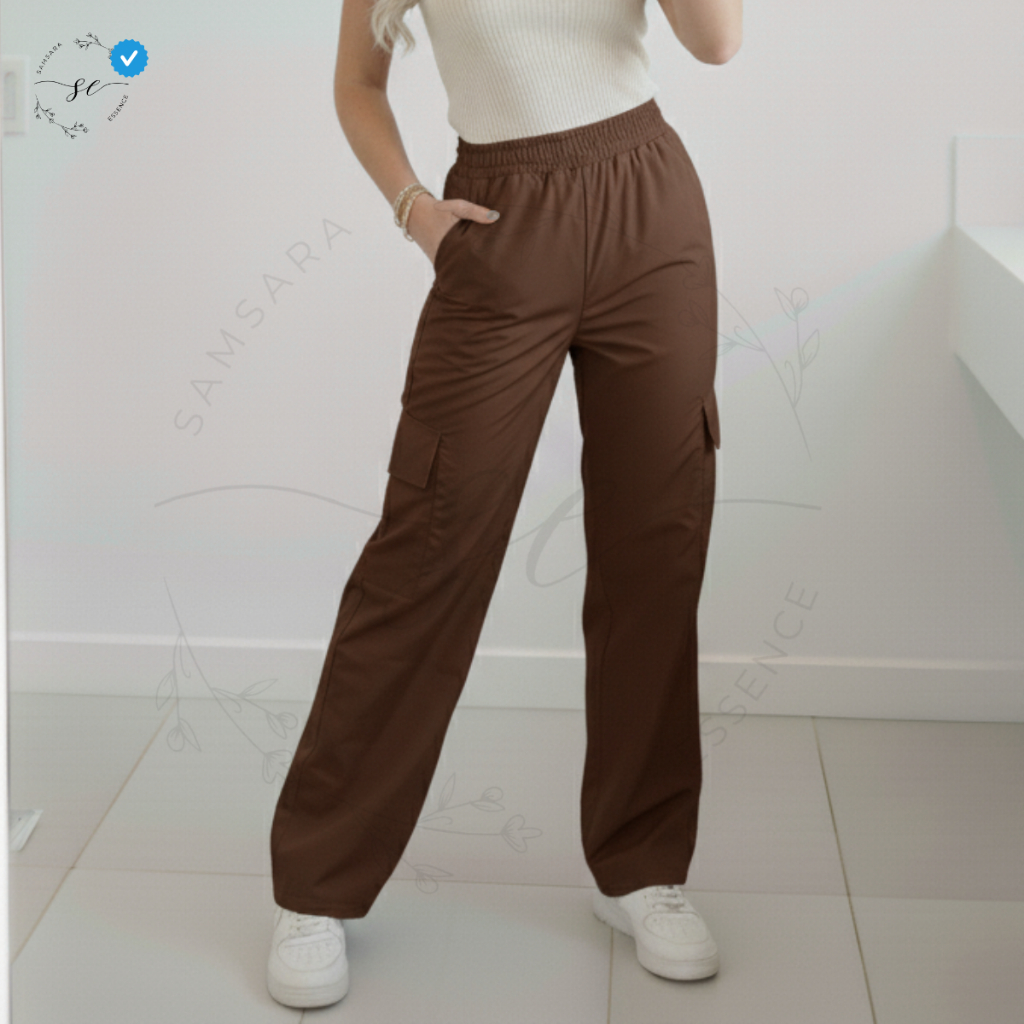 Calça Feminina Cargo Fashion & Moderna em Tactel com Elástico na Cintura e Bolsos Funcionais