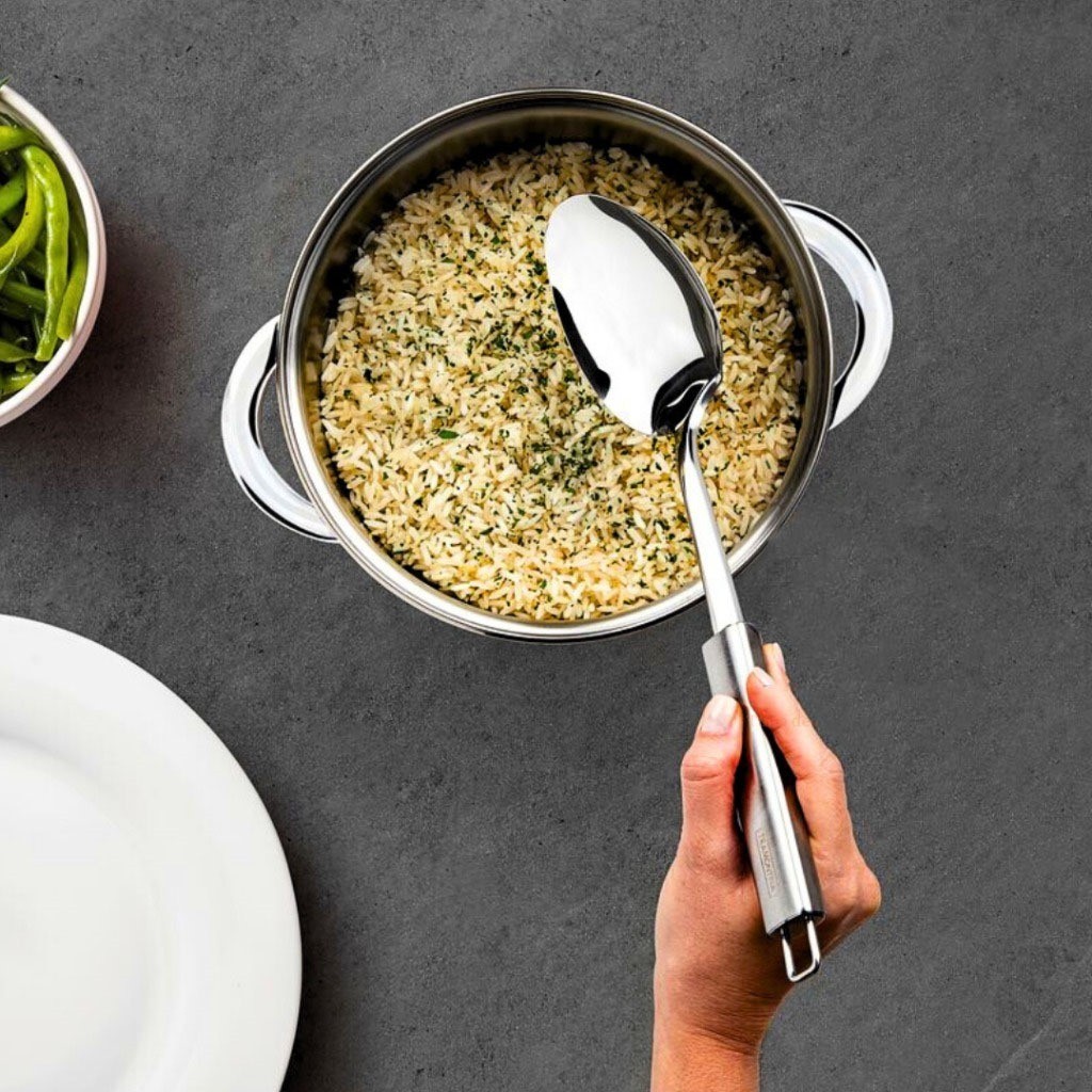 Kit 3 Utensílios de Cozinha Linha Premium – Colher de Arroz, Concha de Feijão e Escumadeira em Inox Alta Qualidade