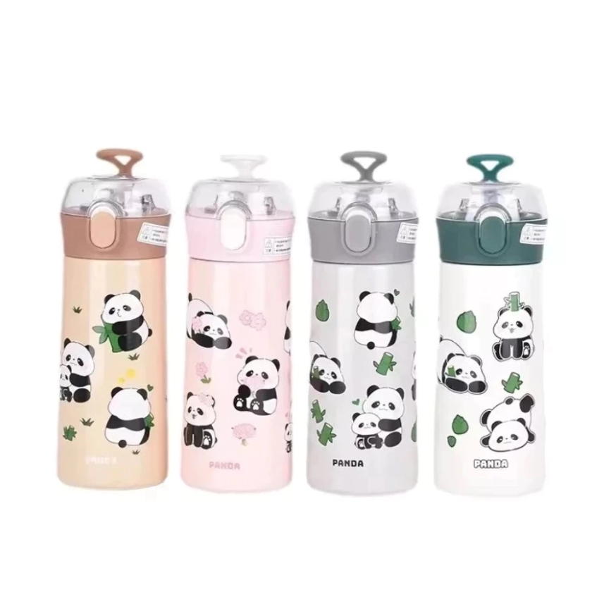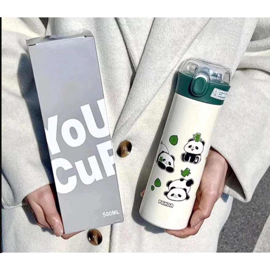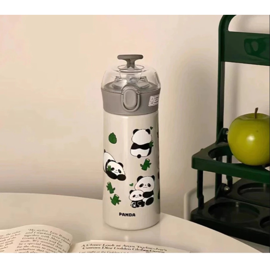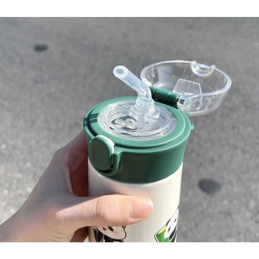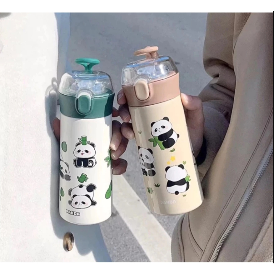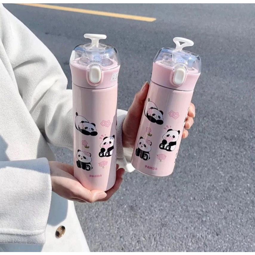 Garrafa Térmica Com Canudo Estampa Panda Aço Inox 500ml