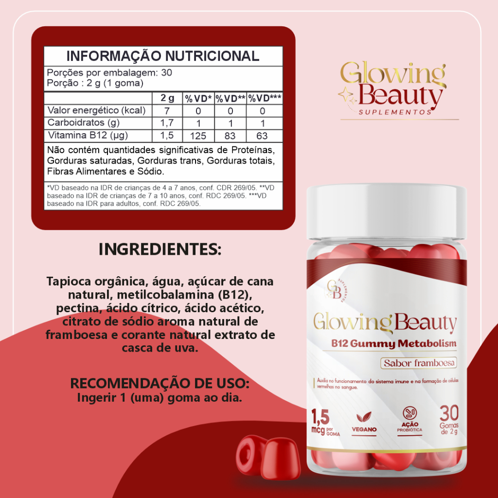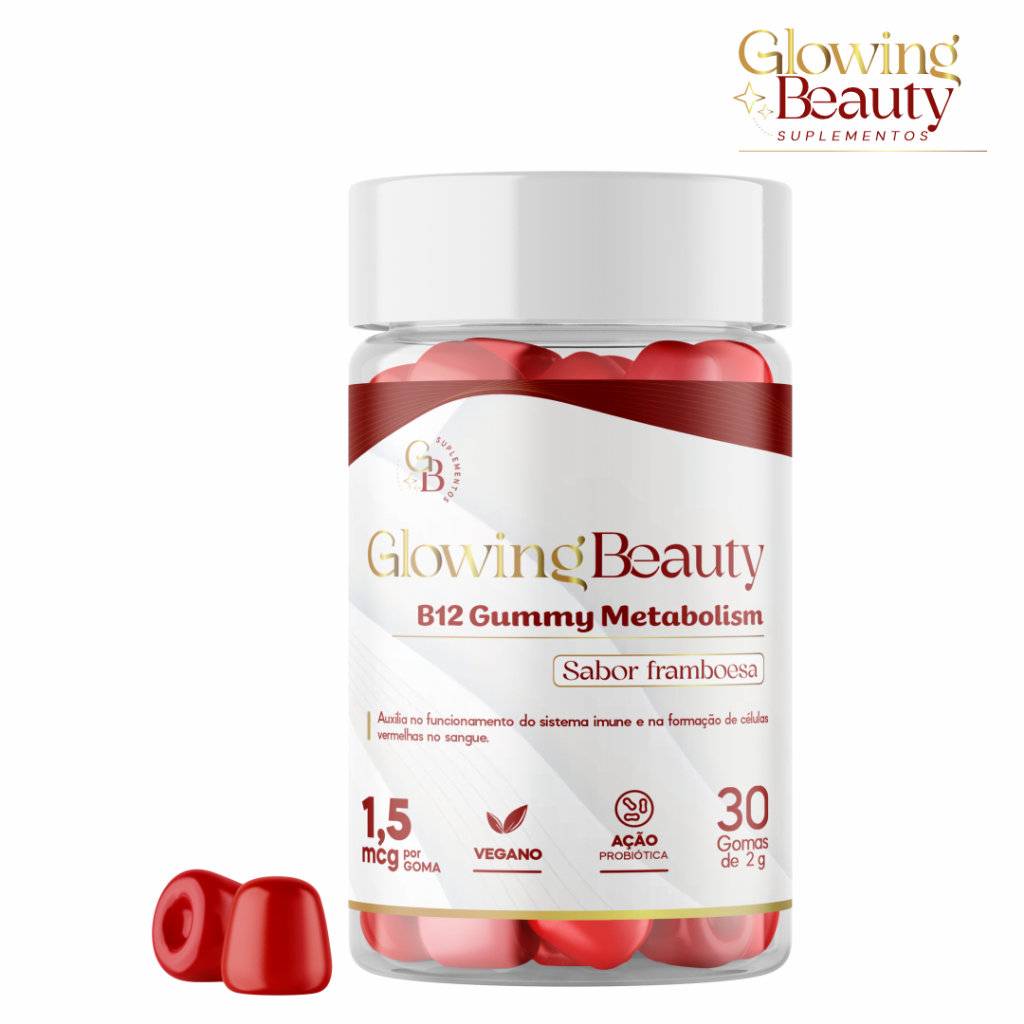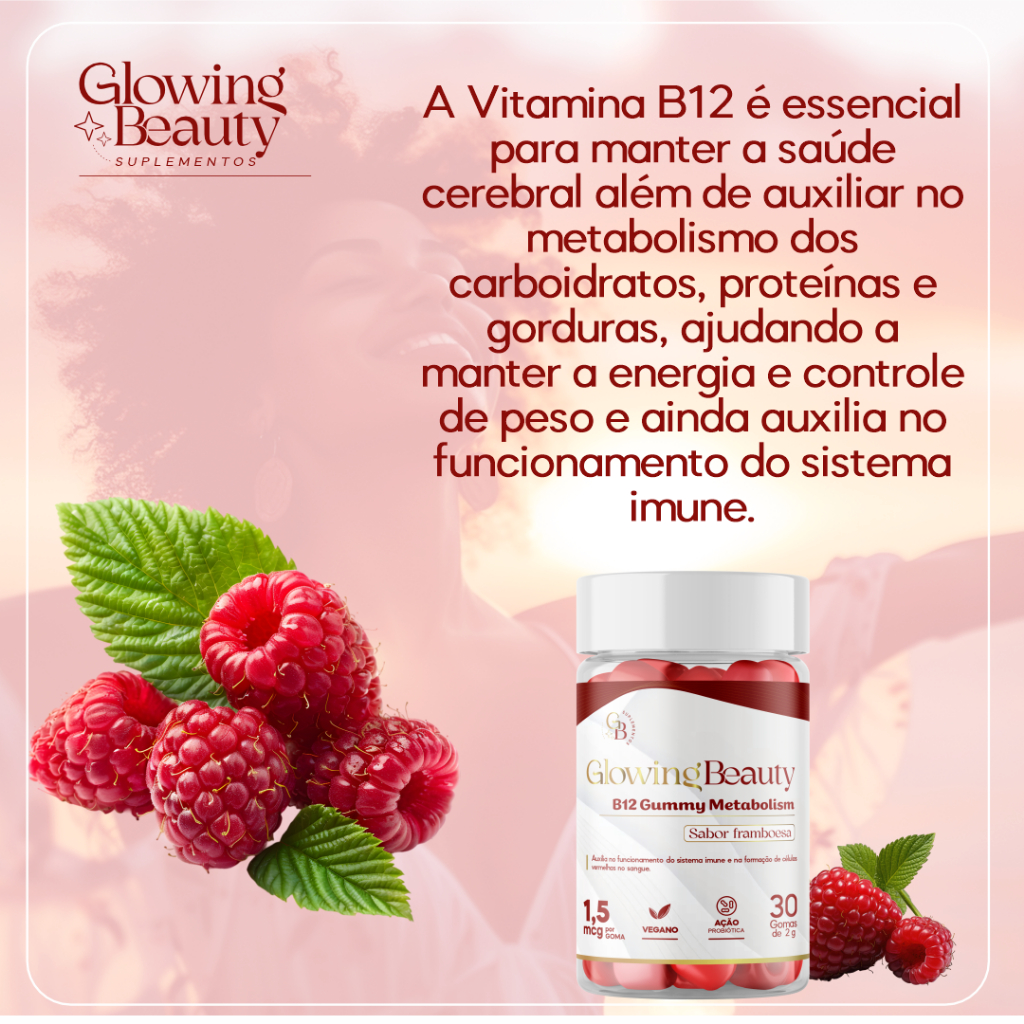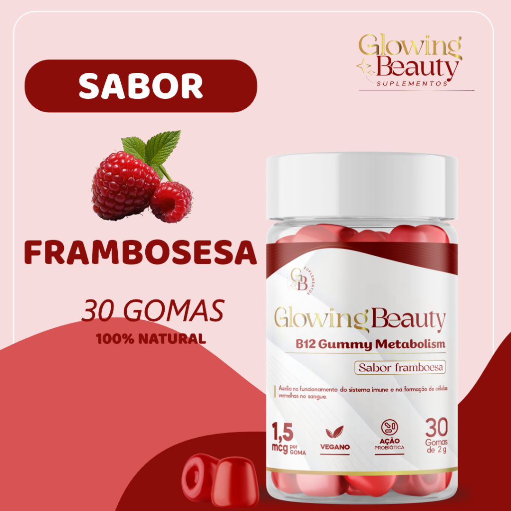 Gomas B12 Gummy Metabolism. Sabor Framboesa 100% Natural 30 Gomas Glowing Beauty