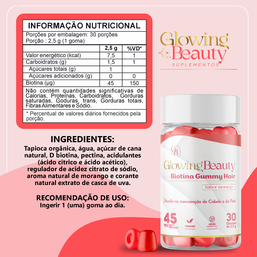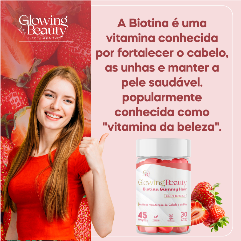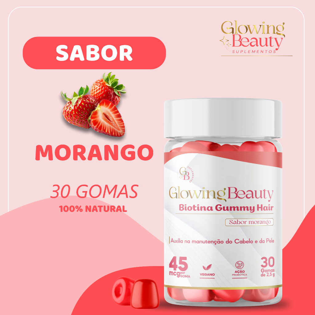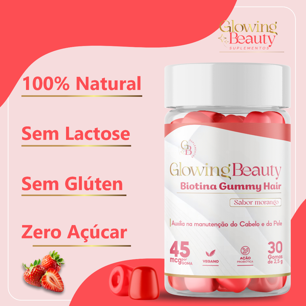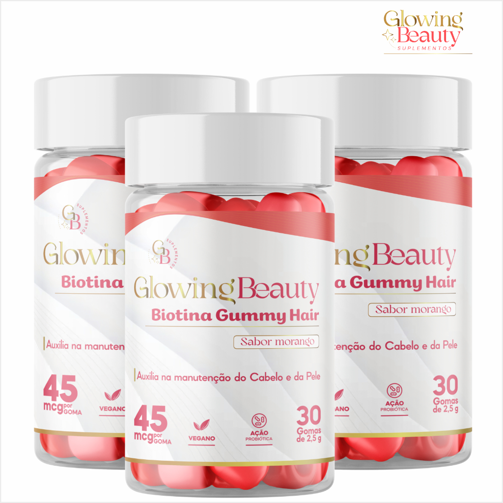 Kit 3 Potes de Gomas Biotina Gummy Hair Sabor Morango 30 Gomas Para Cabelos Pele e Unhas Glowing Beauty