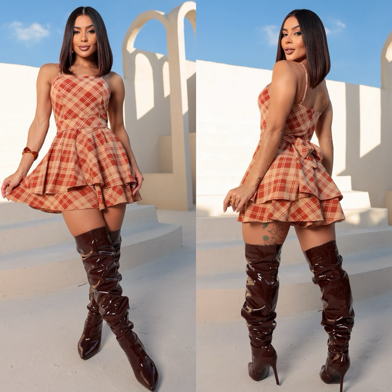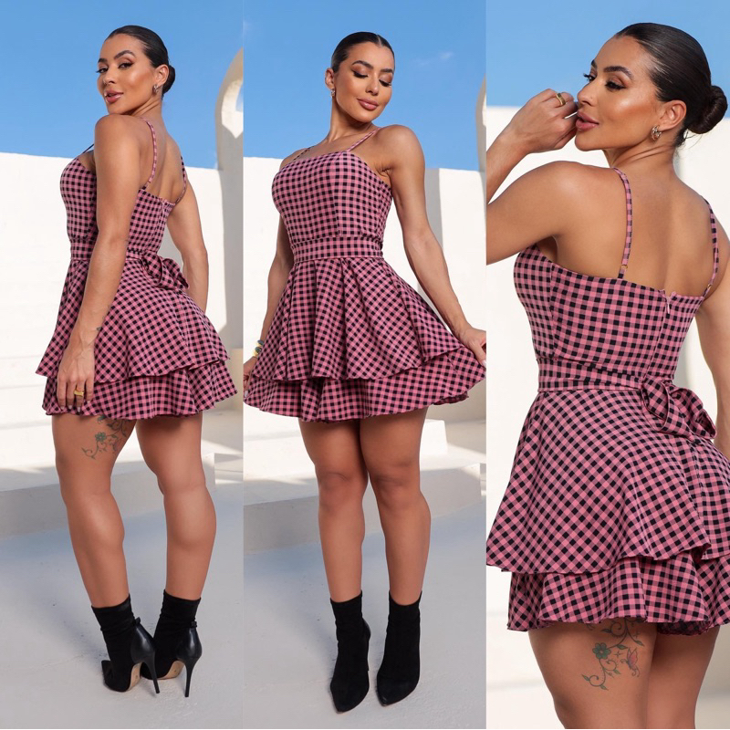 Macaquinho “ Rodadinho de laço móvel “ moda feminina elegante ( possui forro e bojo zíper invisível ) xadrez quadriculad