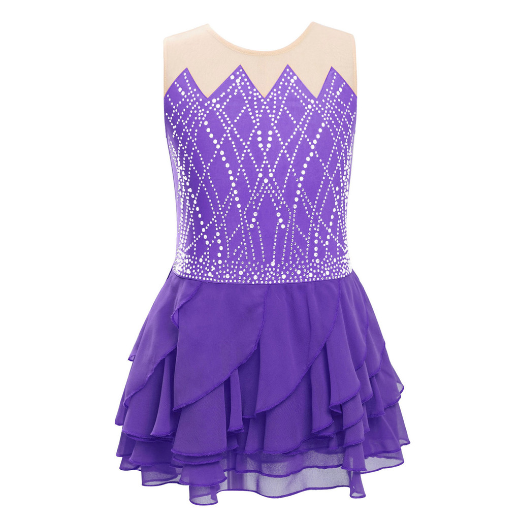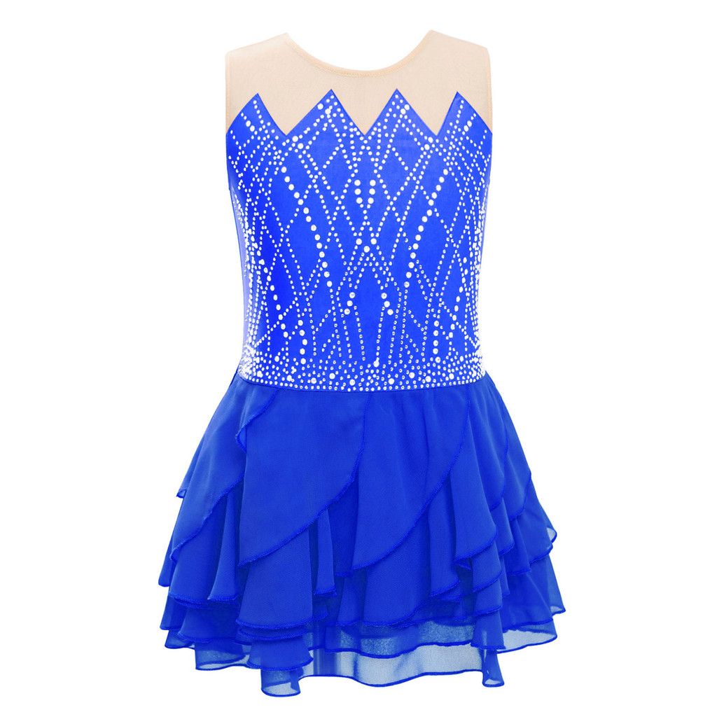 inhzoy Crianças Meninas Patinação Artística Dança Traje Em Torno Do Pescoço Sem Mangas Strass Brilhantes Camadas Babados