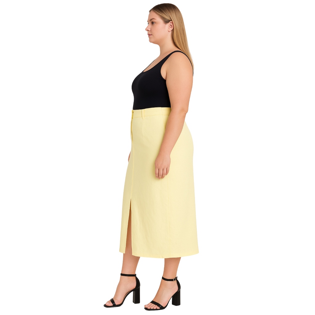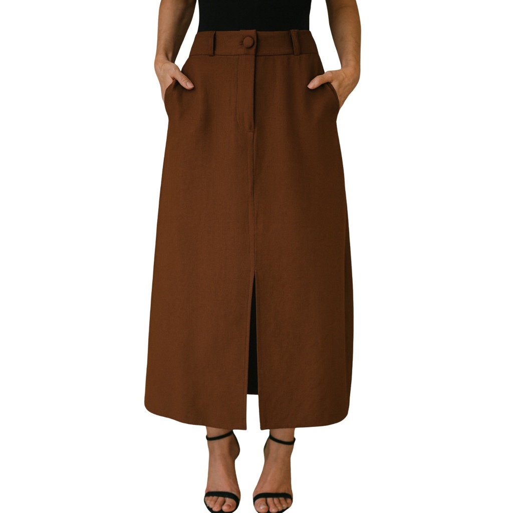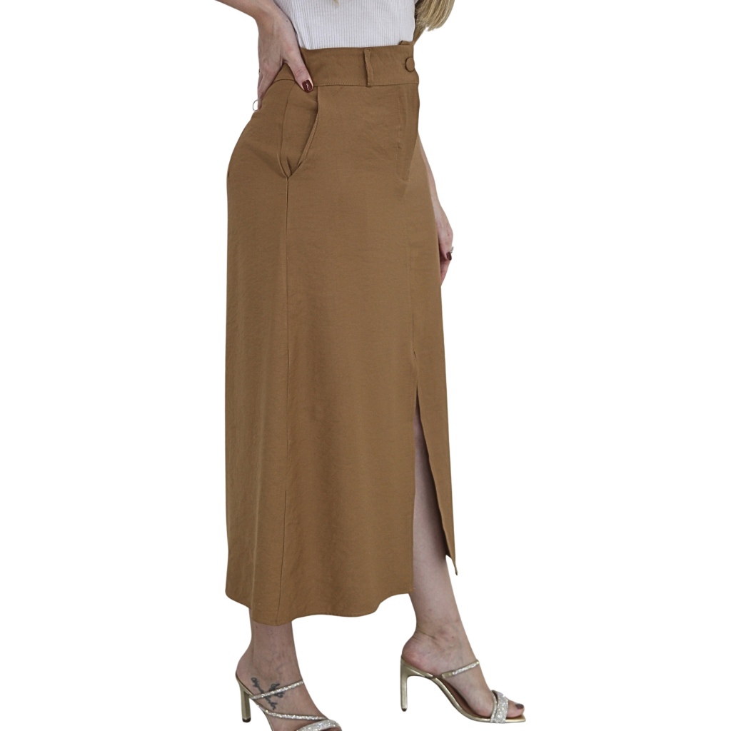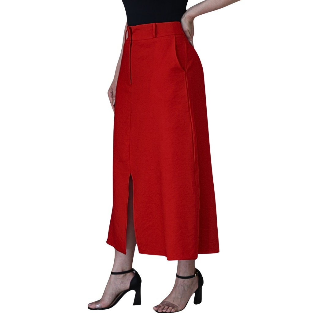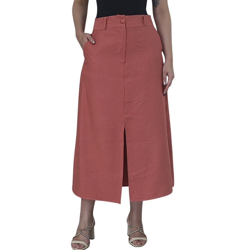 Saia Midi Feminina Marrant Cintura Alta com Fenda e Bolsos Elegante Alfaiataria