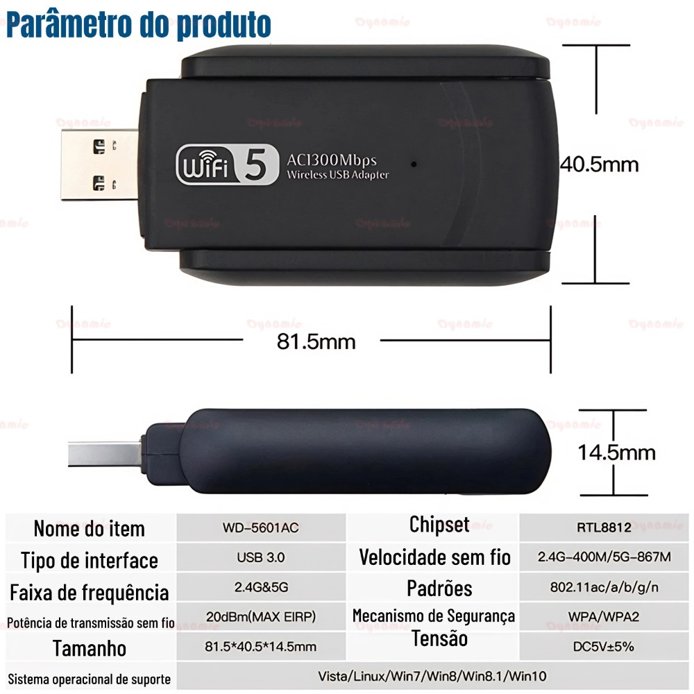 Adaptador Wifi Dual Band 2-4G e 5G 1300mbps Antena Wireles Placa De Rede Notebook PC
