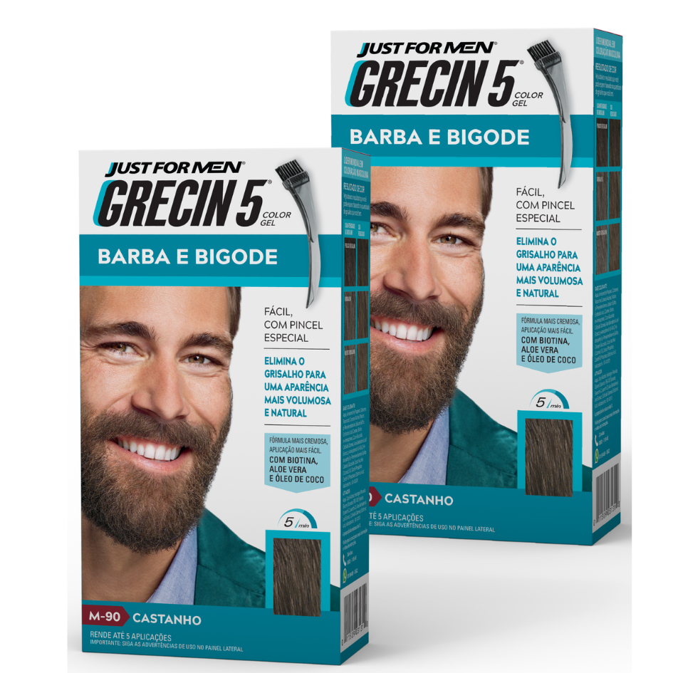 Kit 2x unidades Grecin 5 Color Gel Barba e Bigode Castanho M-90 - Cobre os fios grisalhos 5 minutos. Aparência natural.