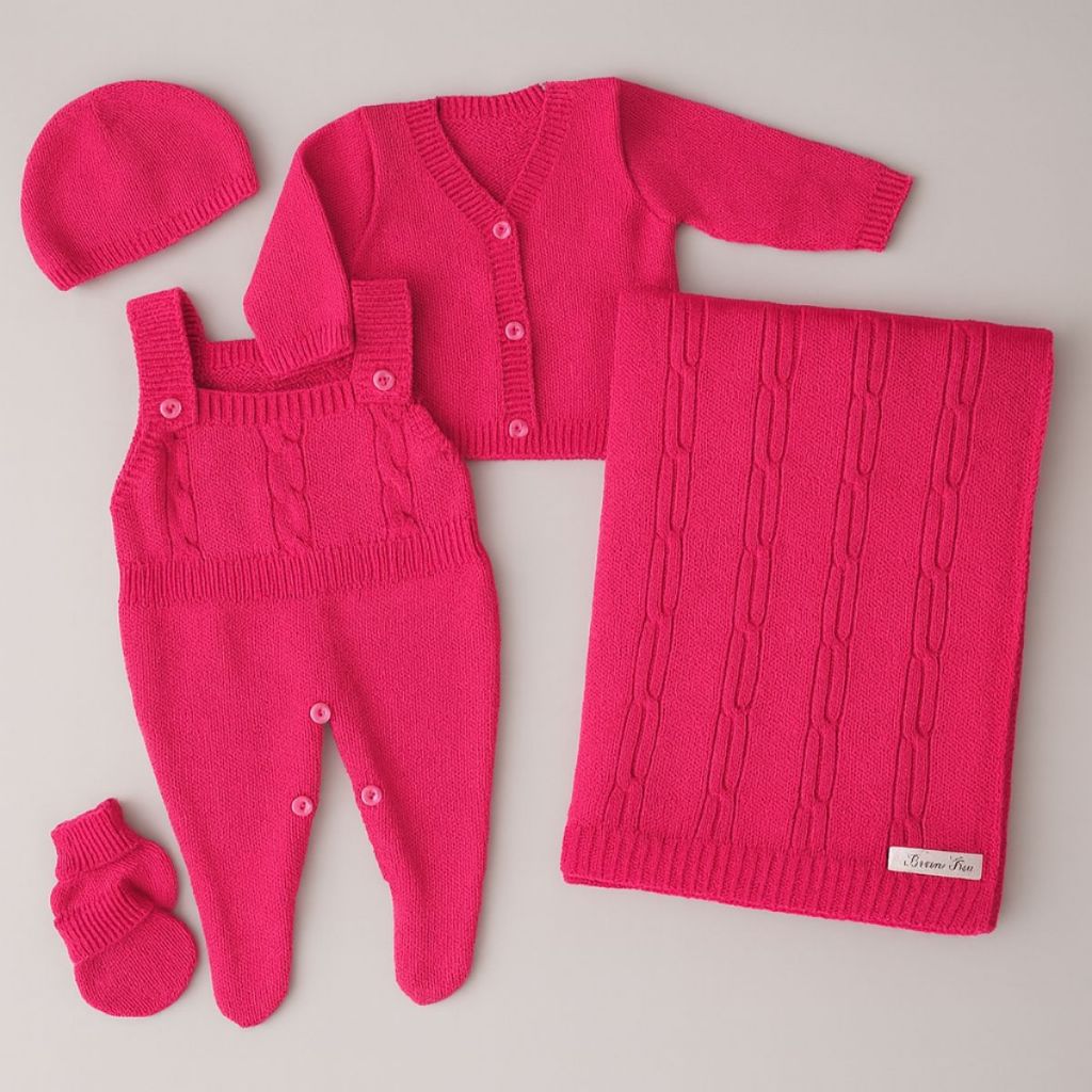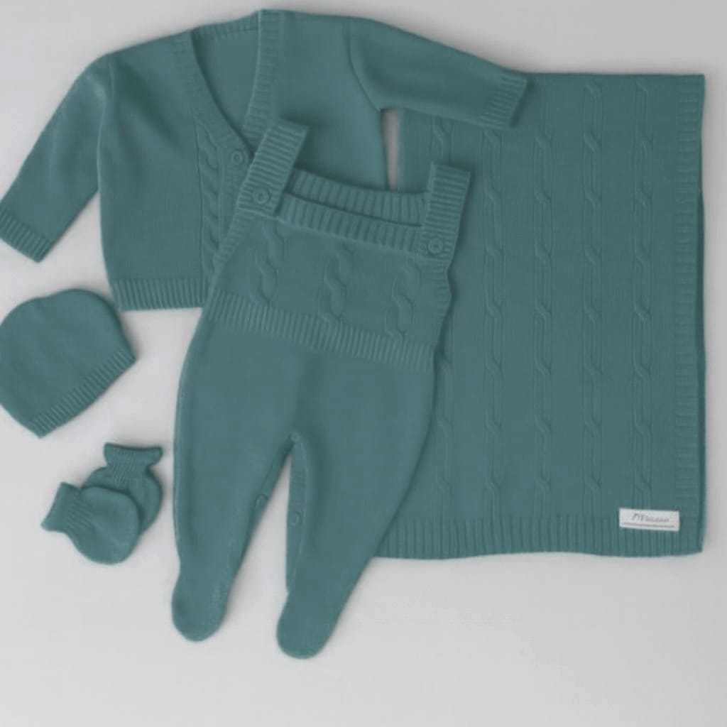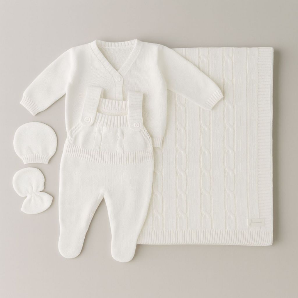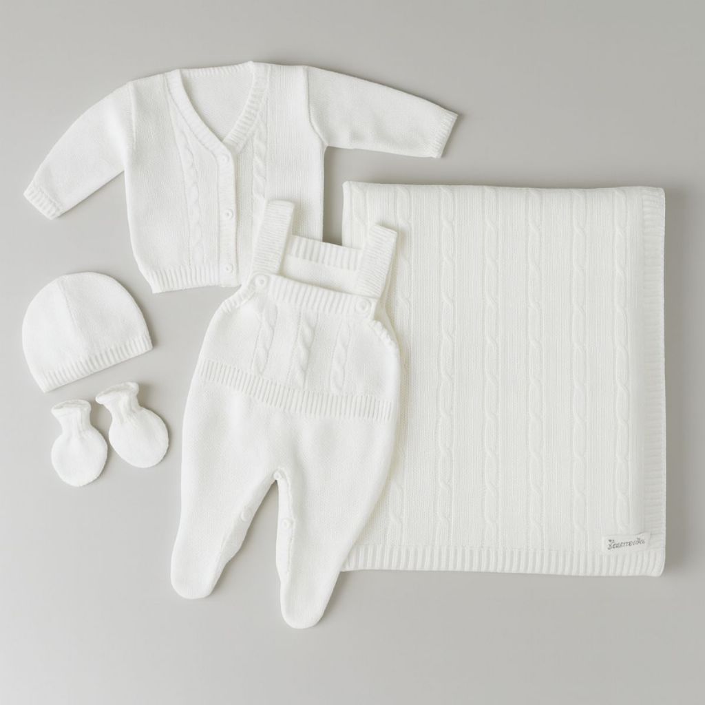 Kit Saída Maternidade Unissex Tricot – Manta, Jardineira, Casaco, Touca e Luvas para Menino e Menina