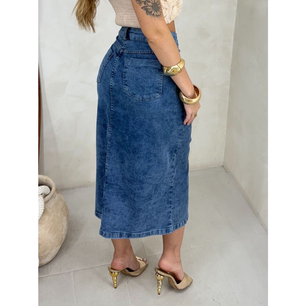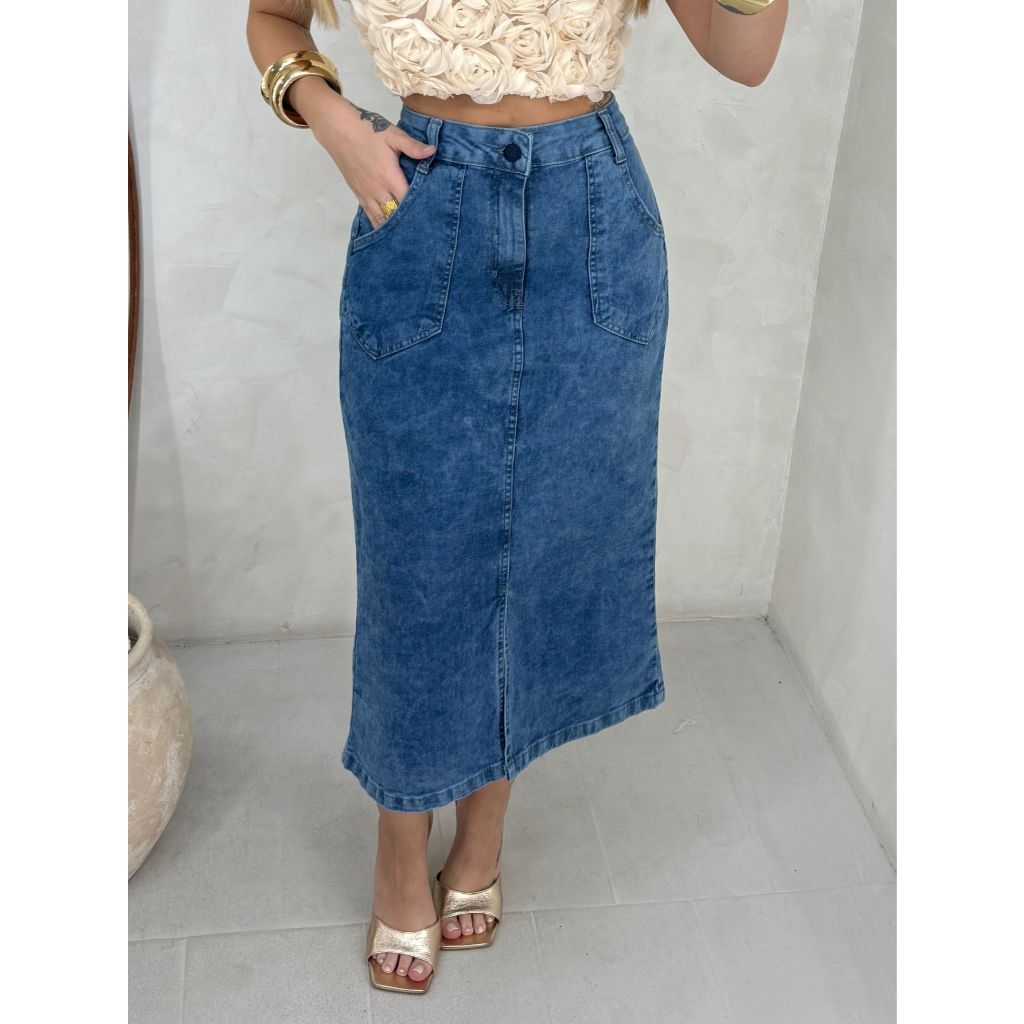Saia Midi Jeans Com Fenda Na Frente Culto Igreja Moda Evangélica Modesta Com Lycra