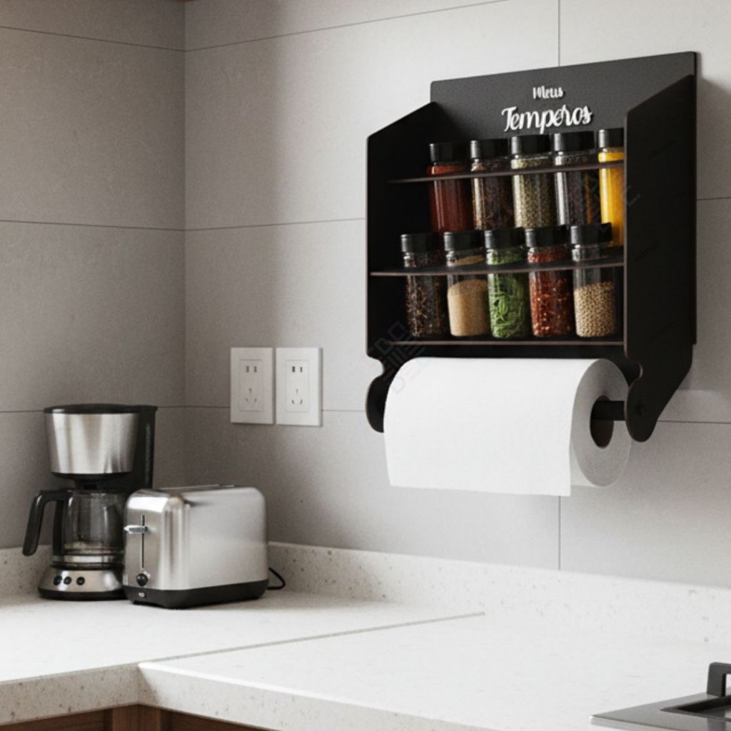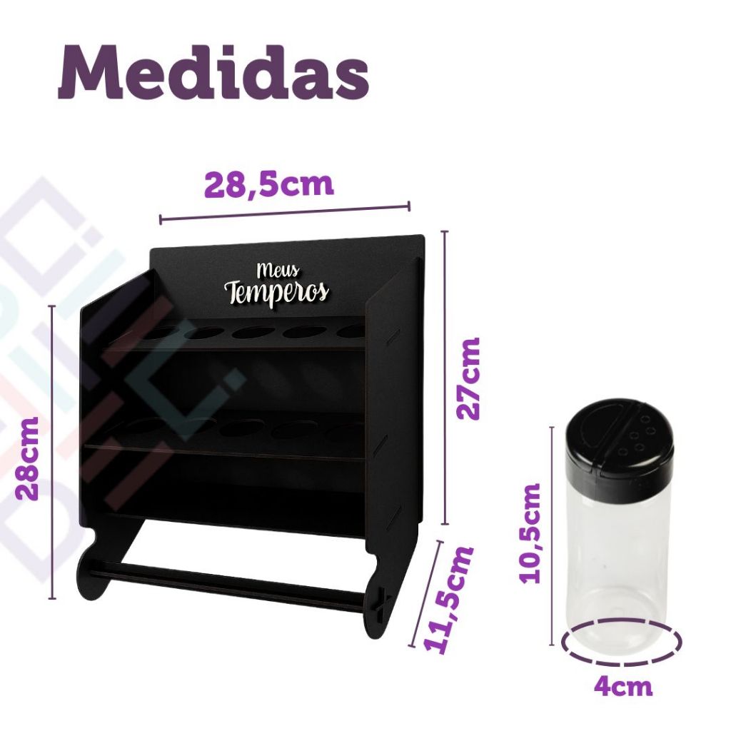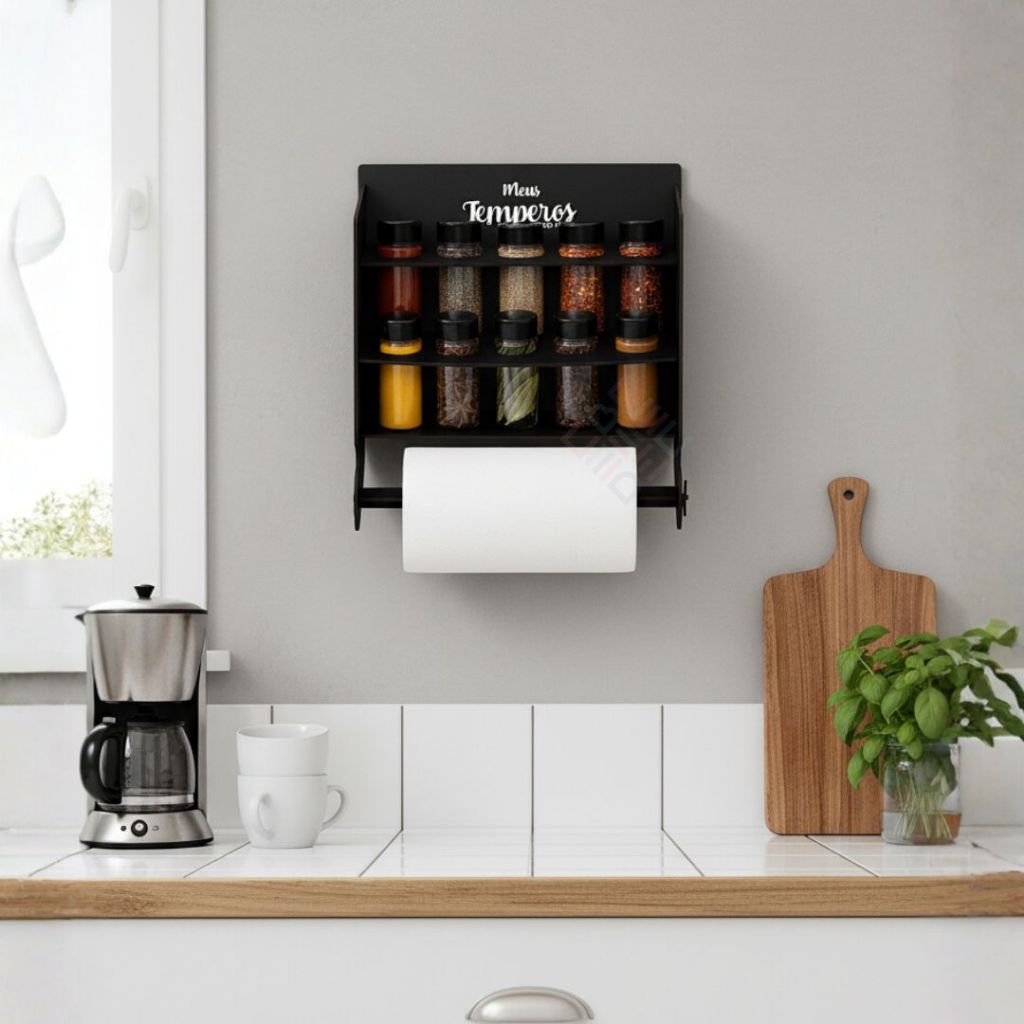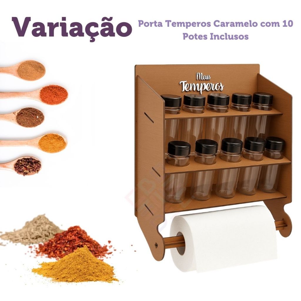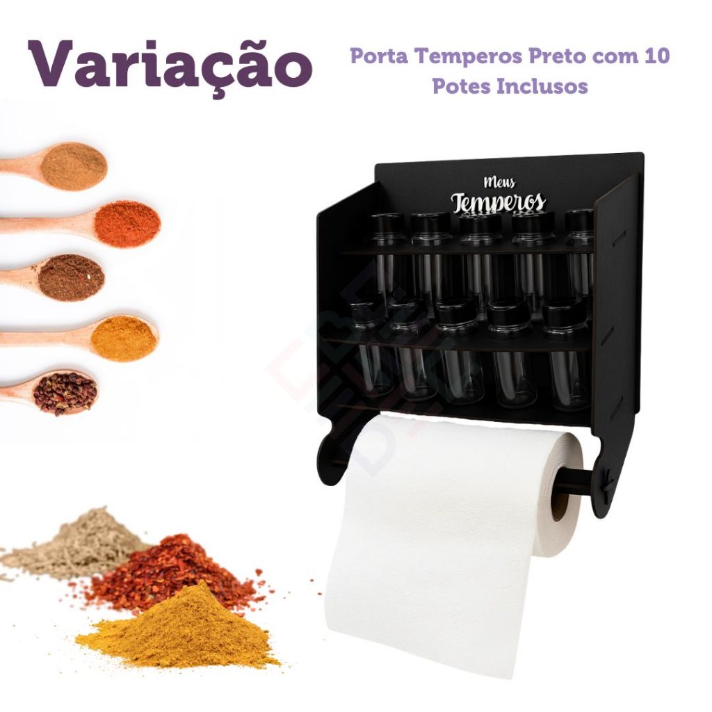 Kit Suporte Porta Temperos Com Apoio Papel Toalha + 10 Potes Inclusos + Adesivos Para Condimentos