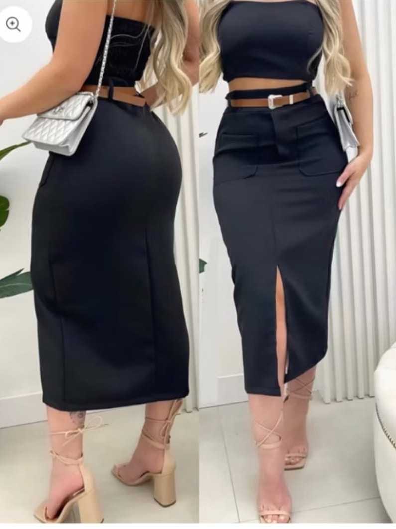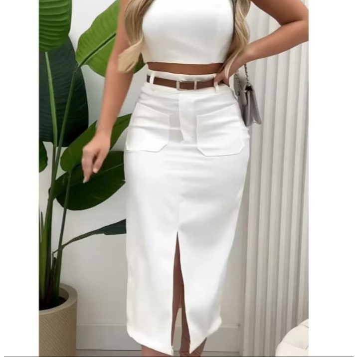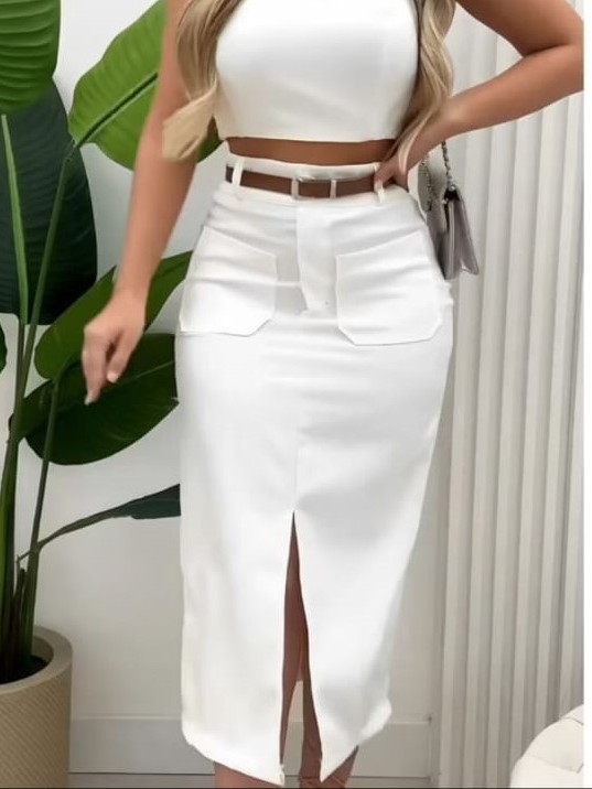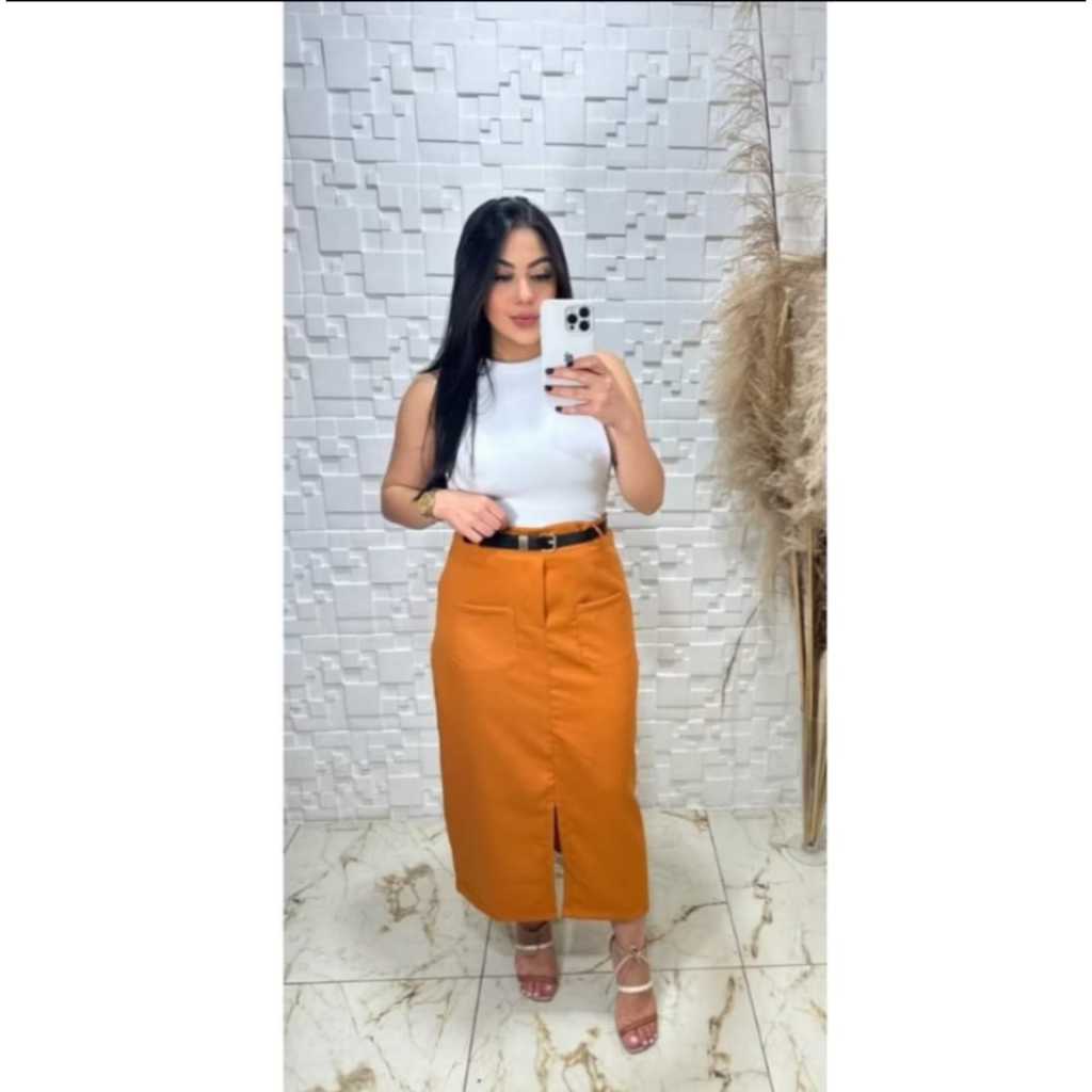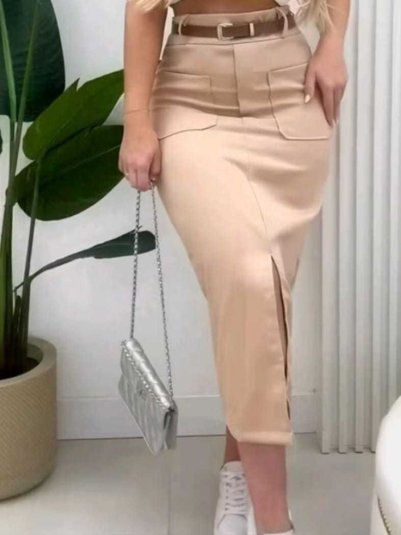 Saia Feminina Midi em Alfaiataria e Bolso Frontal com Cinto - Moda Evangélica Elegante