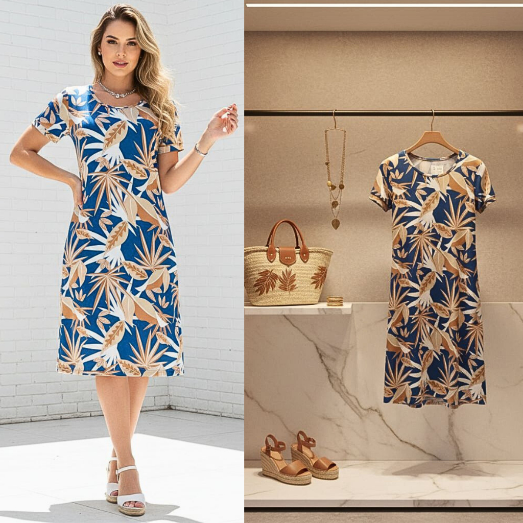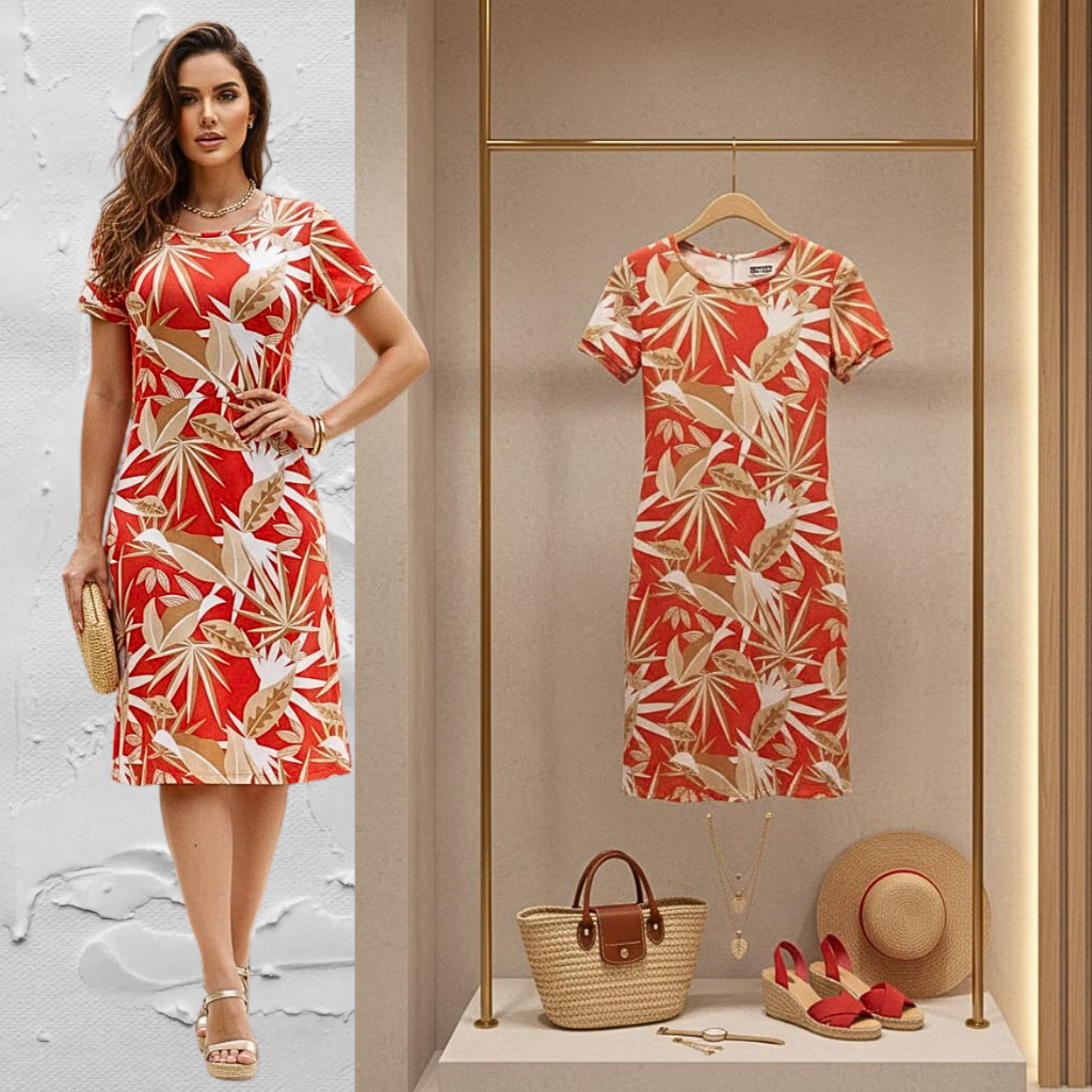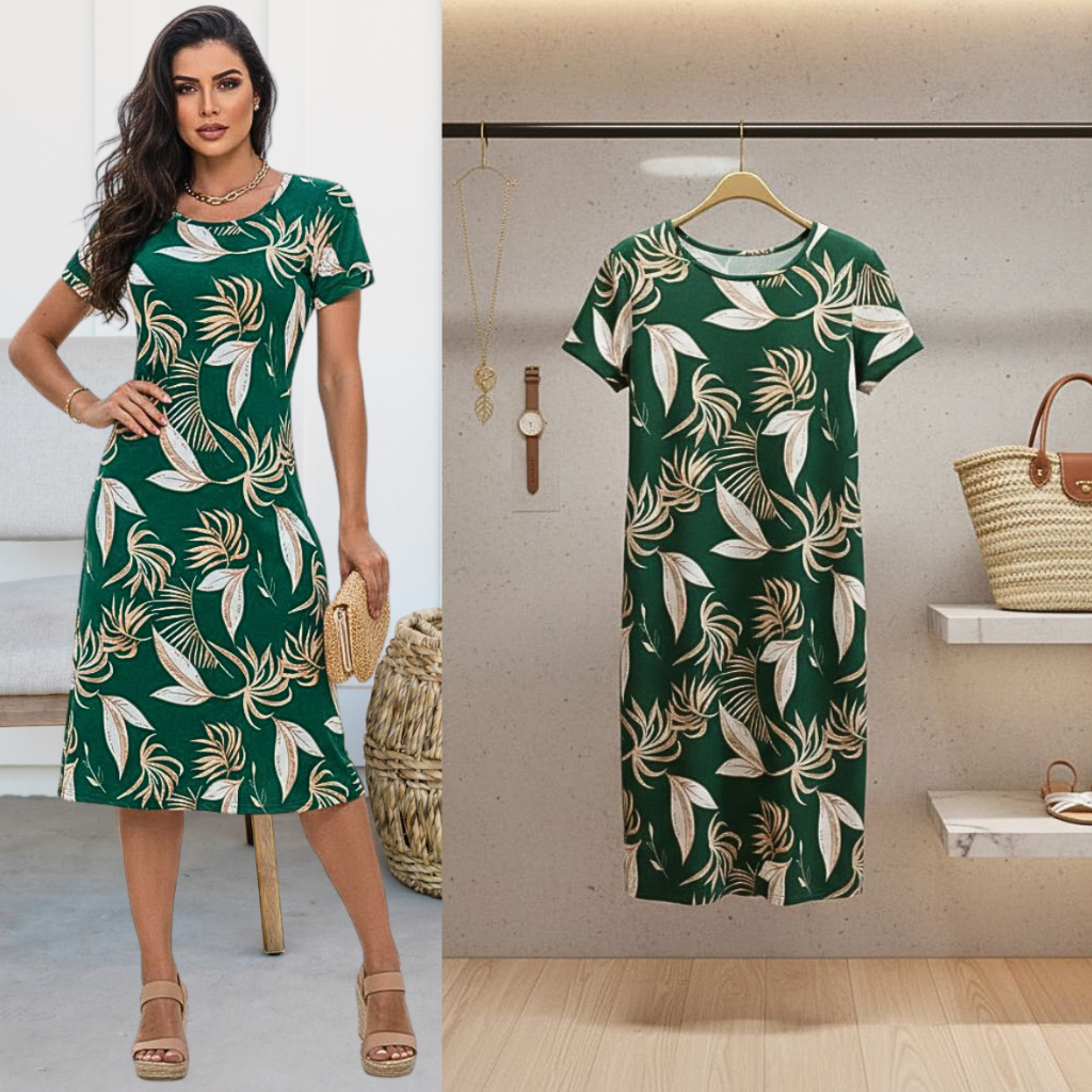 Vestido Feminino Casual Midi Soltinho Malha Fria Estampa Tropical Listrado Senhoras Manga Curta Dia a Dia