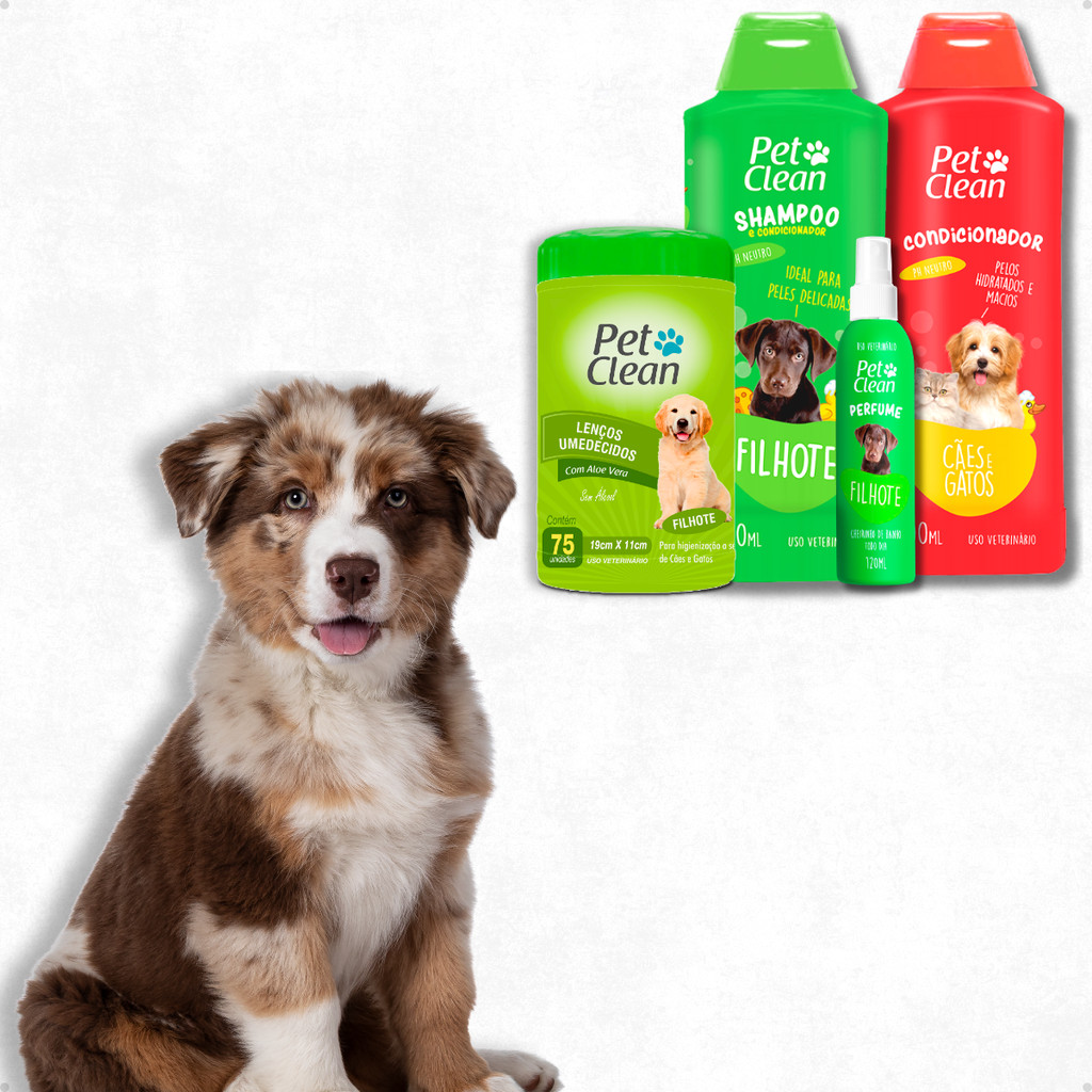 Kit Banho Pet Shop Shampoo Filhotes + Creme Condicionador + Perfume + Lenço Filhote Pet Clean
