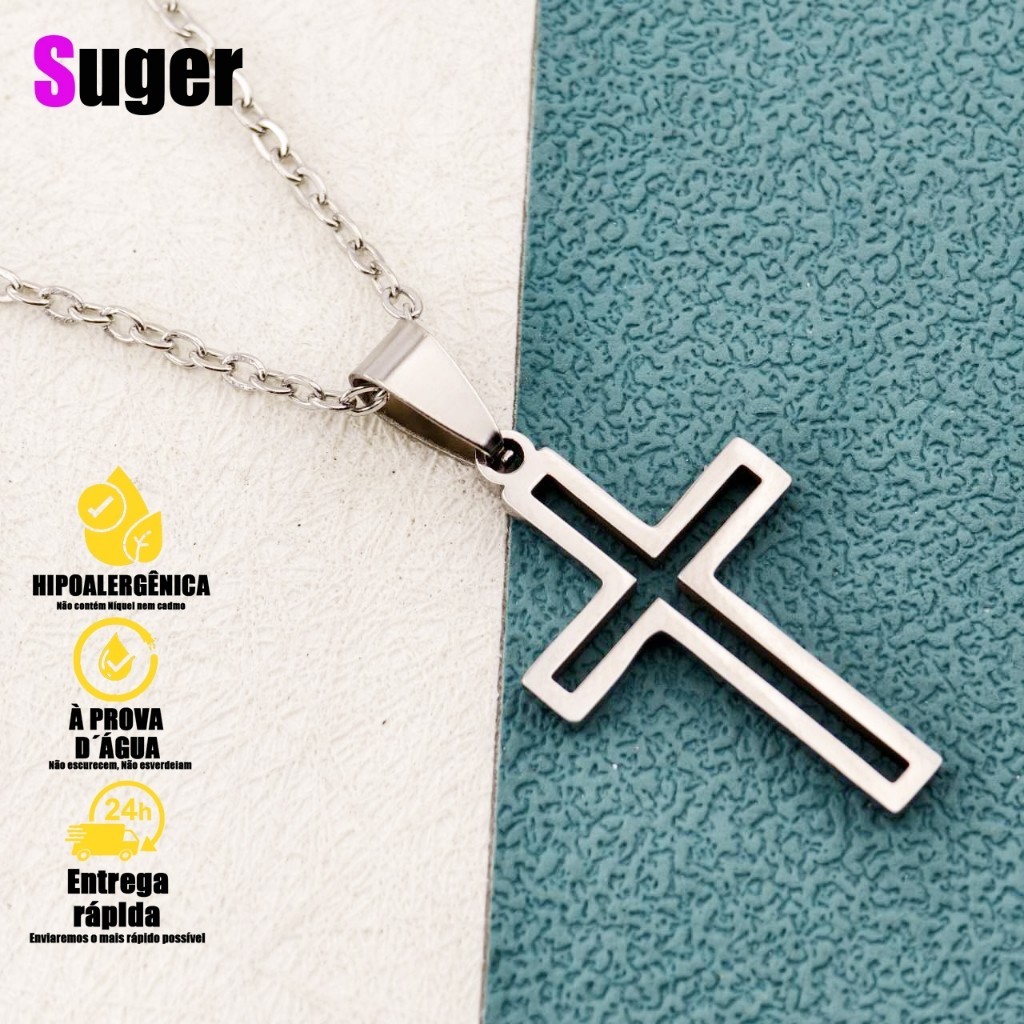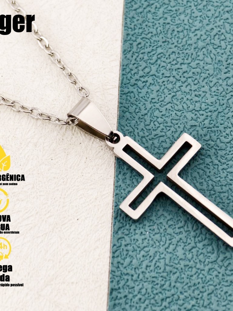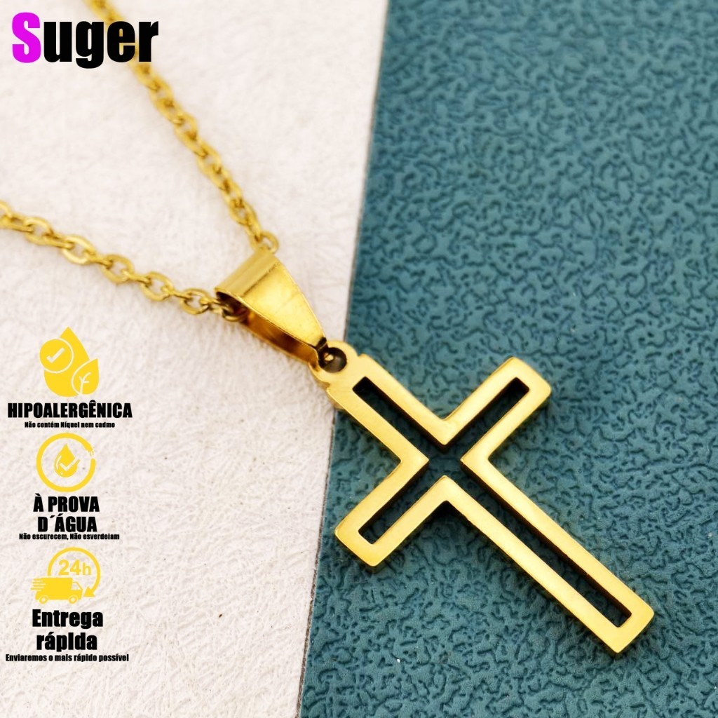 Corrente em Cruz De Aço Inox Vazado Gold com Pingente Unissex em Aço Inoxidável Símbolo Cristão