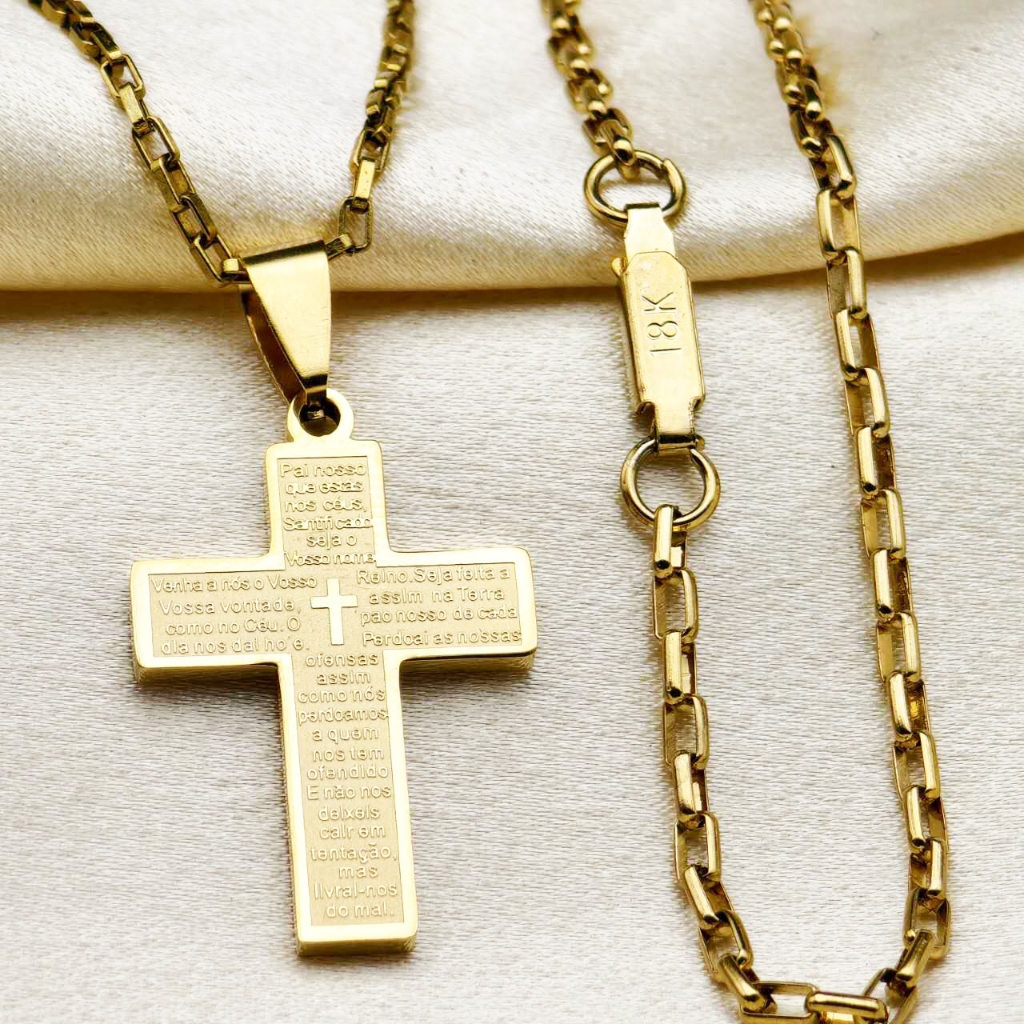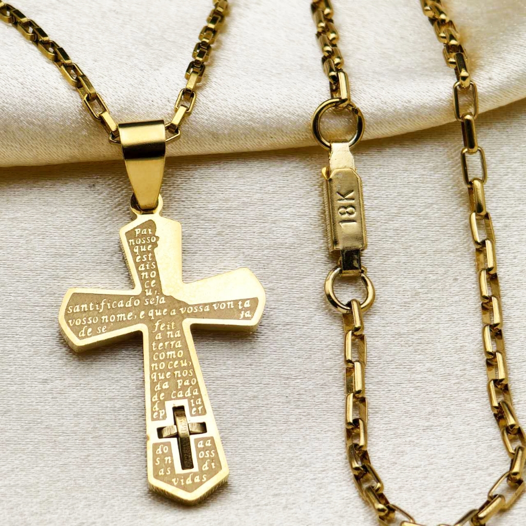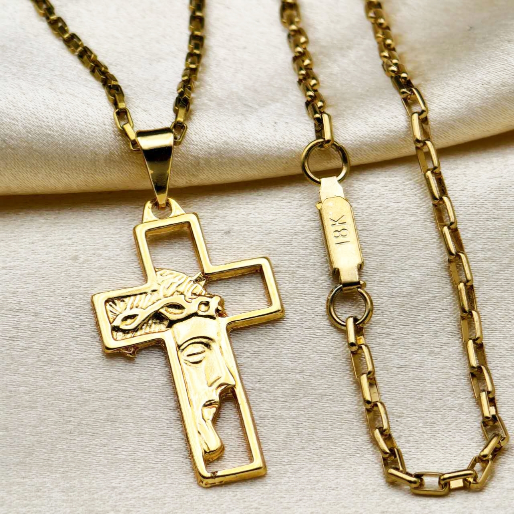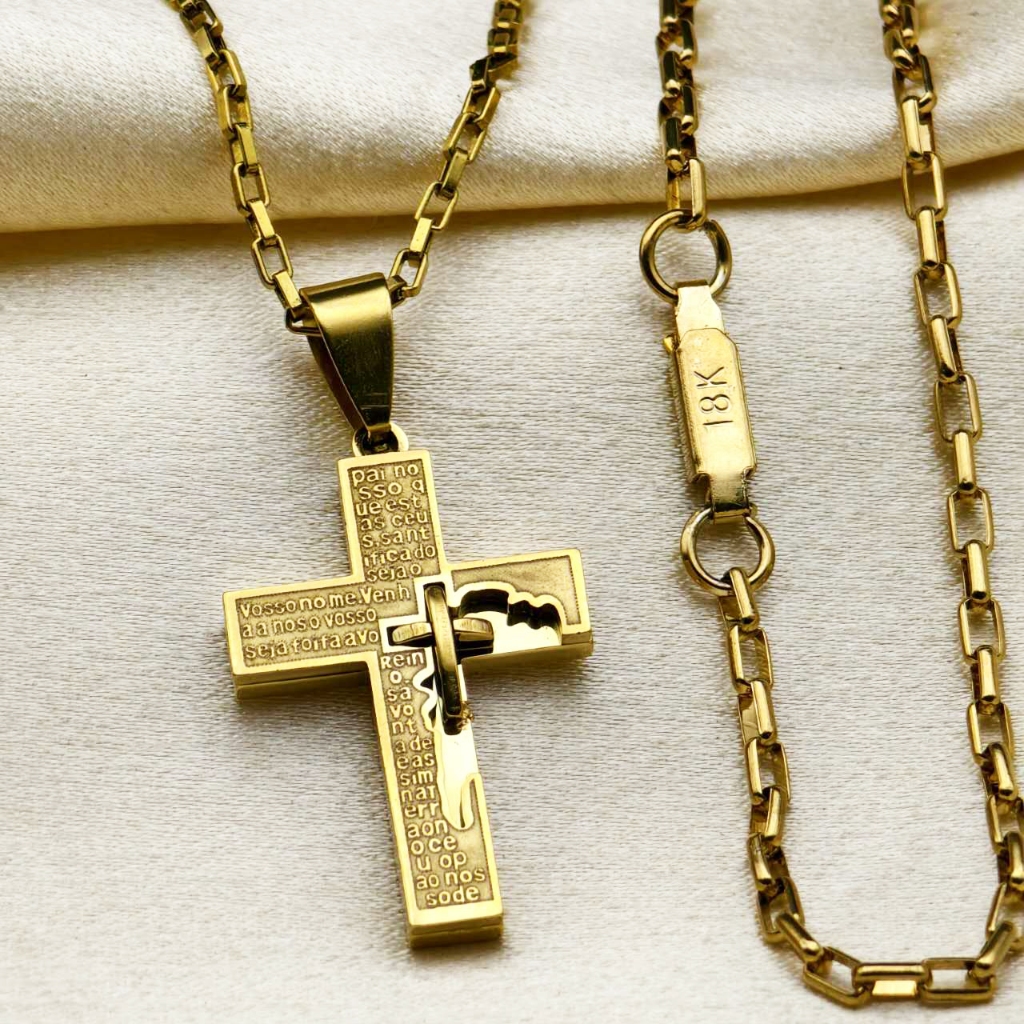 Kit Corrente Pulseira e Pingente homens mulheres Cruz Banhado a Ouro 18K com Detalhe em Moeda Antiga