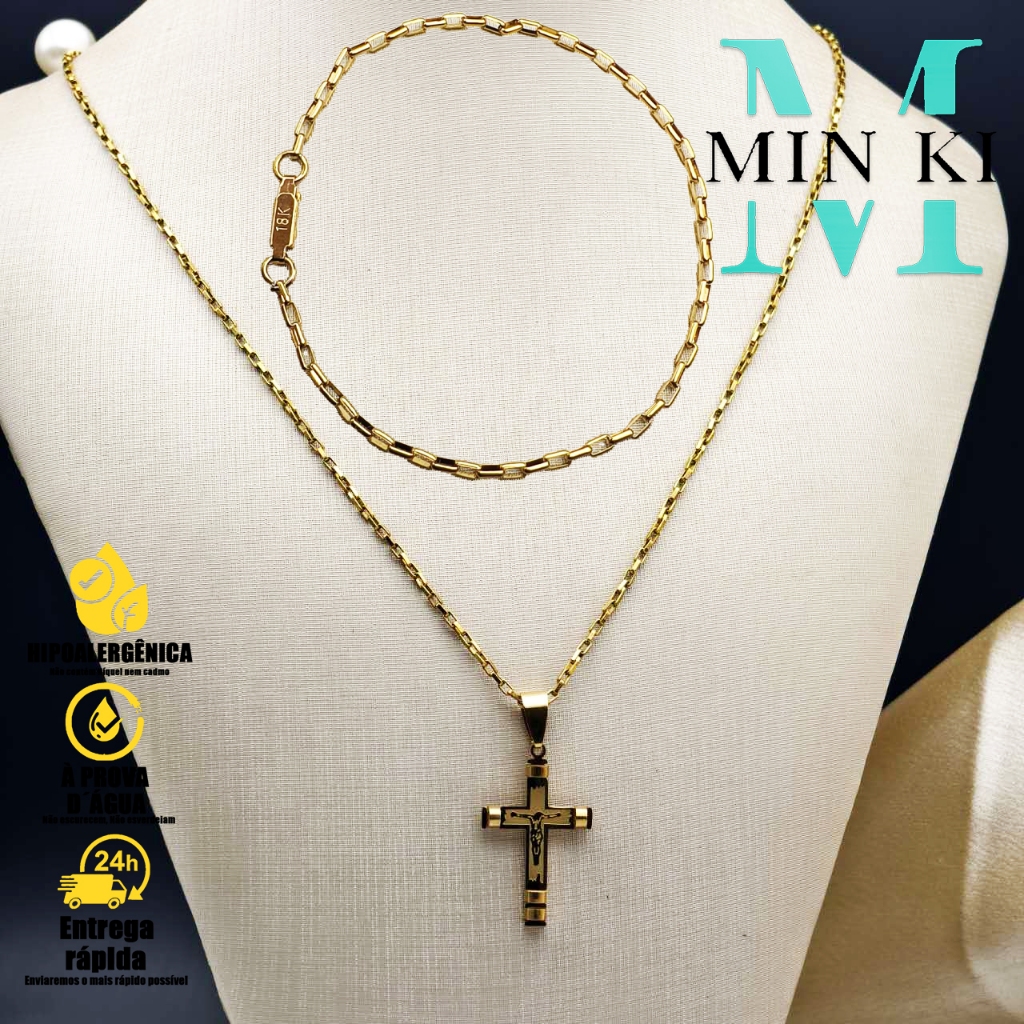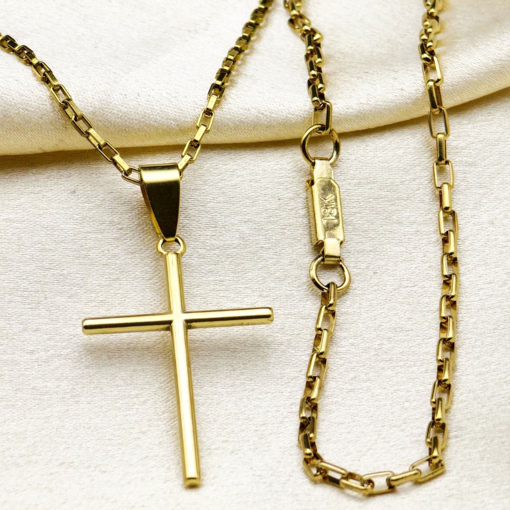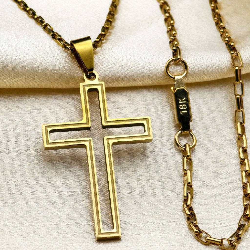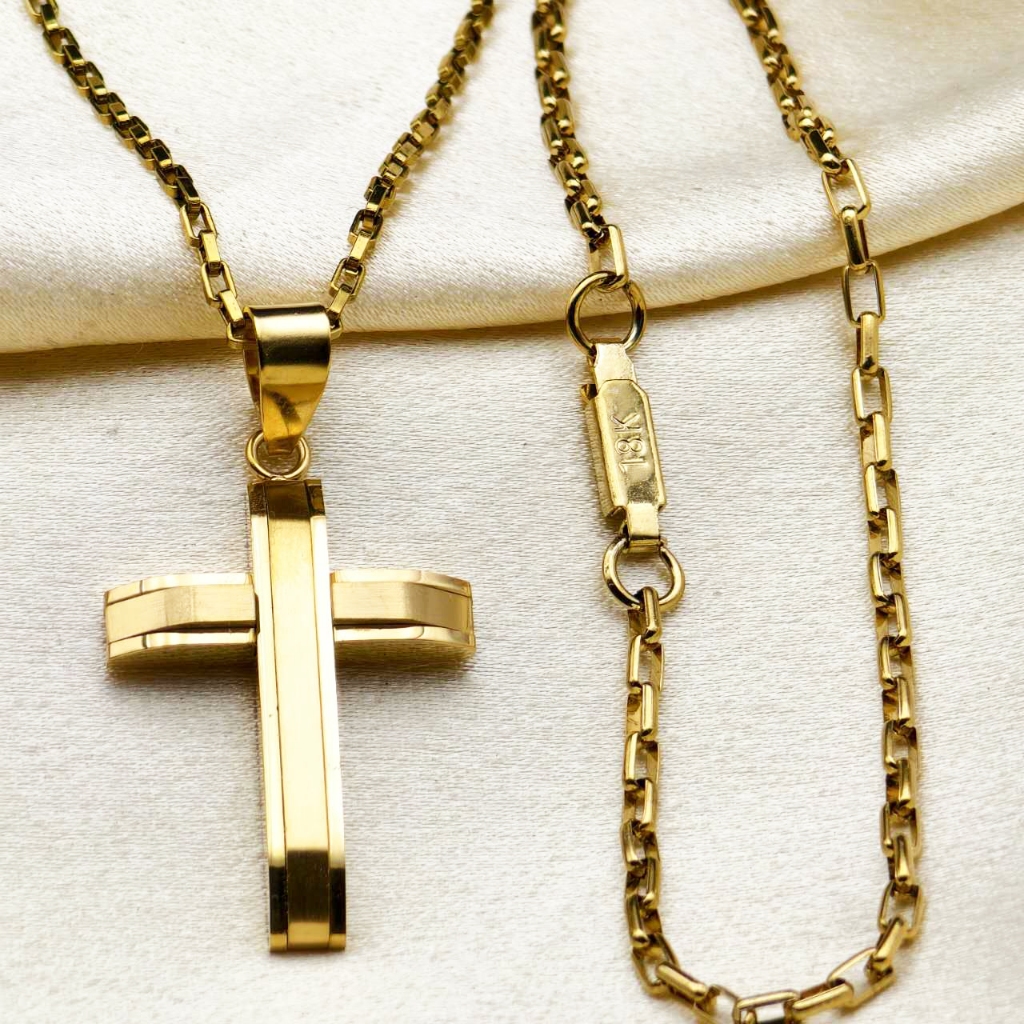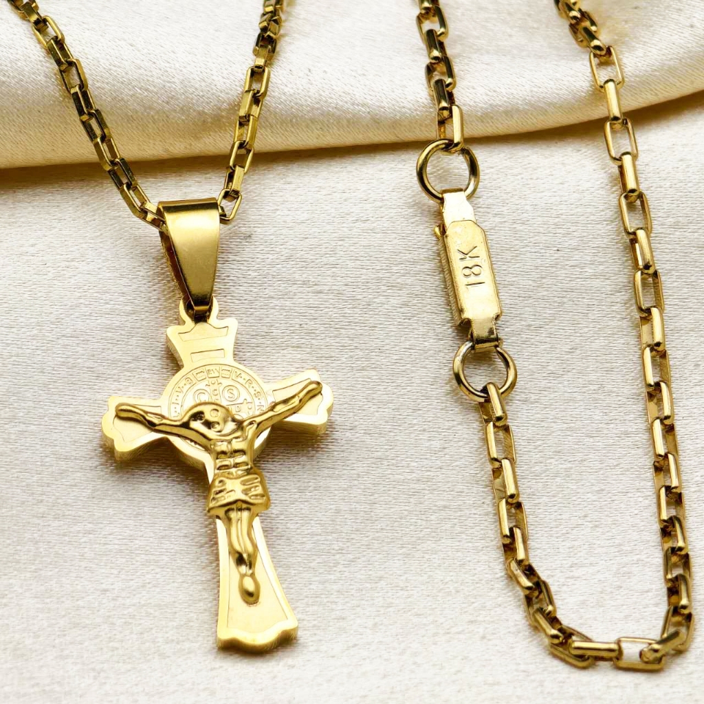Kit Corrente Pulseira e Pingente homens mulheres Cruz Banhado a Ouro 18K com Detalhe em Moeda Antiga