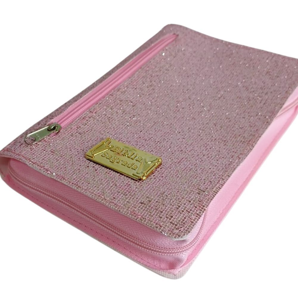 Capa para Bíblia Média com Zíper e Bolso Externo Porta Celular com Glitter Brilhoso
