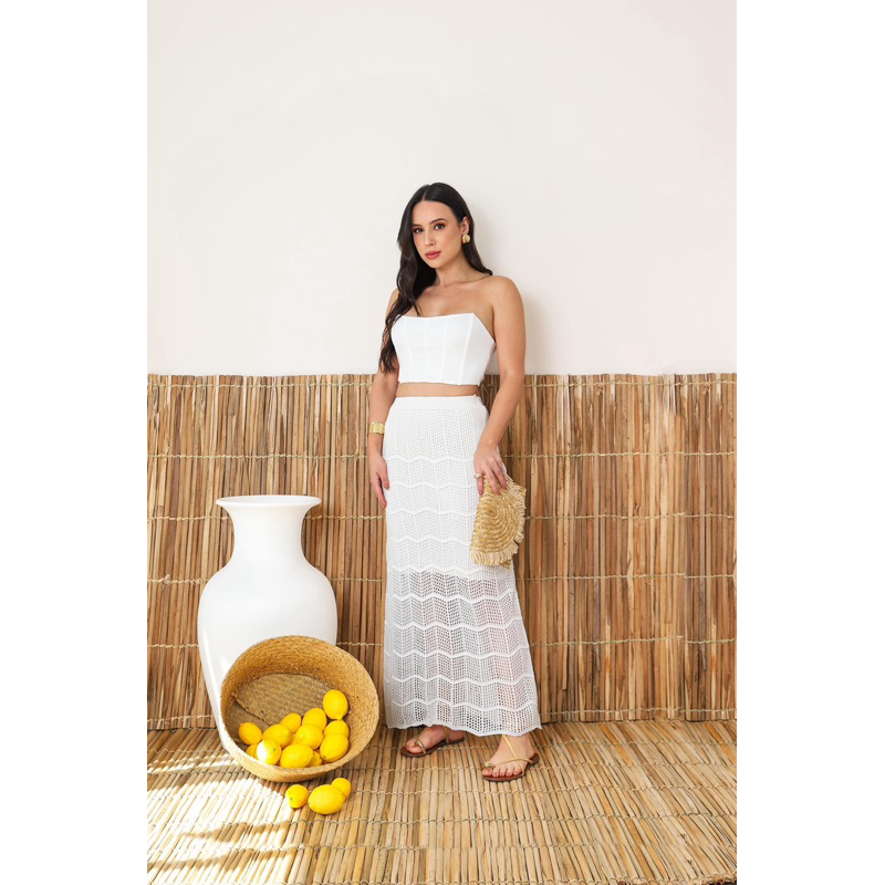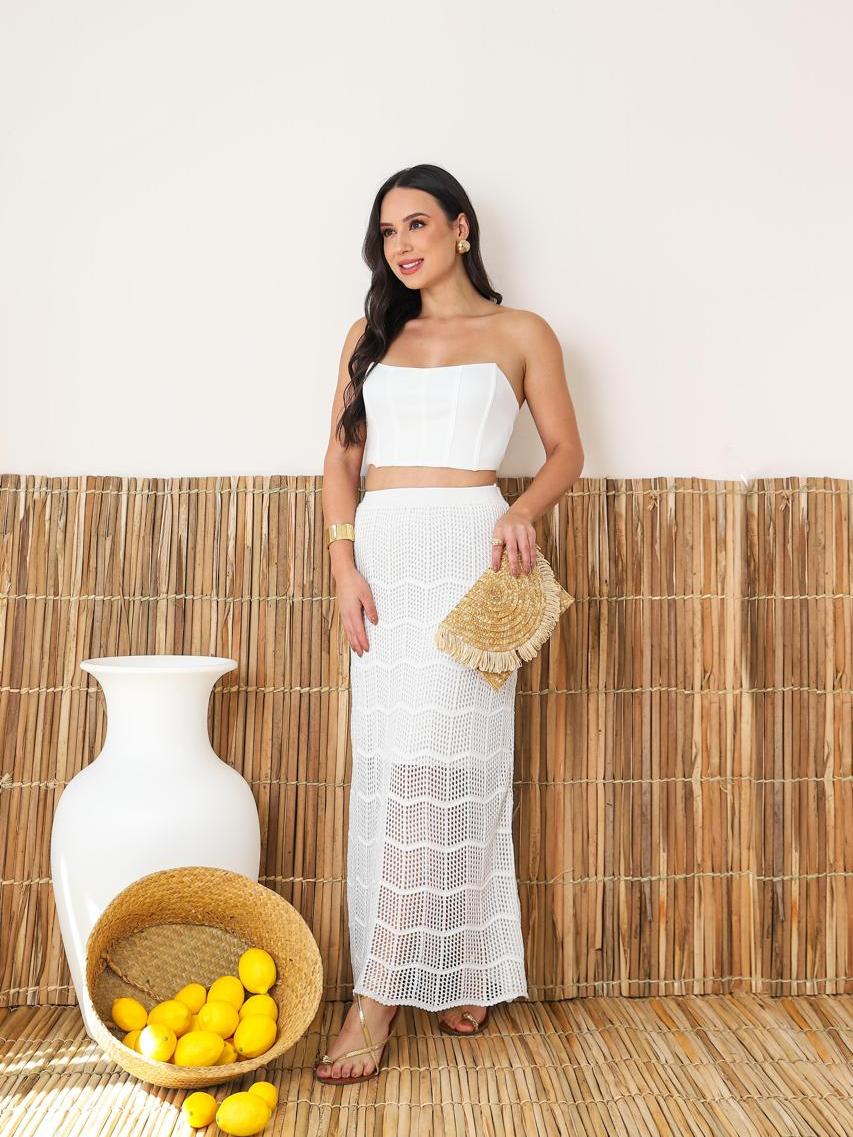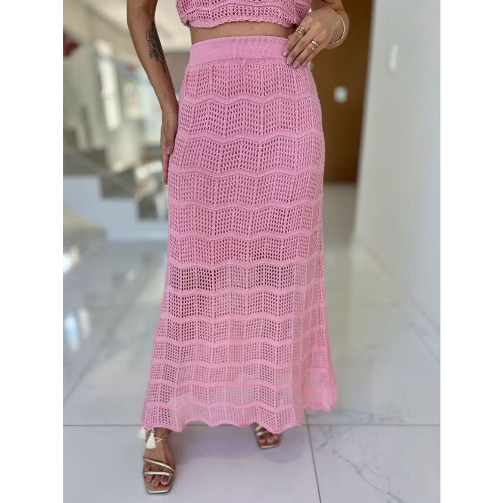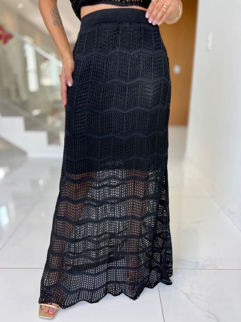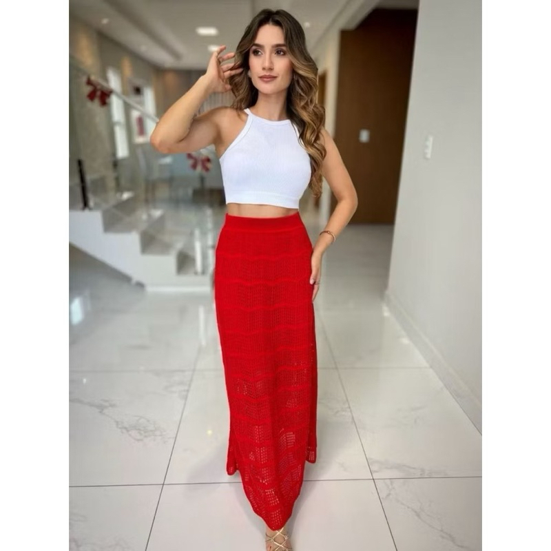 Saia Longa Tricot Rendada Ponto Crochê Moda Verão PraiaTendência Midi Luxo Tricô Look Natal Ano Novo