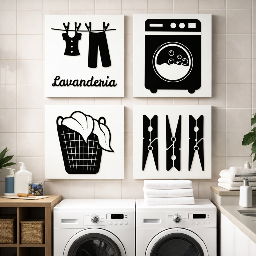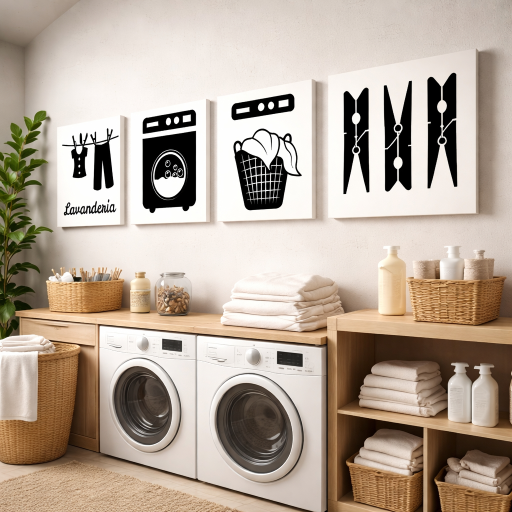 Kit 4 Quadros Decorativos Lavanderia Área de Serviço Casa Quarto Sala Placas Plaquinhas