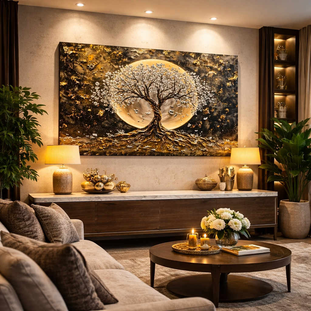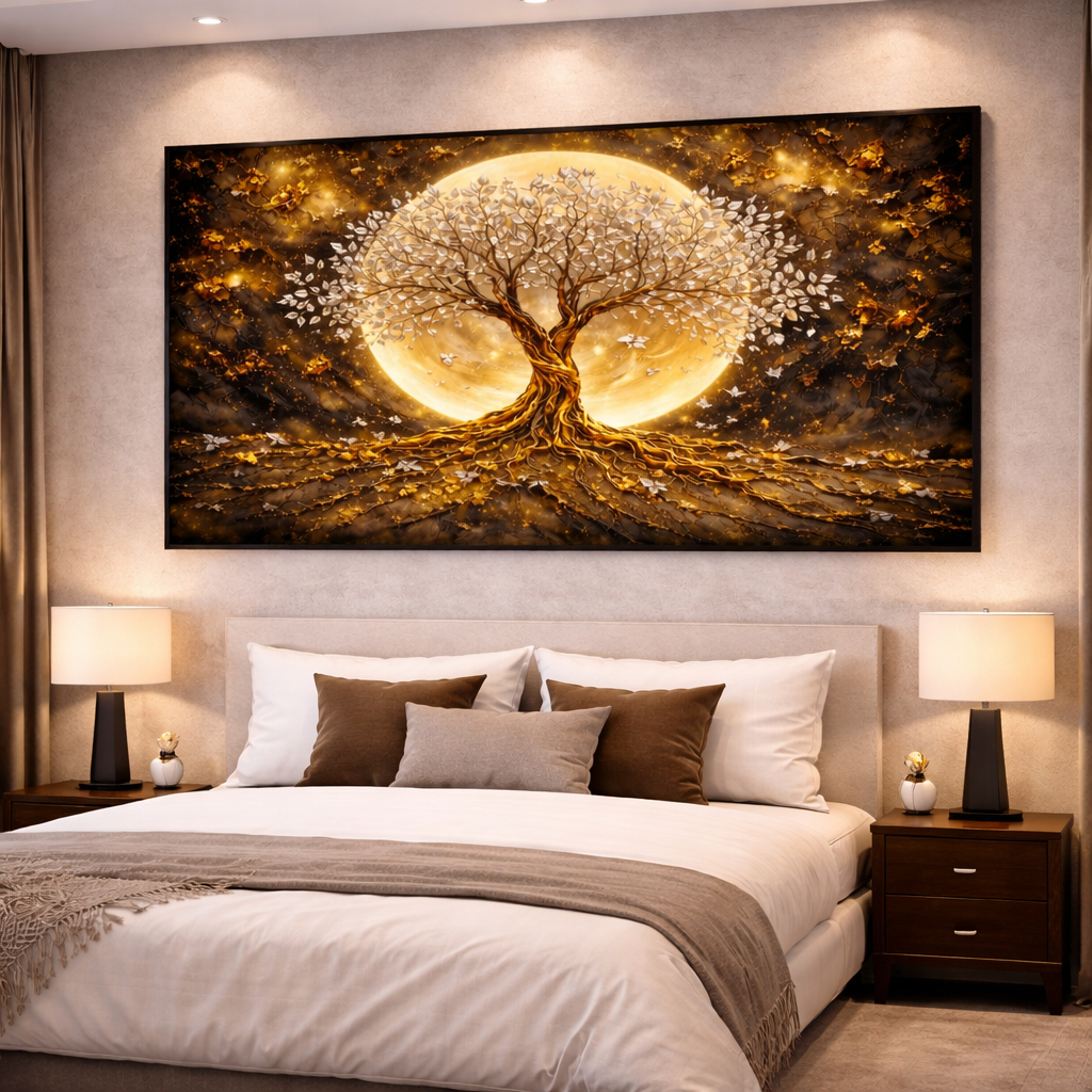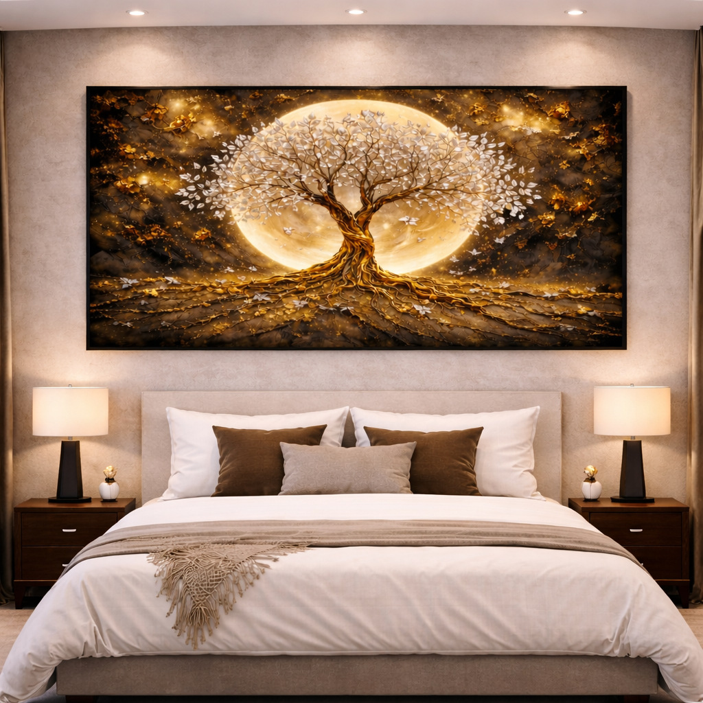 Quadro Decorativo Lua Dourada e Árvore Branca | Paisagem Moderna para Sala e Quarto