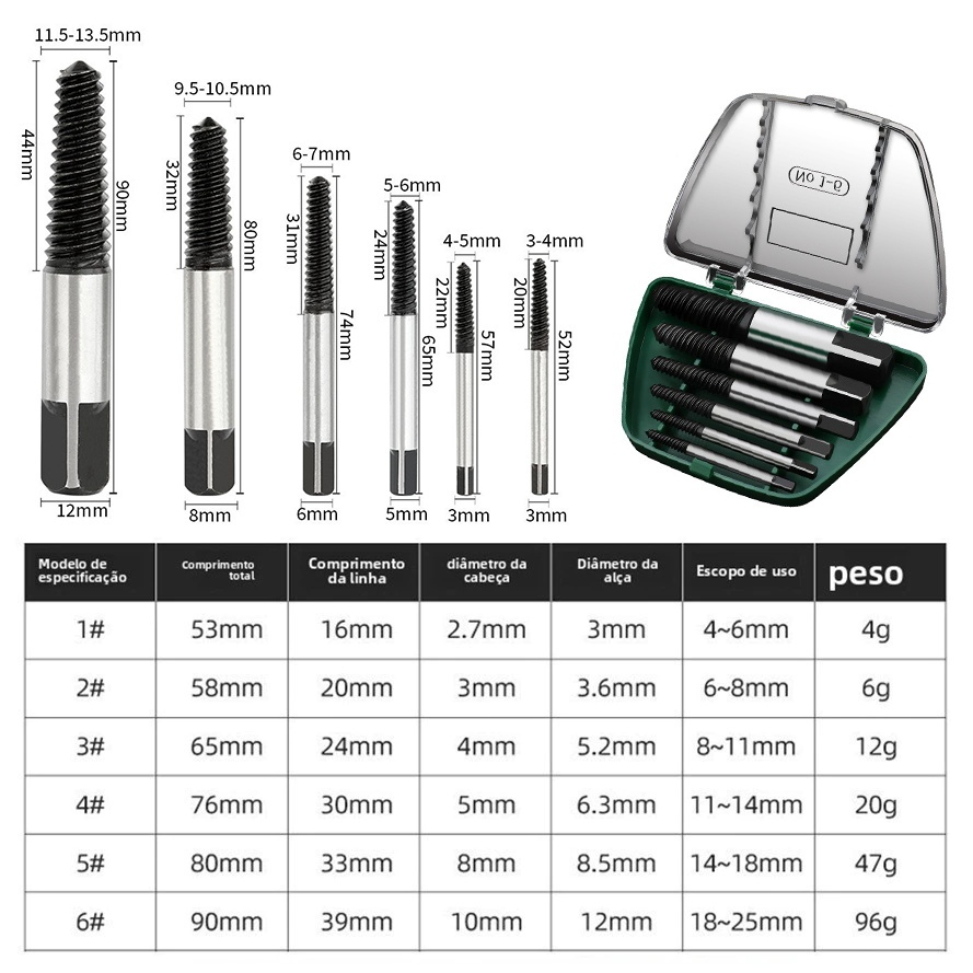 Jogo de Extratores de Parafusos 5 Peças Remover Parafuso Quebrado Espanado