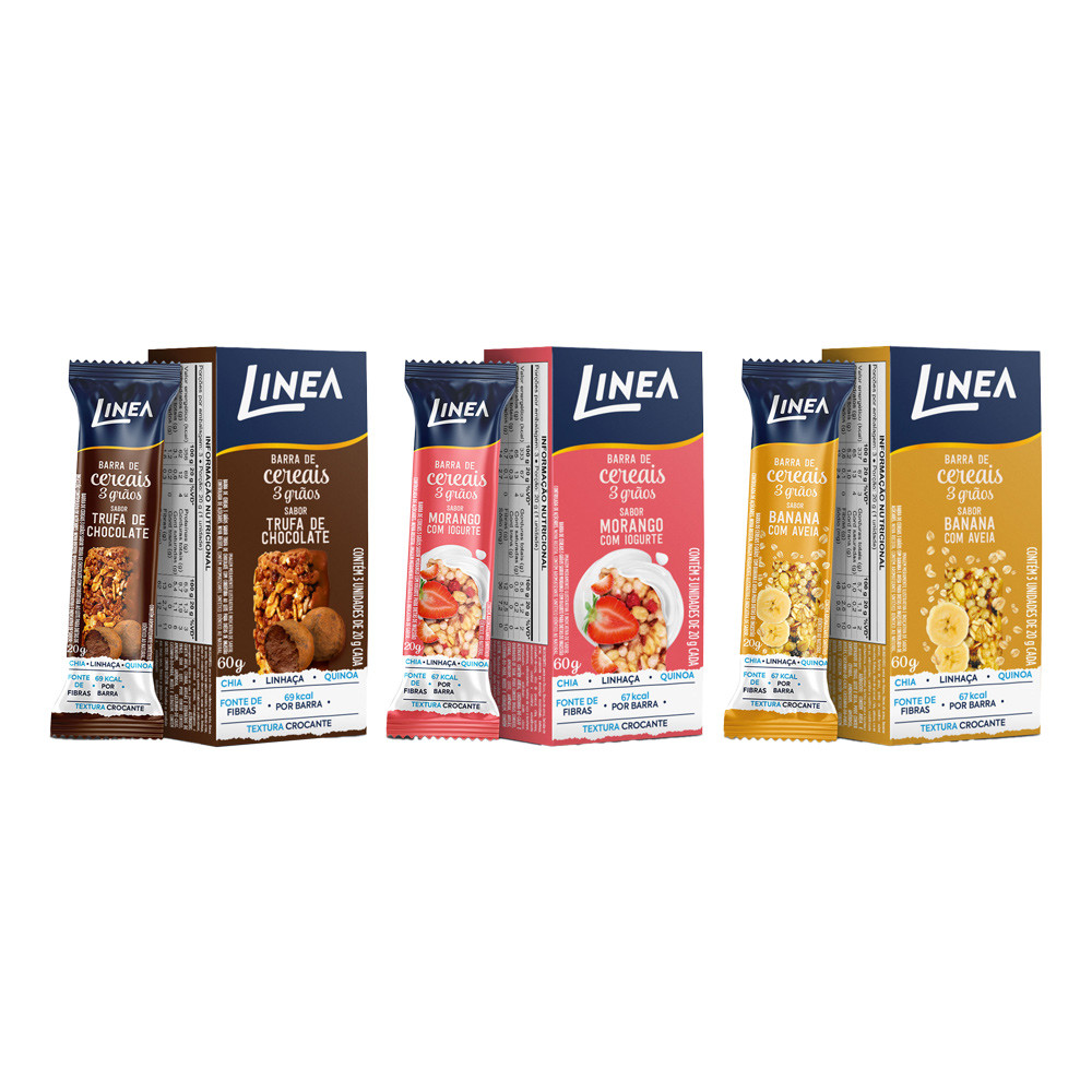 Kit 3 Caixas de Barra de Cereal 3 Grãos Integrais Linea Sabor Banana com Aveia, Morango com Iogurte e Trufa de Chocolate