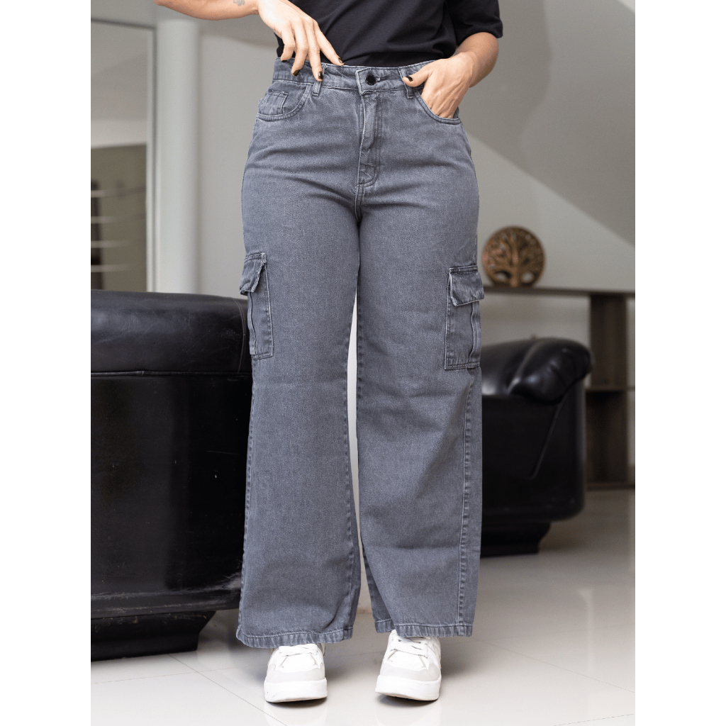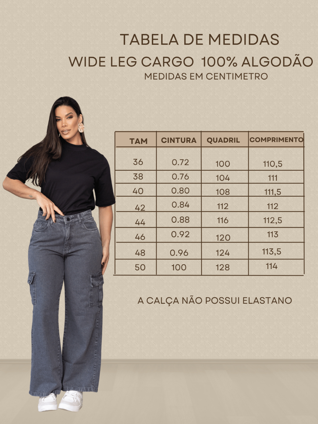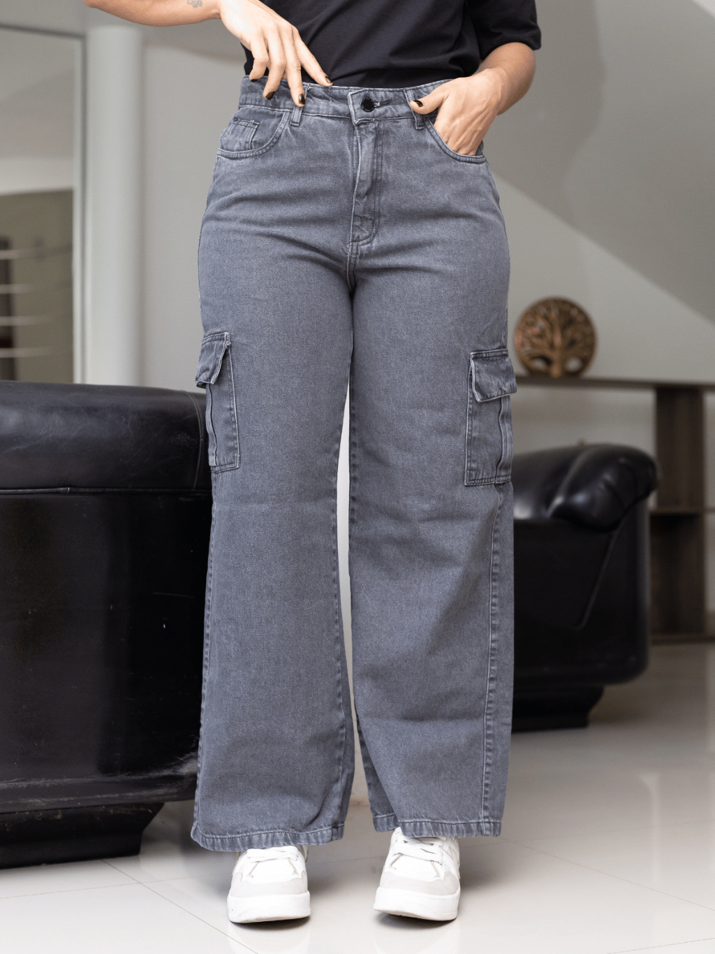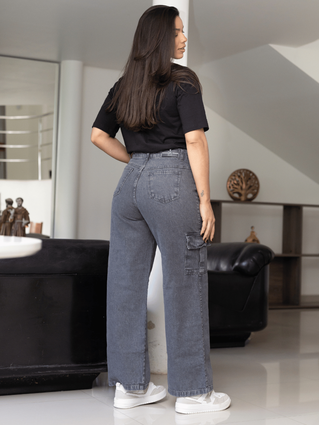 Calça Wide Leg Cargo Grafite Barra Larga 100% algodão