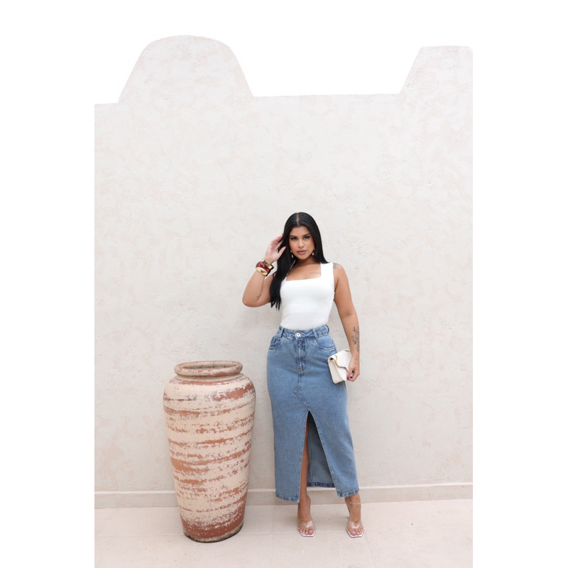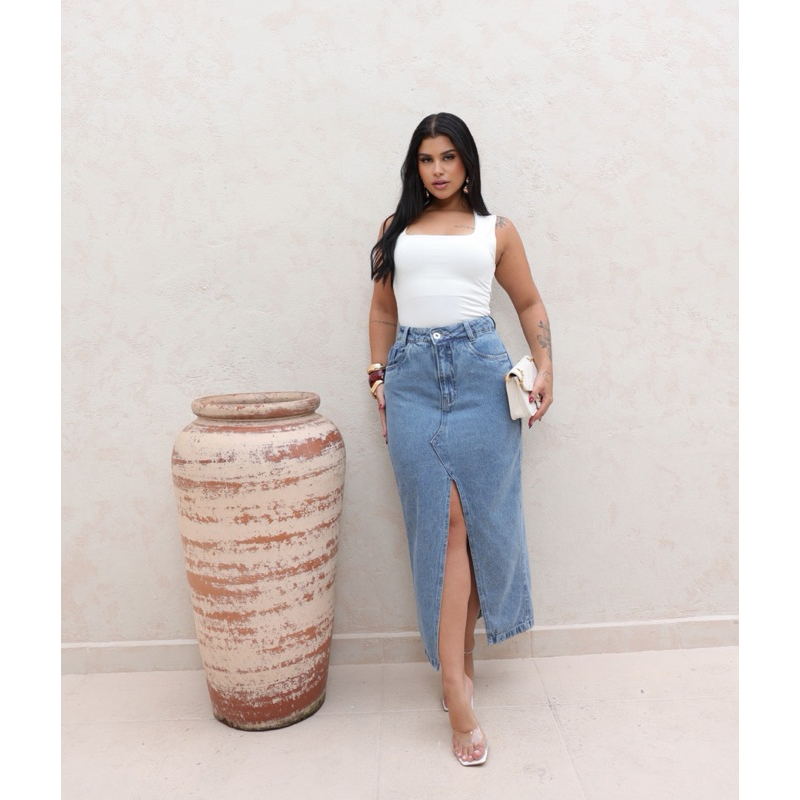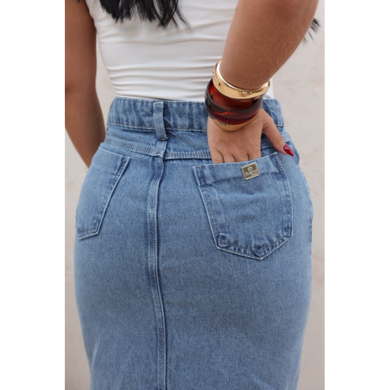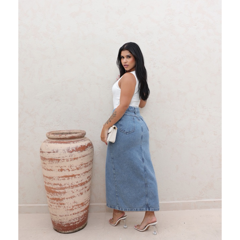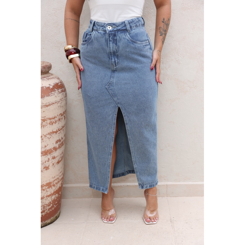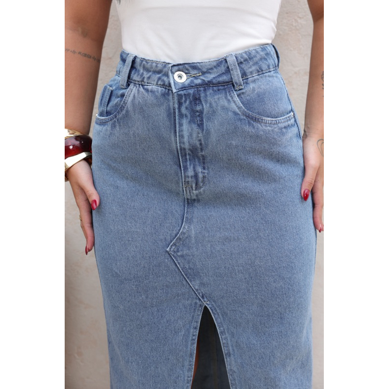 Saia Midi Longa Jeans Abertura Na Frente Cintura Alta