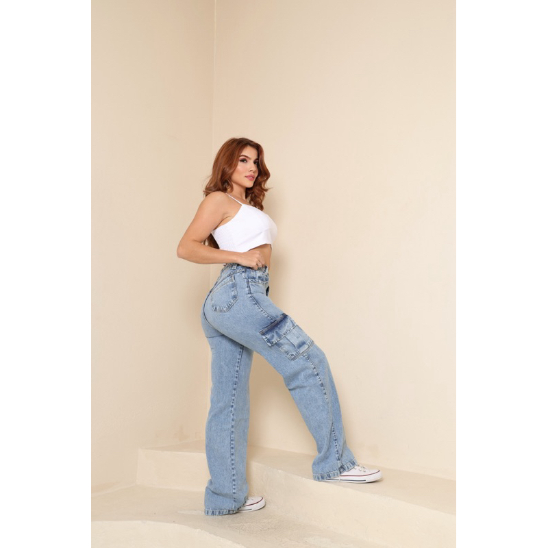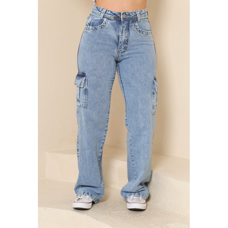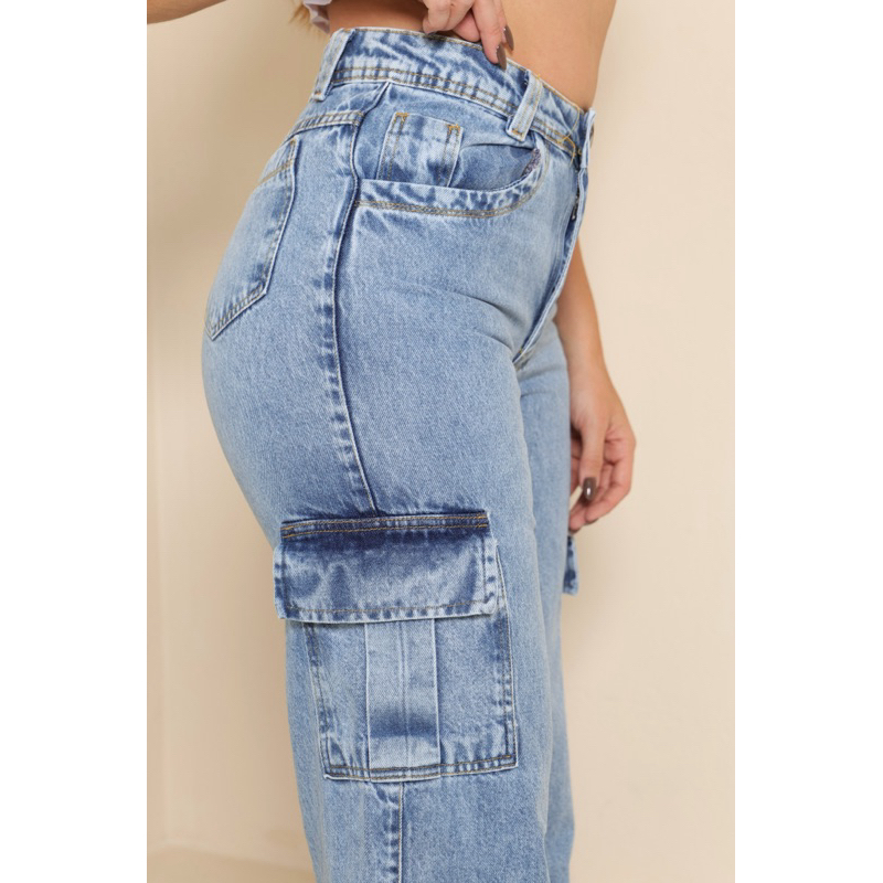 Calça Jeans Wide Leg Cargo Feminina Com Bolsos Na Lateral