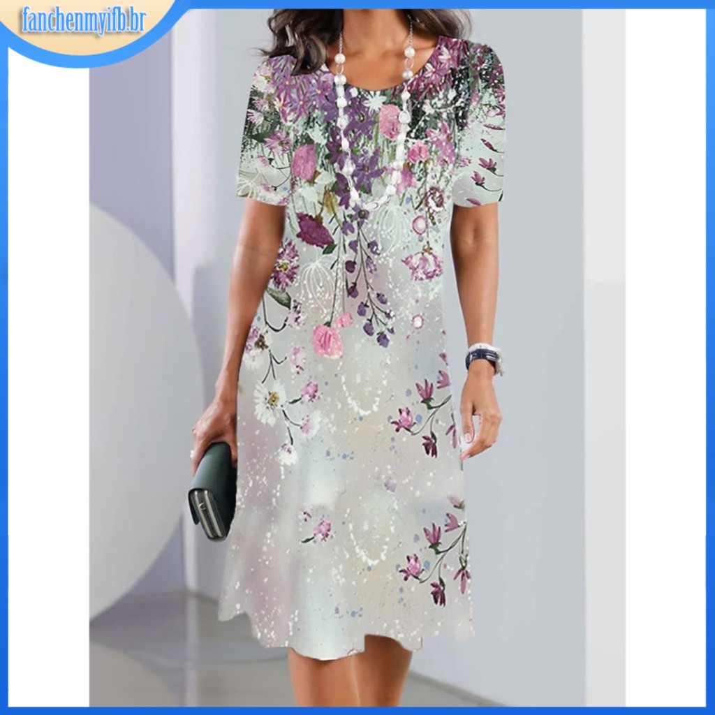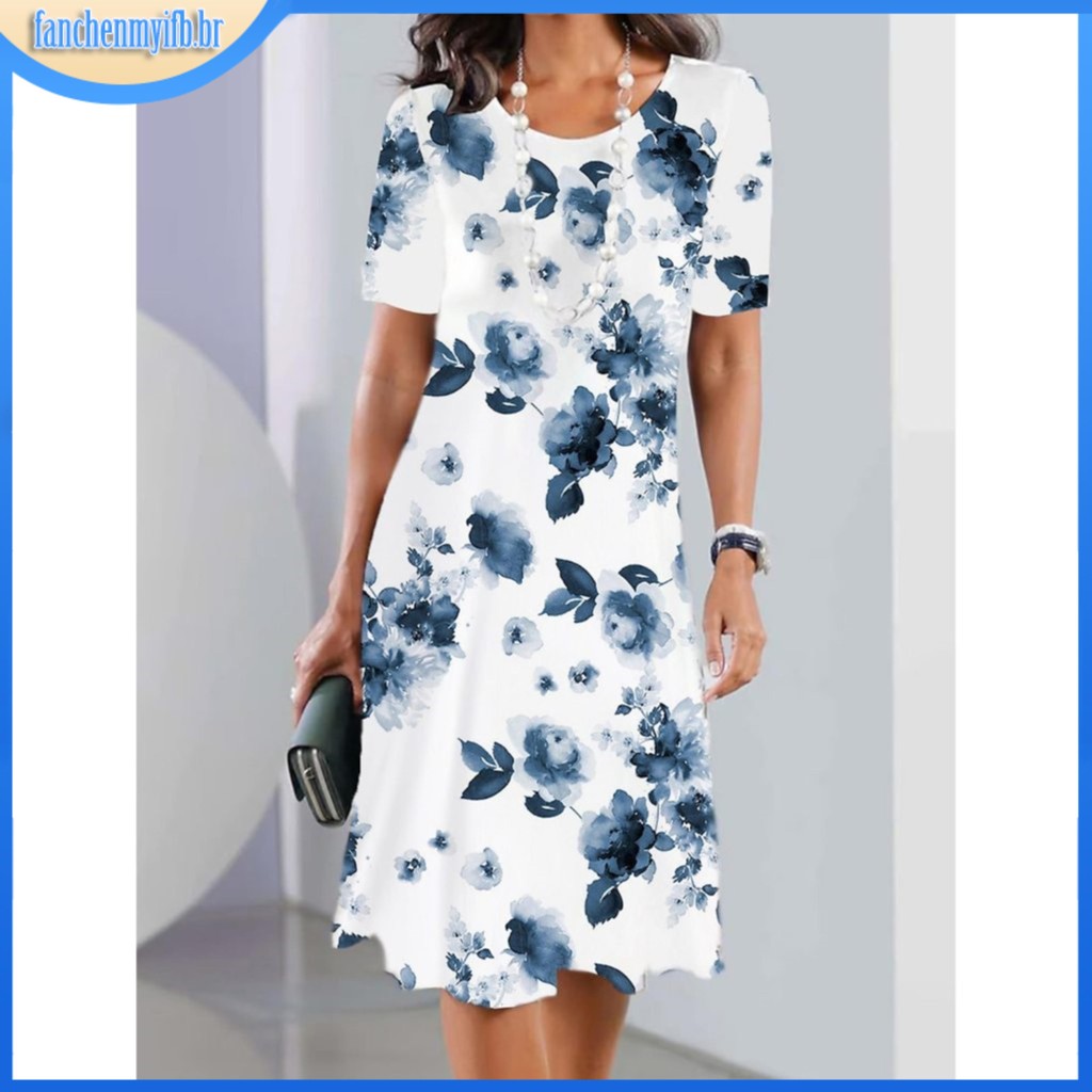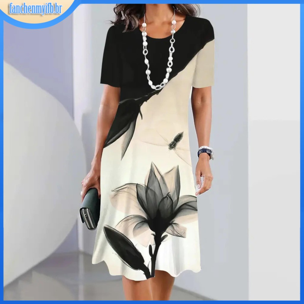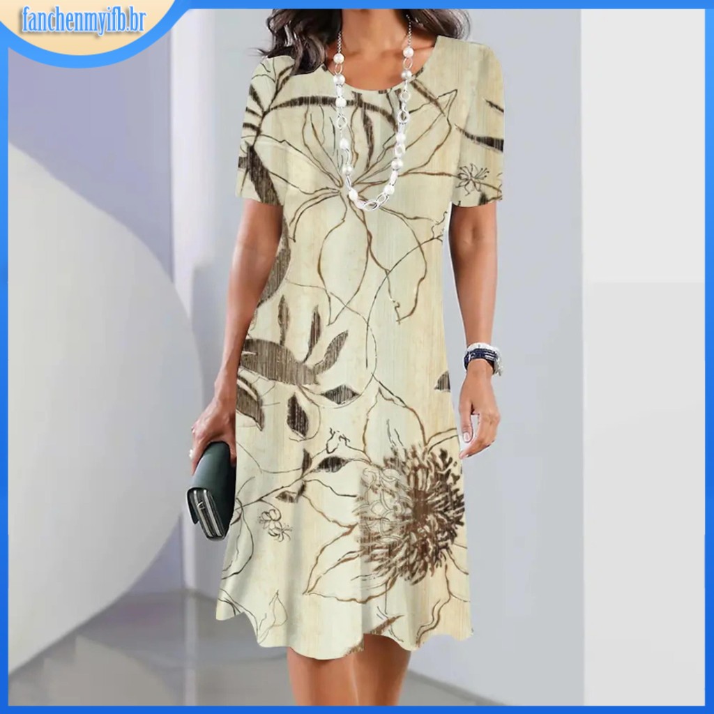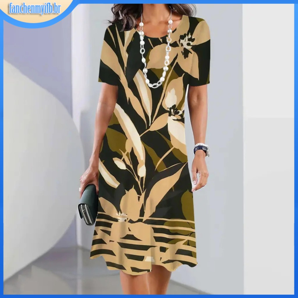 Vestido de verão de manga curta Impresso Boêmio de Praia para Senhoras de Meio Comprimento