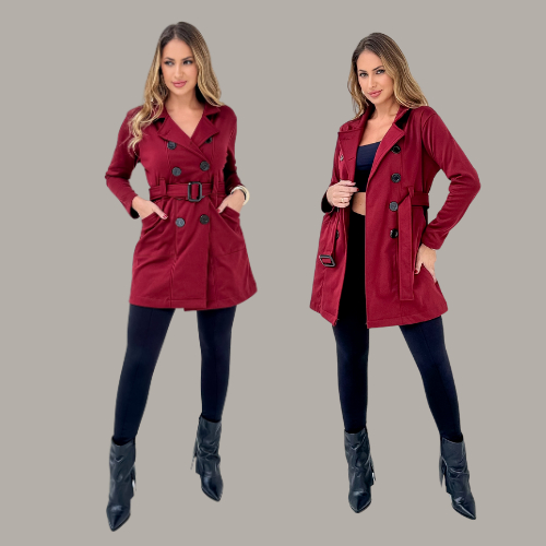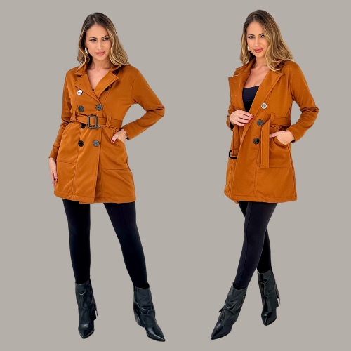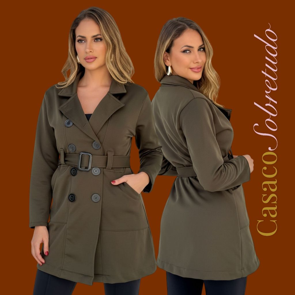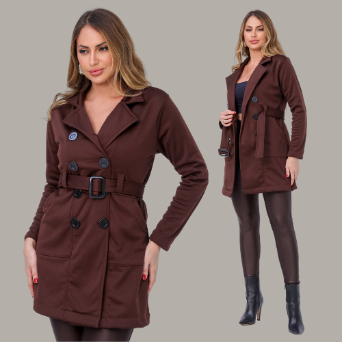 Casaco Sobretudo Feminino (M-G-GG) em Moletom Poliéster Flanelado Quentinho com Bolso, Fechamento de Botões e Cinto