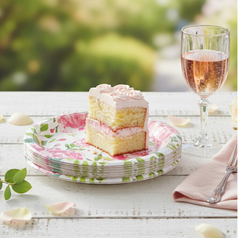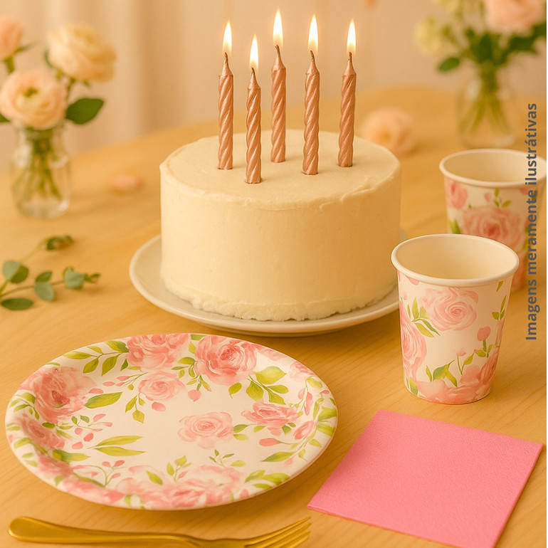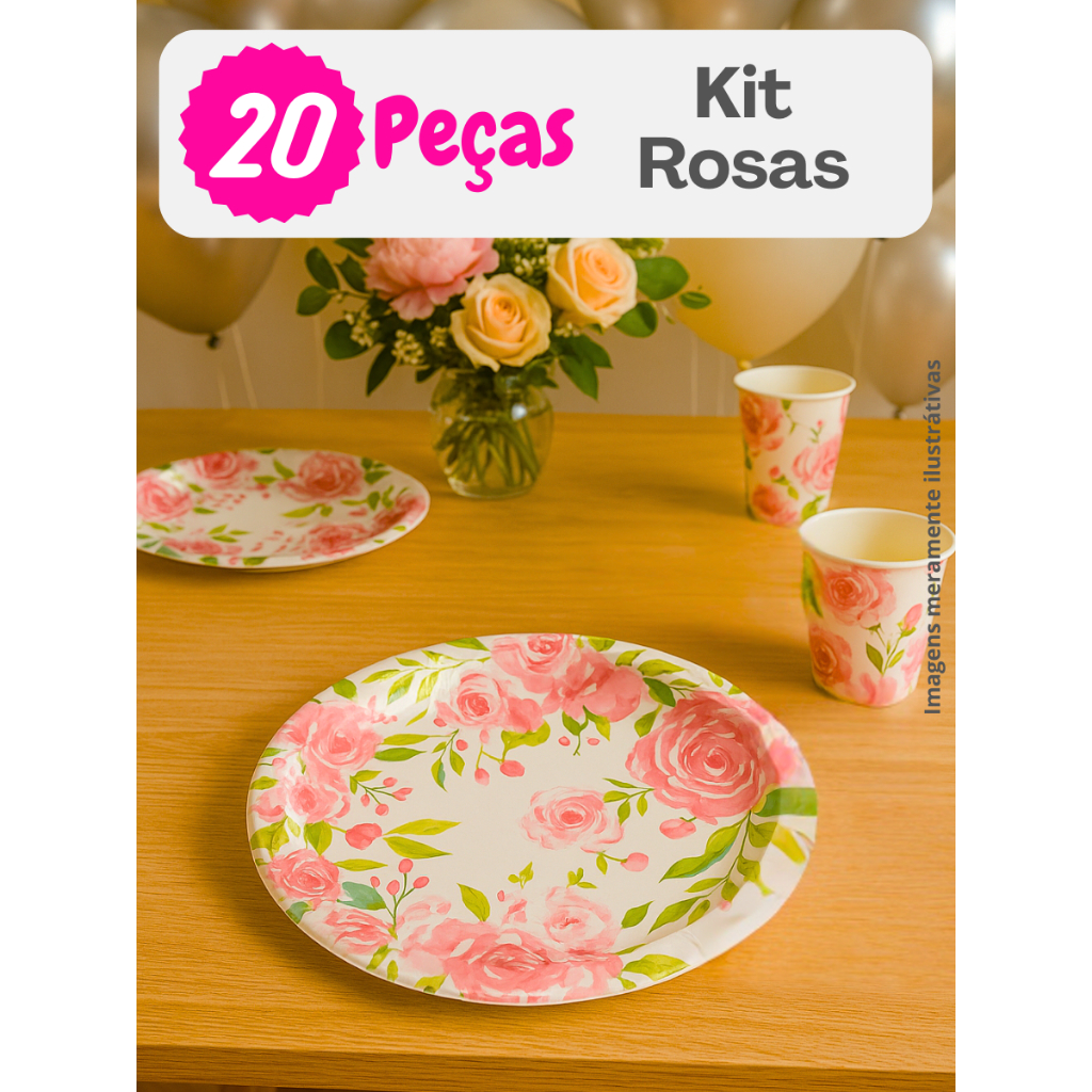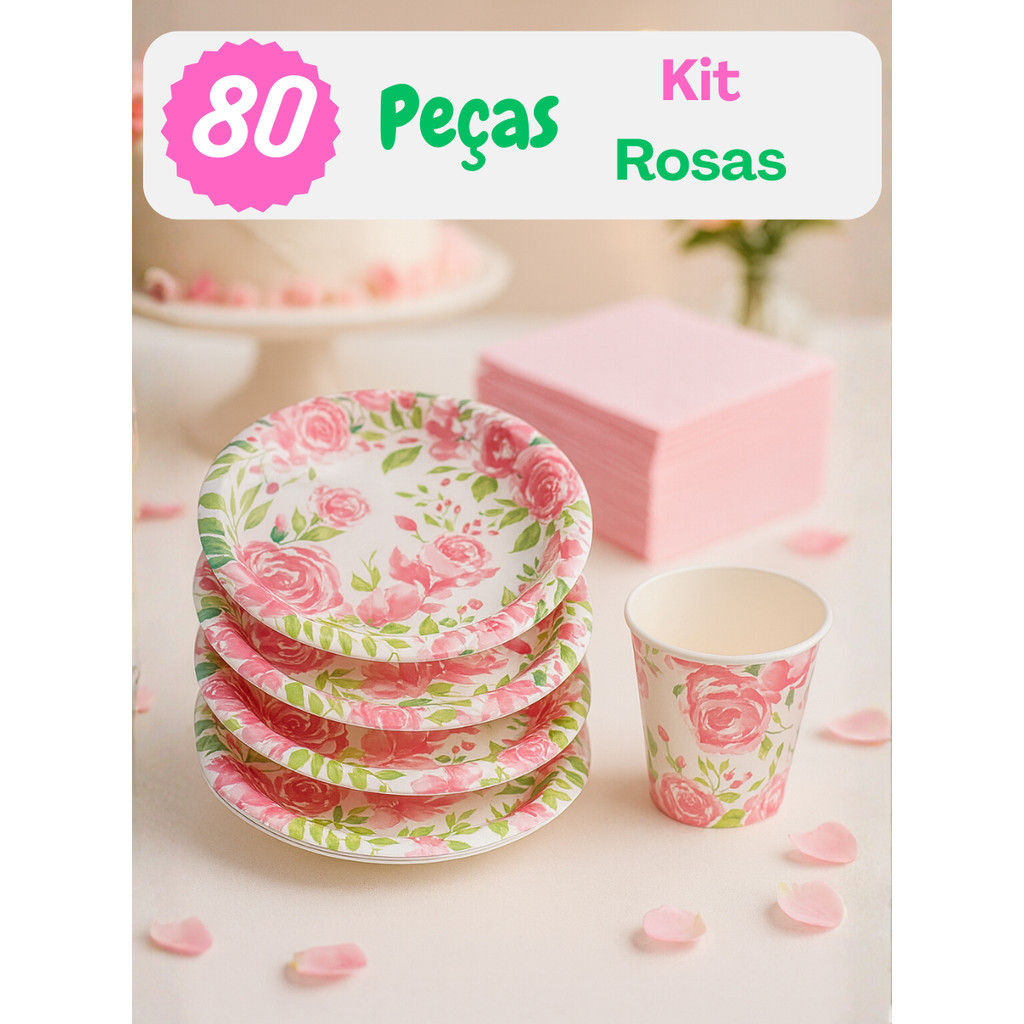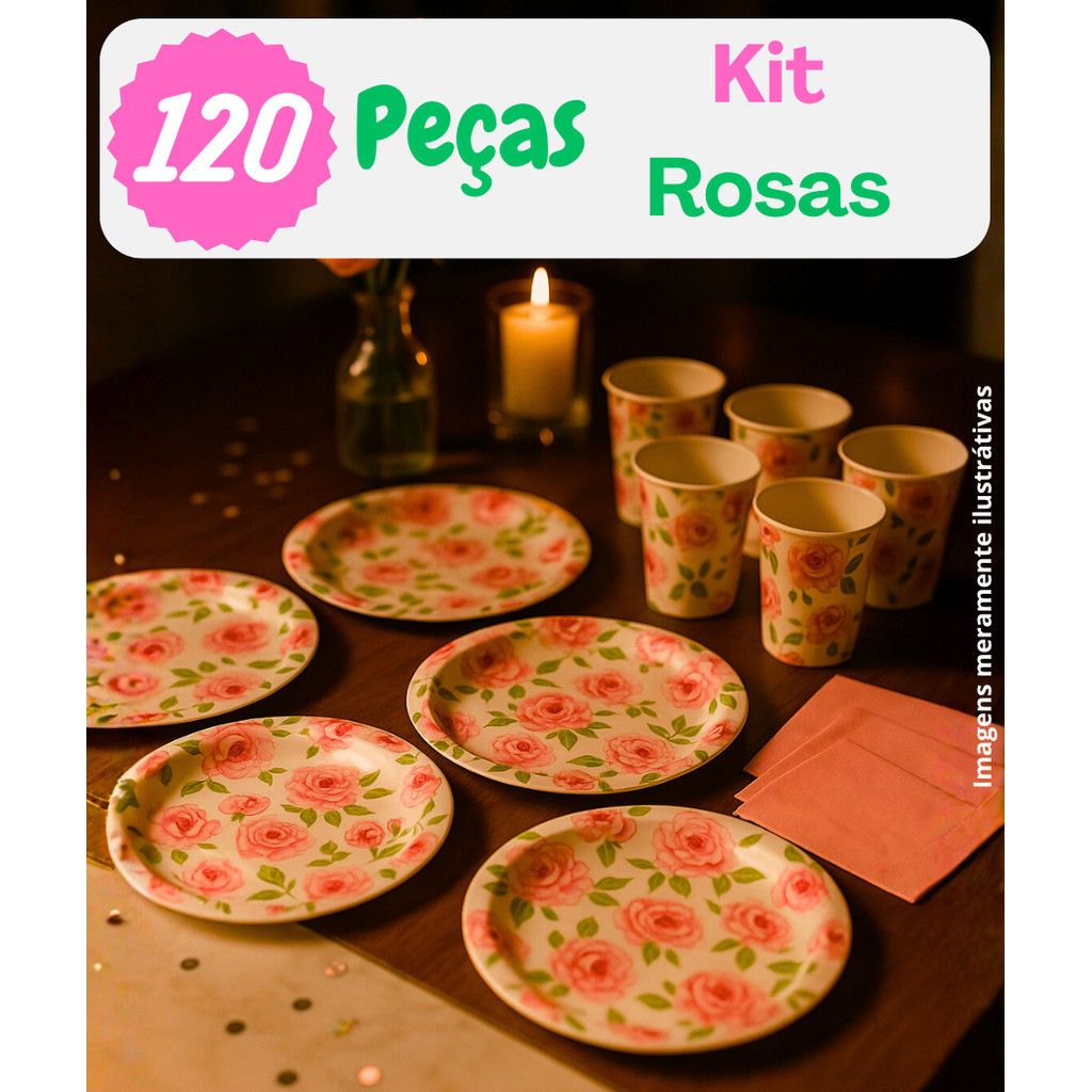 Kit Festa 20/40/80/120 Itens Estampa de Rosas, Descartáveis Papel - Prato, Copo e Guardanapo