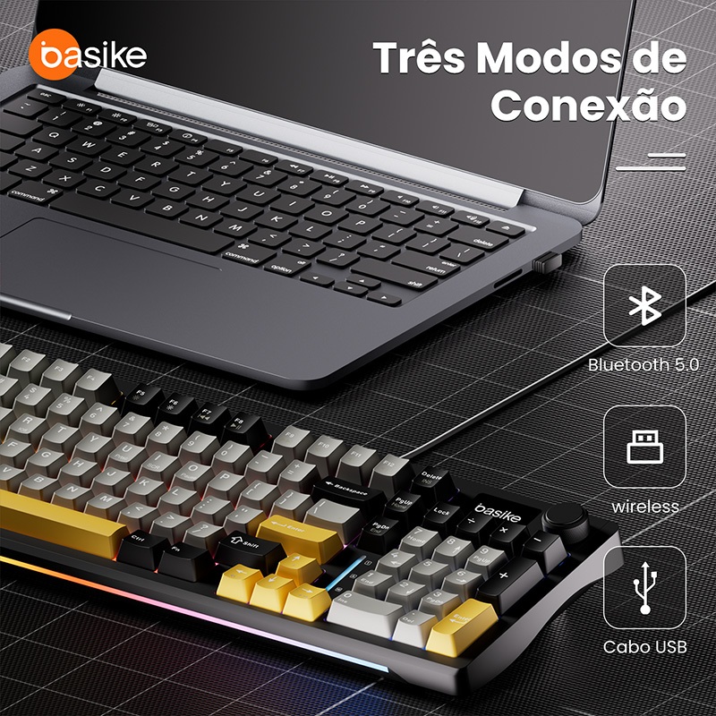 Basike Teclado Mecanico Sem Fio Bluetooth três modos Switch Vermelho troca a quente,Mecanico Gamer Ergonômico RGB,KEY309