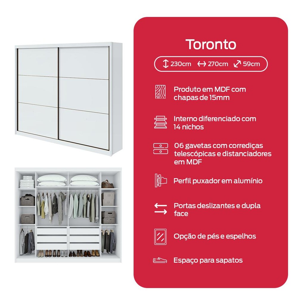 Guarda-Roupa Casal 100% MDF 2 Portas 6 Gav Toronto Com Espelho Branco