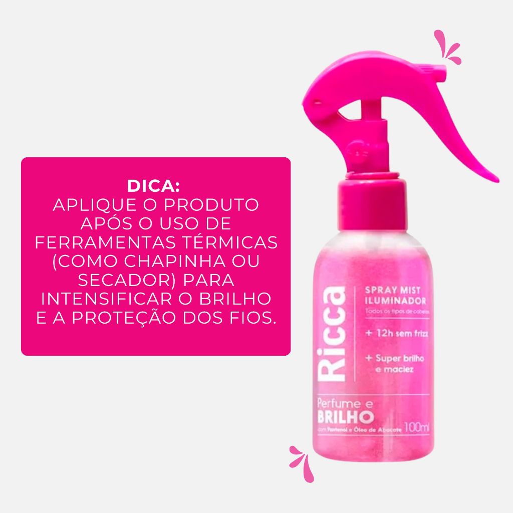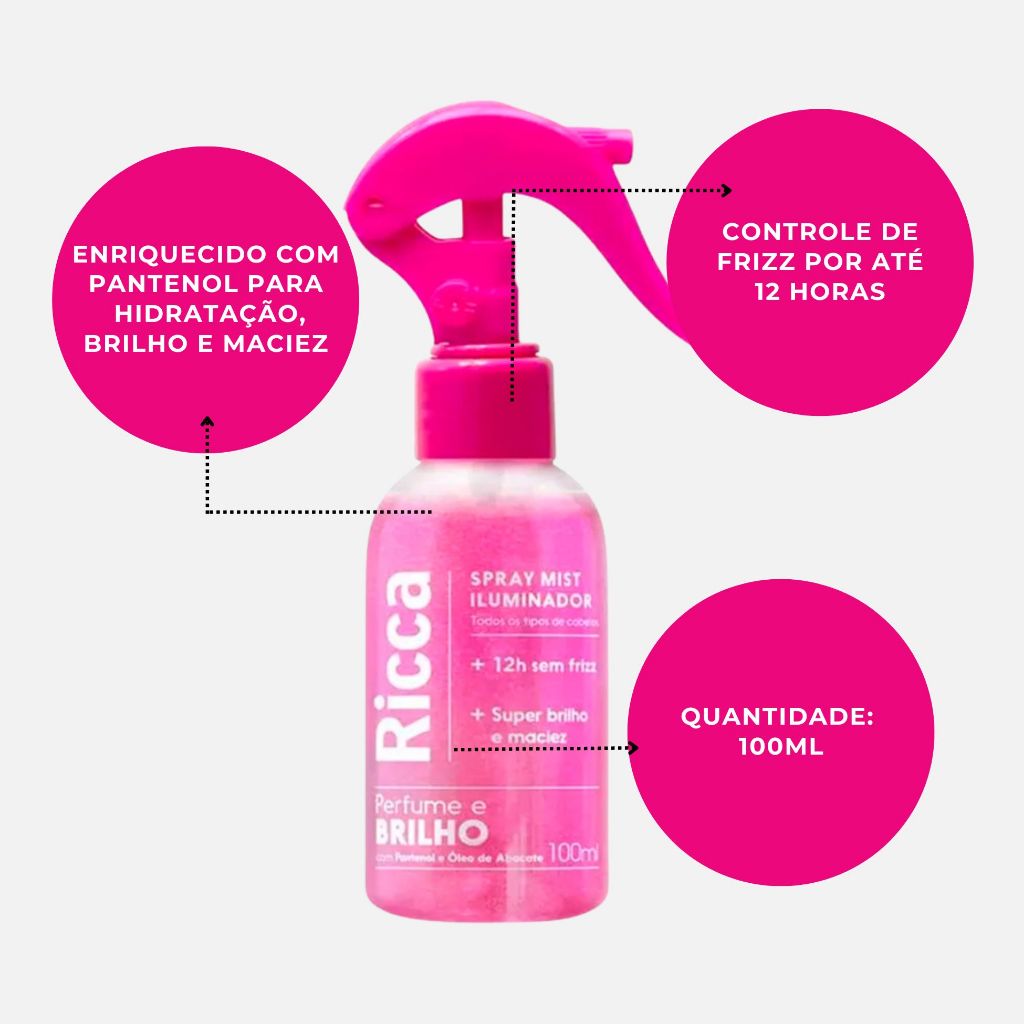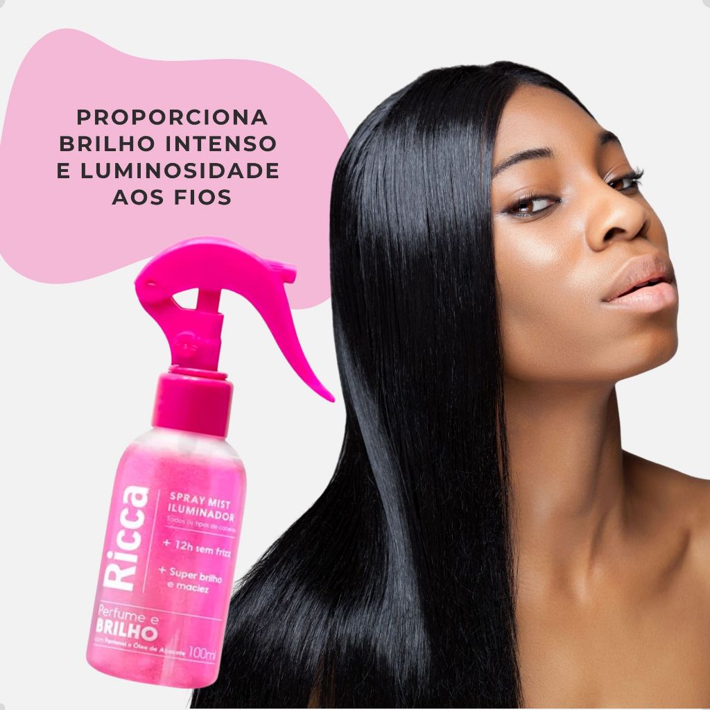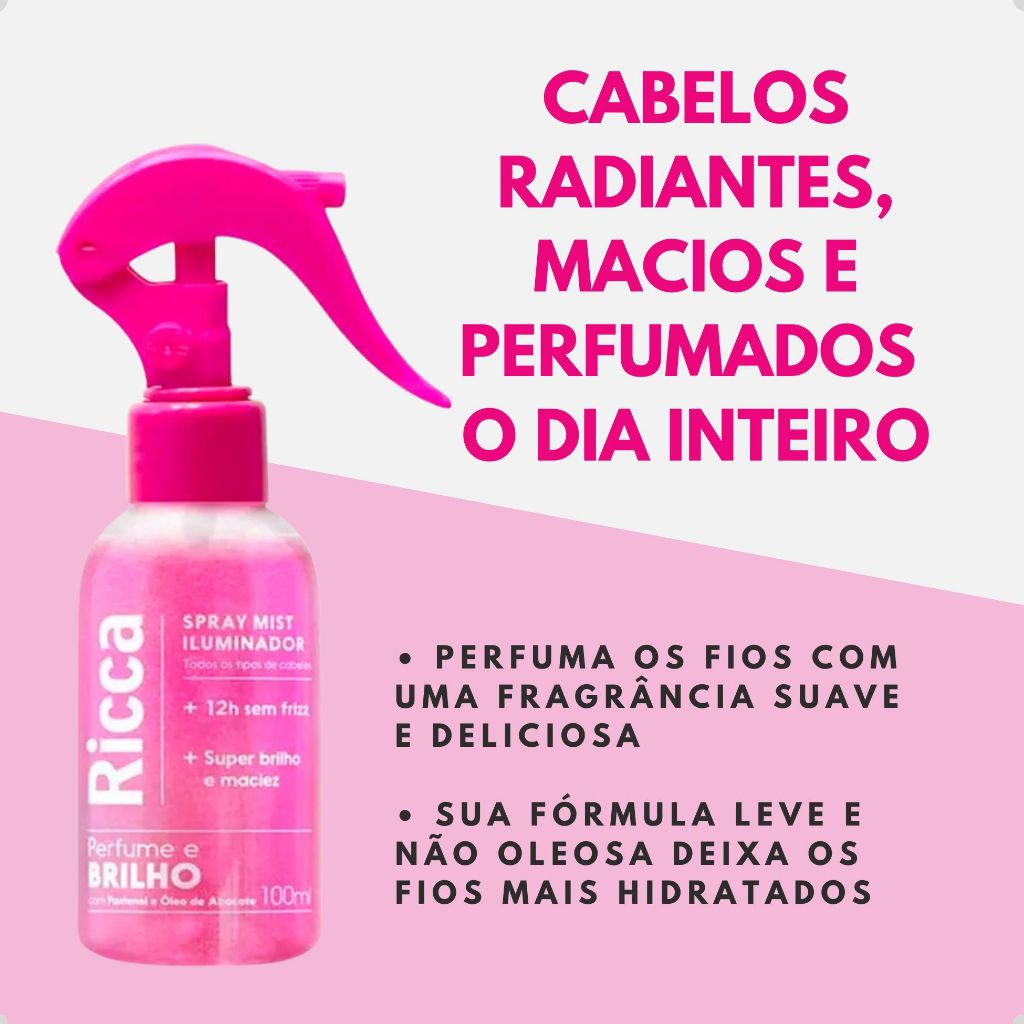 Spray Iluminador Ricca Mist 100ml Perfume Brilho Controle Frizz Hidratação Cabelos sem sulfato