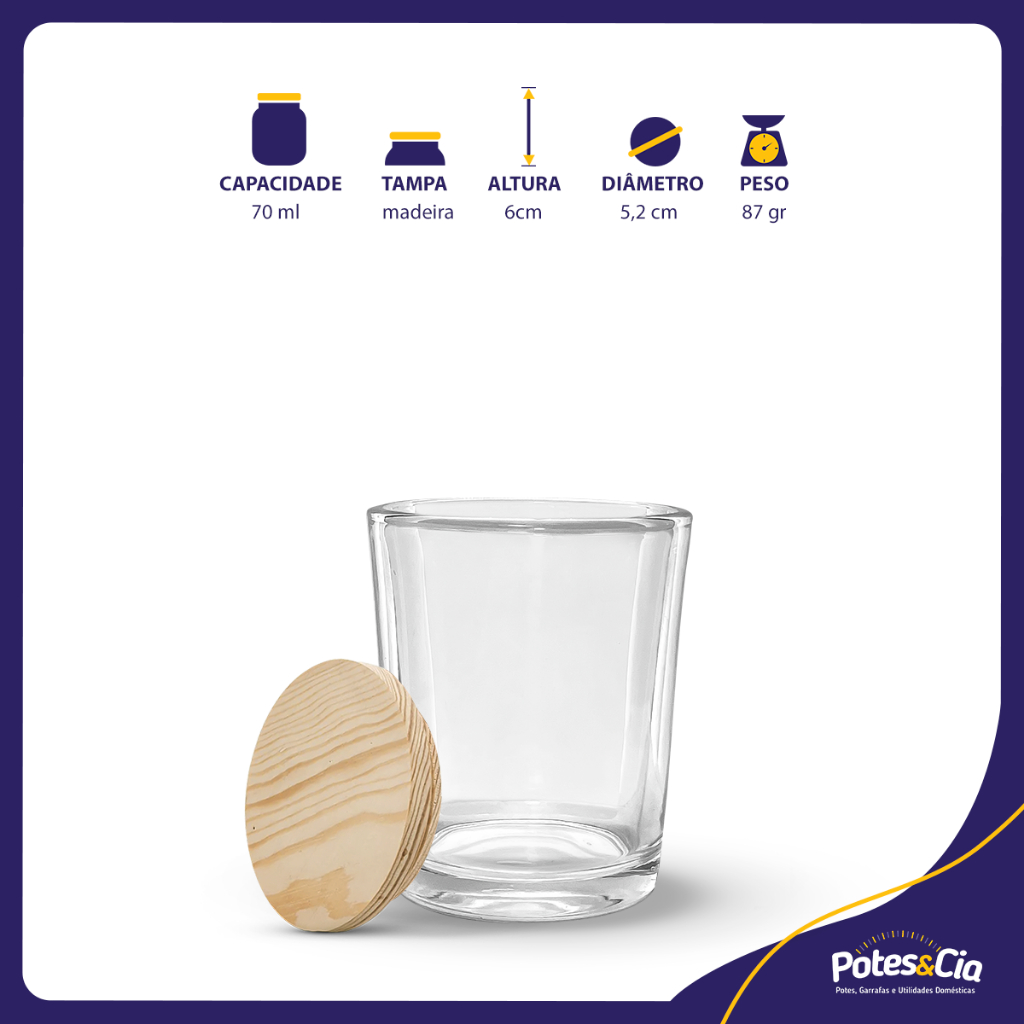 24 Copos De Vidro Redondo Para Vela 70ml C/ Tampas Madeira