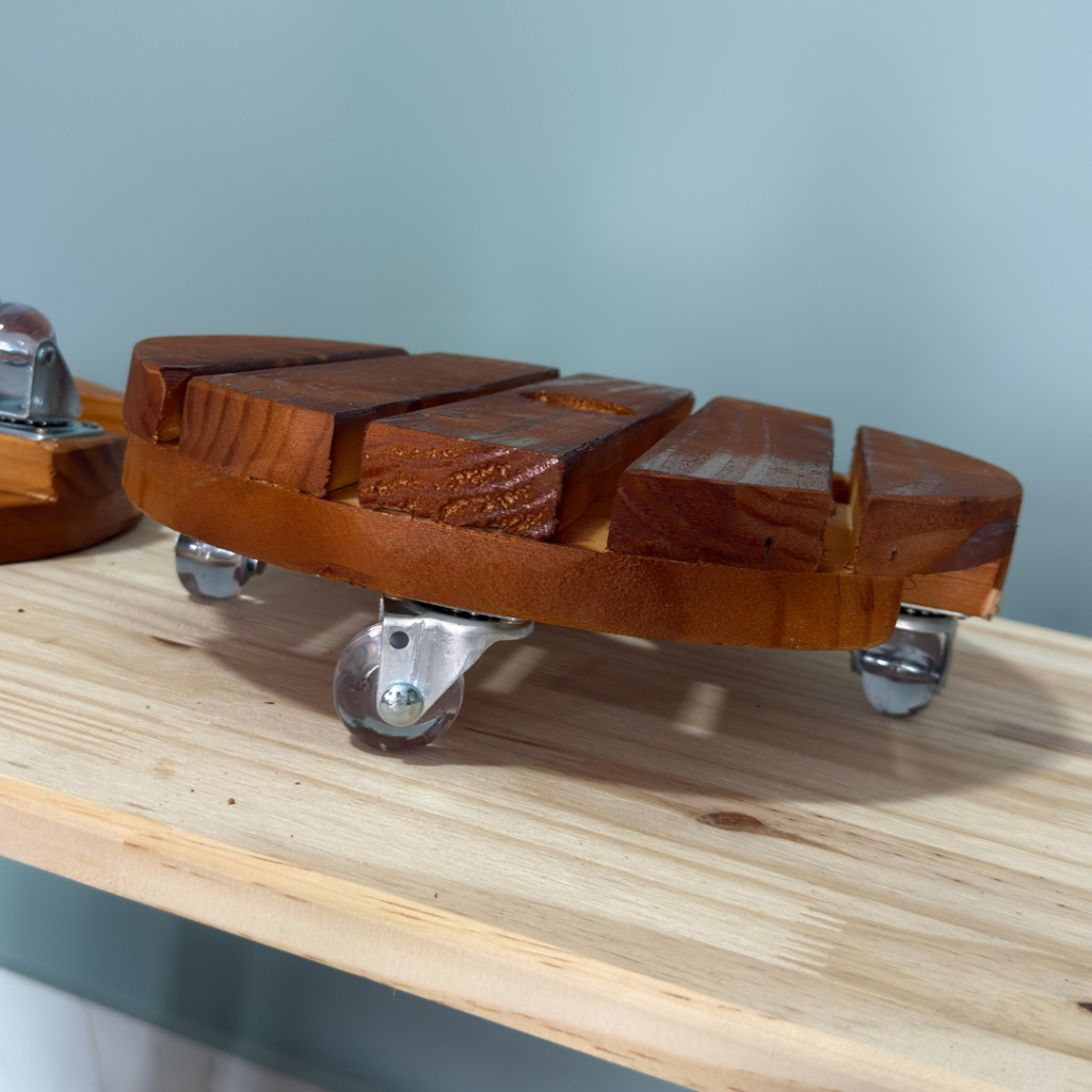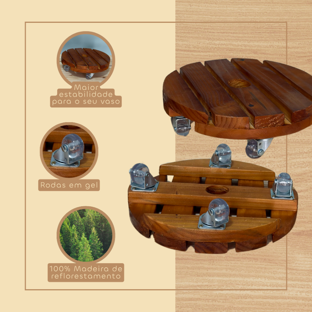 Suporte Redondo de Madeira com Rodinhas Gel 30cm Vaso de Planta Prático Resistente Não Risca o Chão