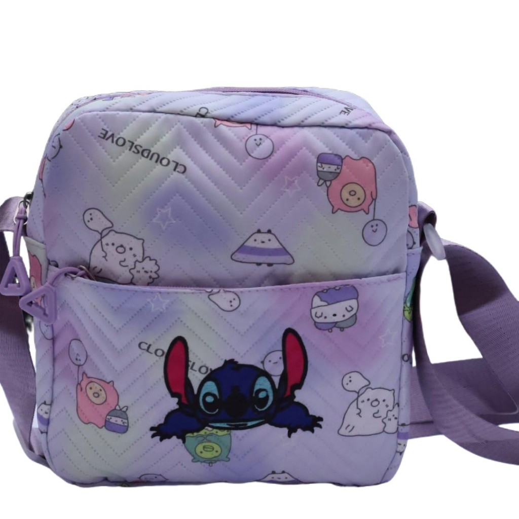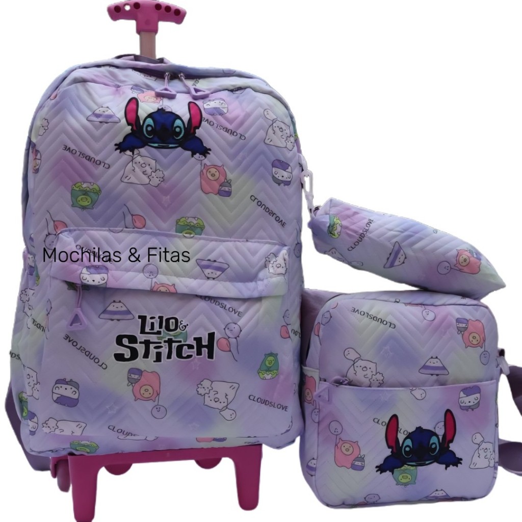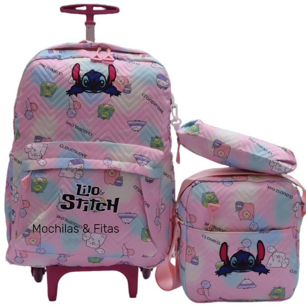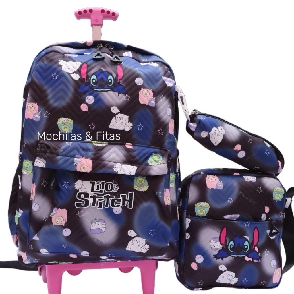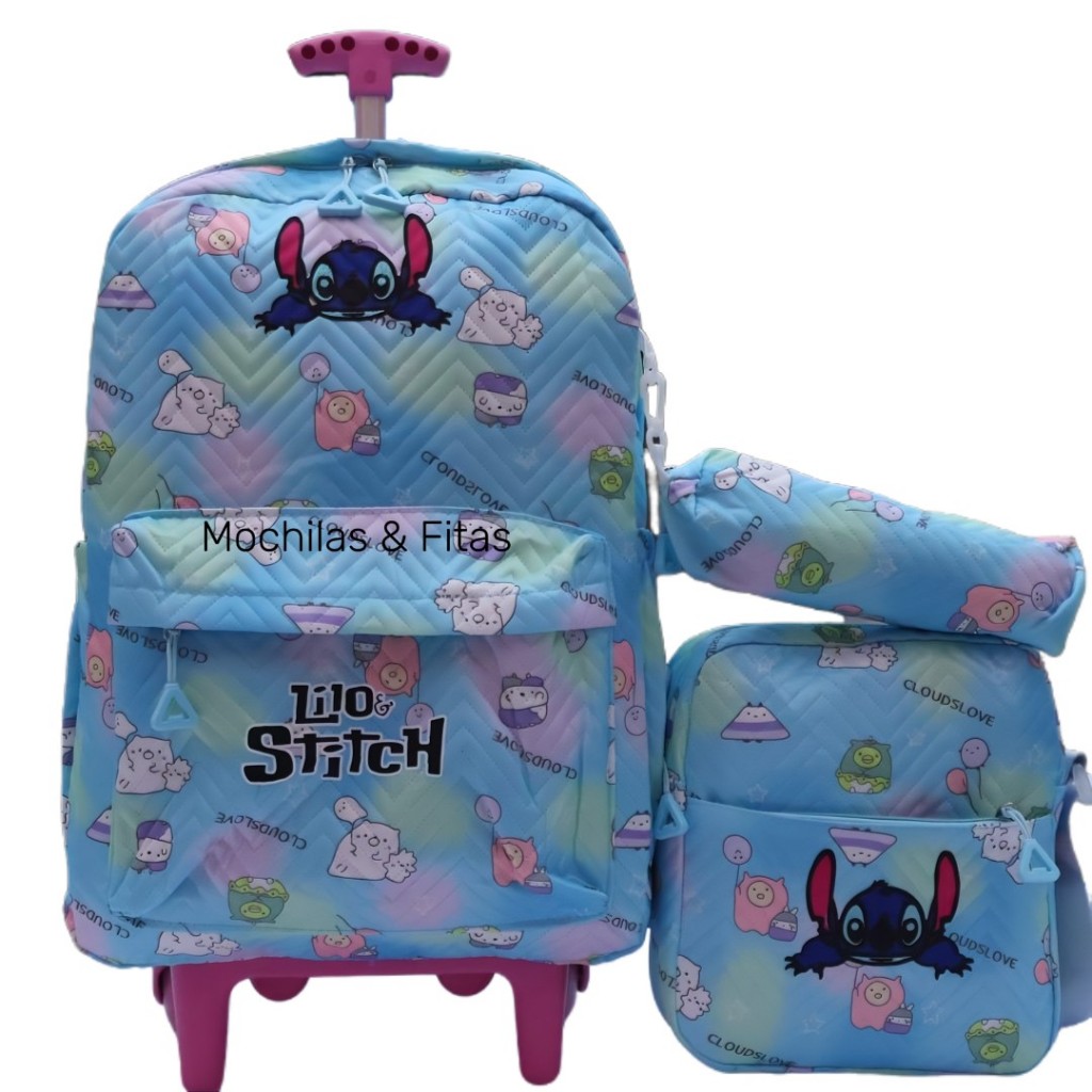 Mochila Infantil com Rodinha + Lancheira + Estojo Stitch Azul Escolar