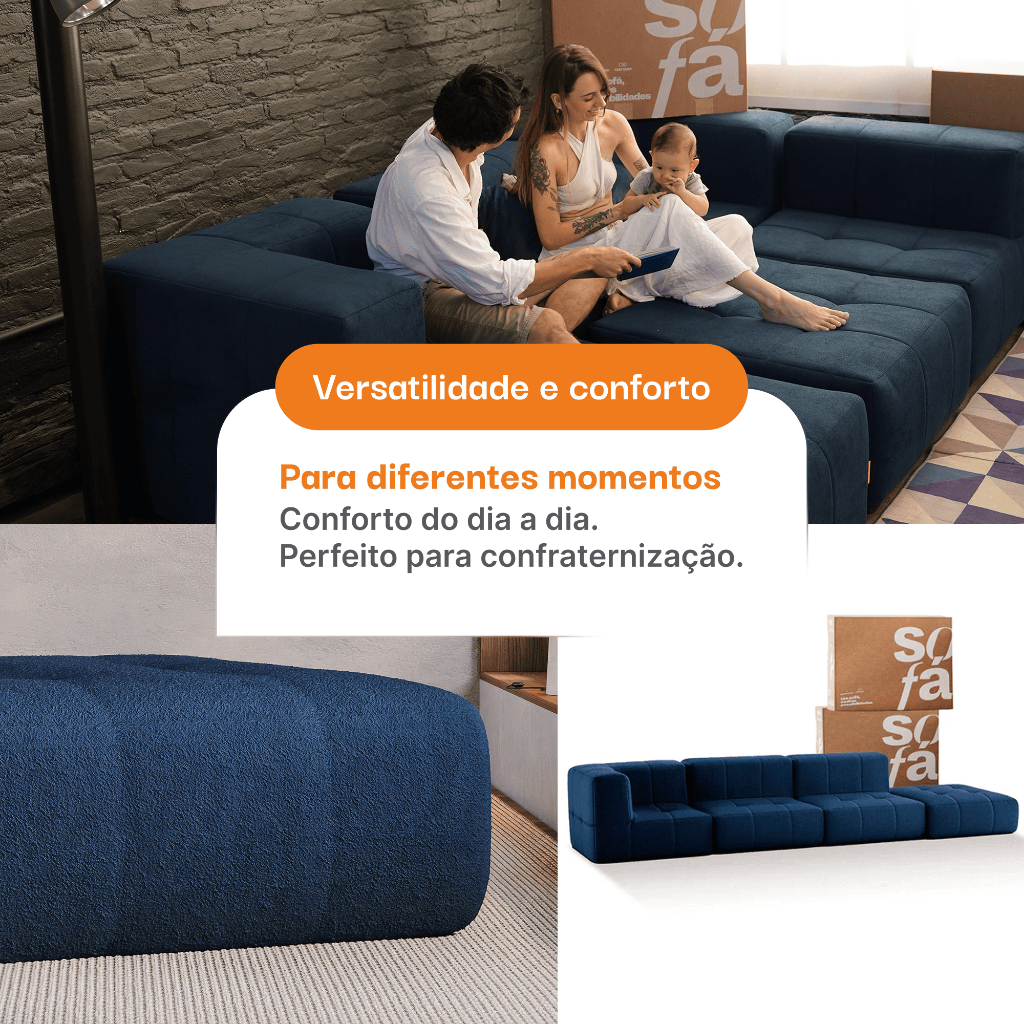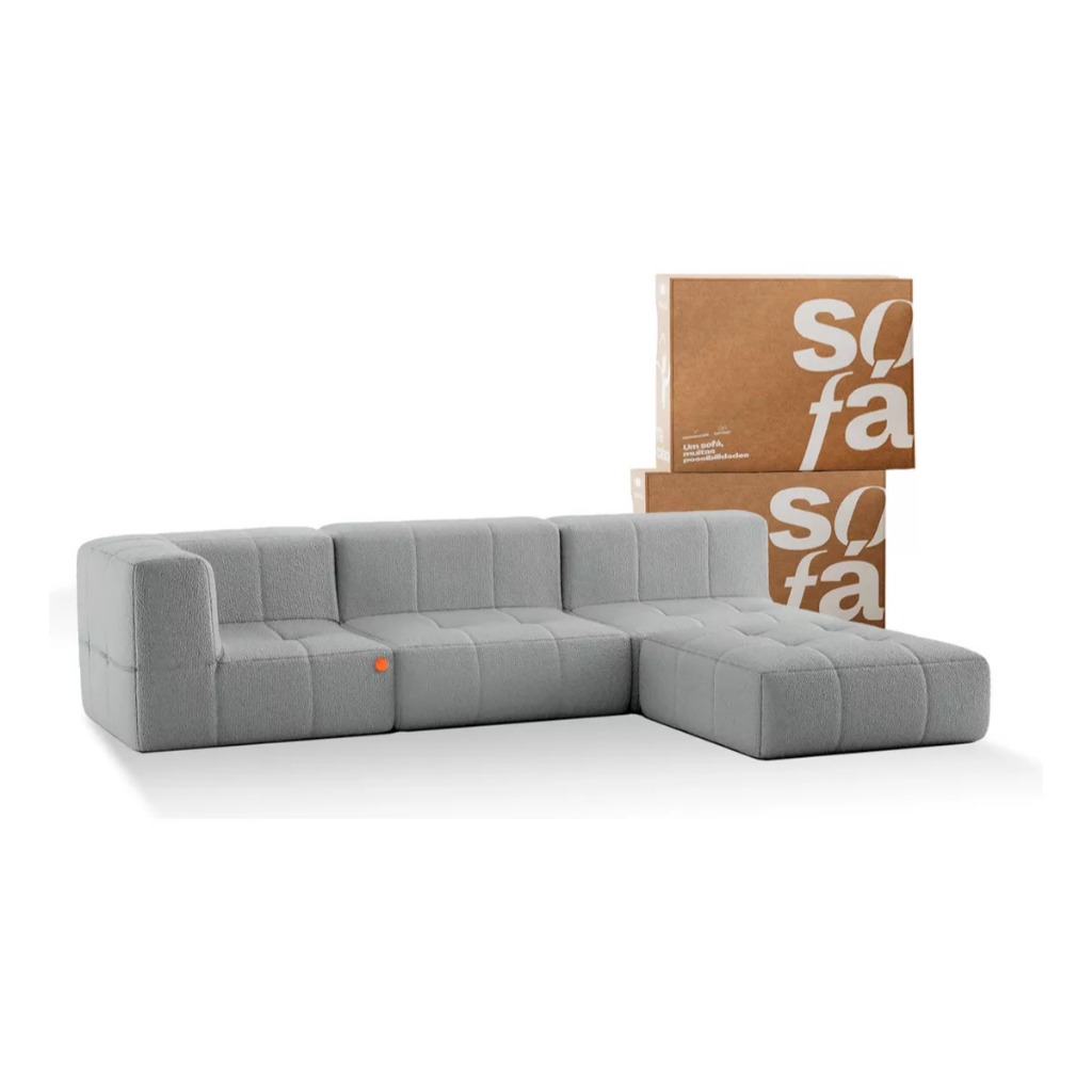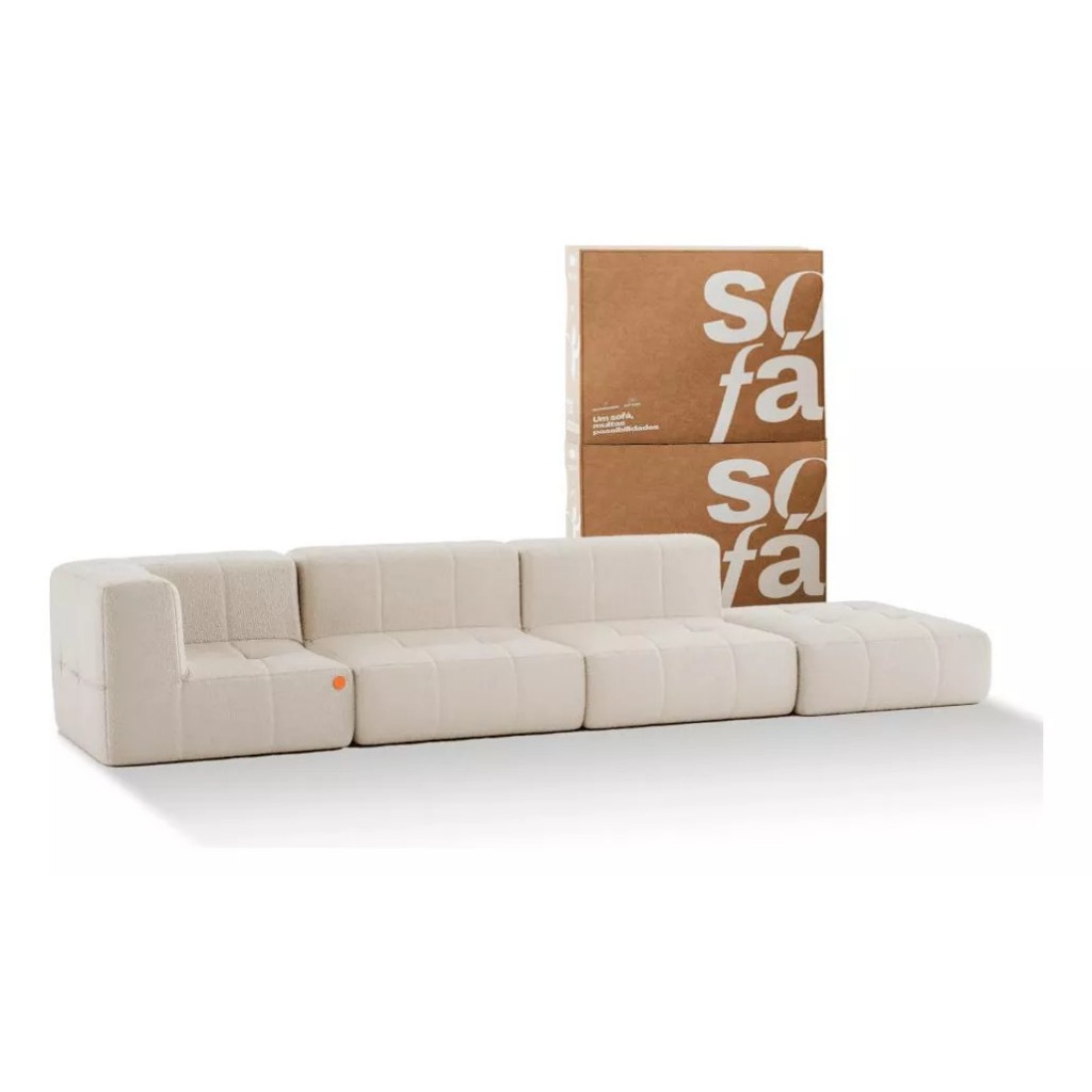 Sofá 3 lugares Modular com 1 Apoio (Puff) - Sofá na Caixa em Boucle com 4 Módulos 3,44m - 1 Braço