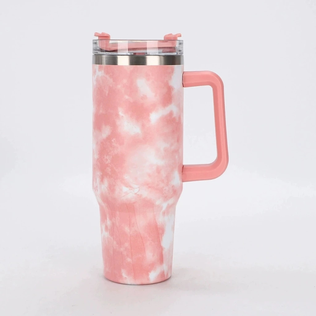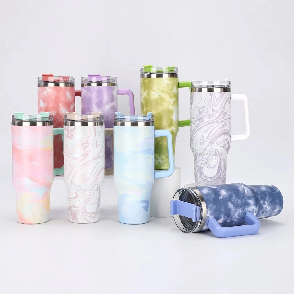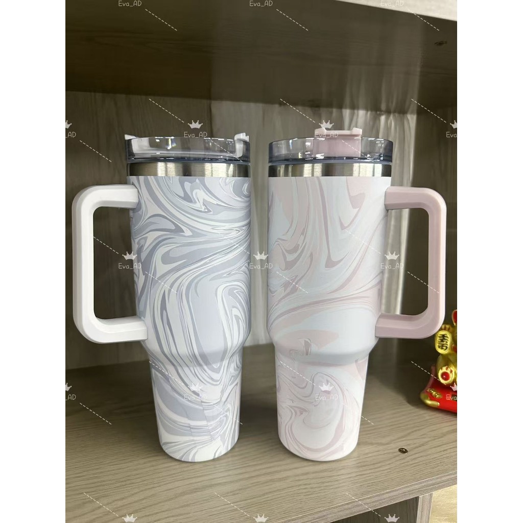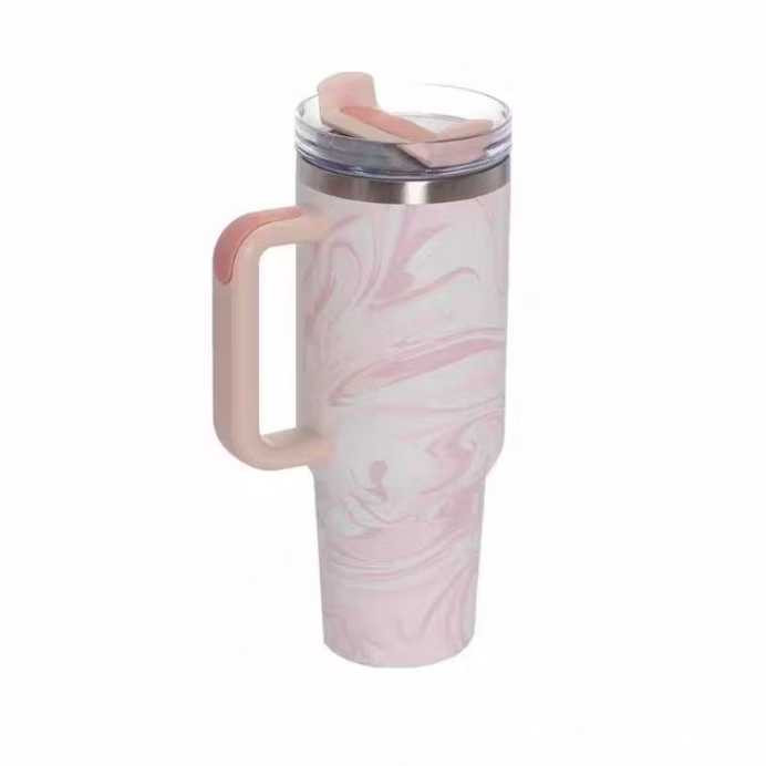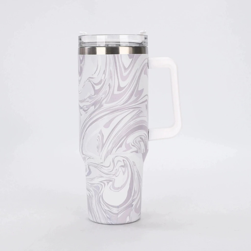 Garrafa térmica portátil de aço inoxidável com pintura marmorizada, capacidade de 1200ml, com tampa e canudo metálico.