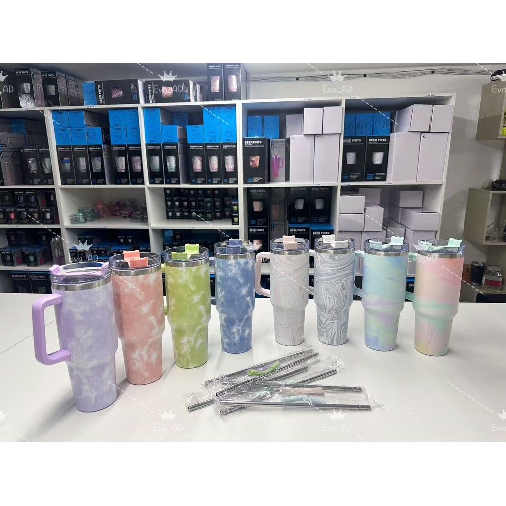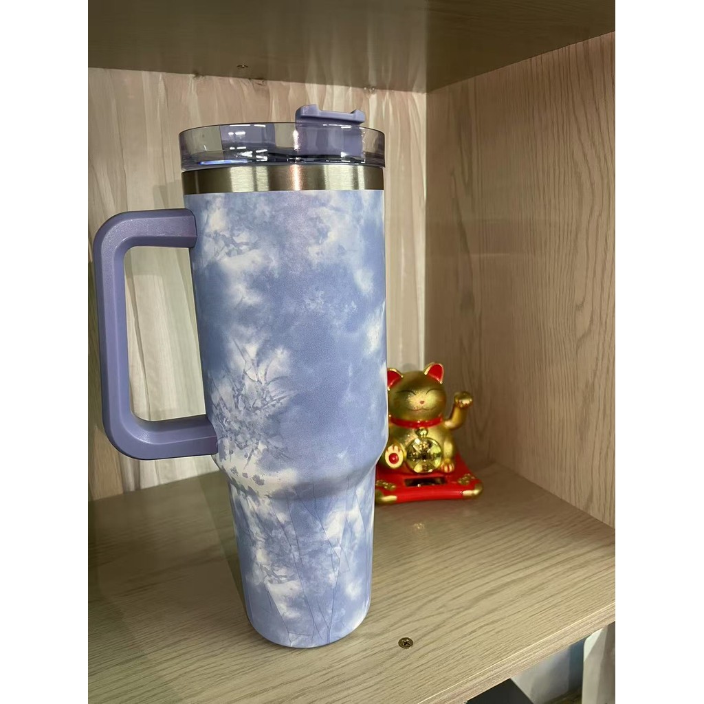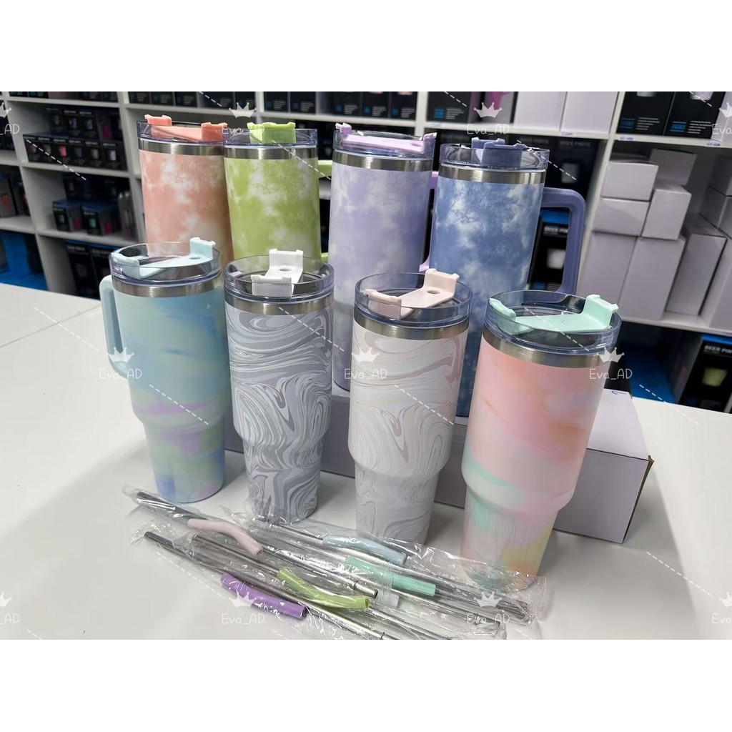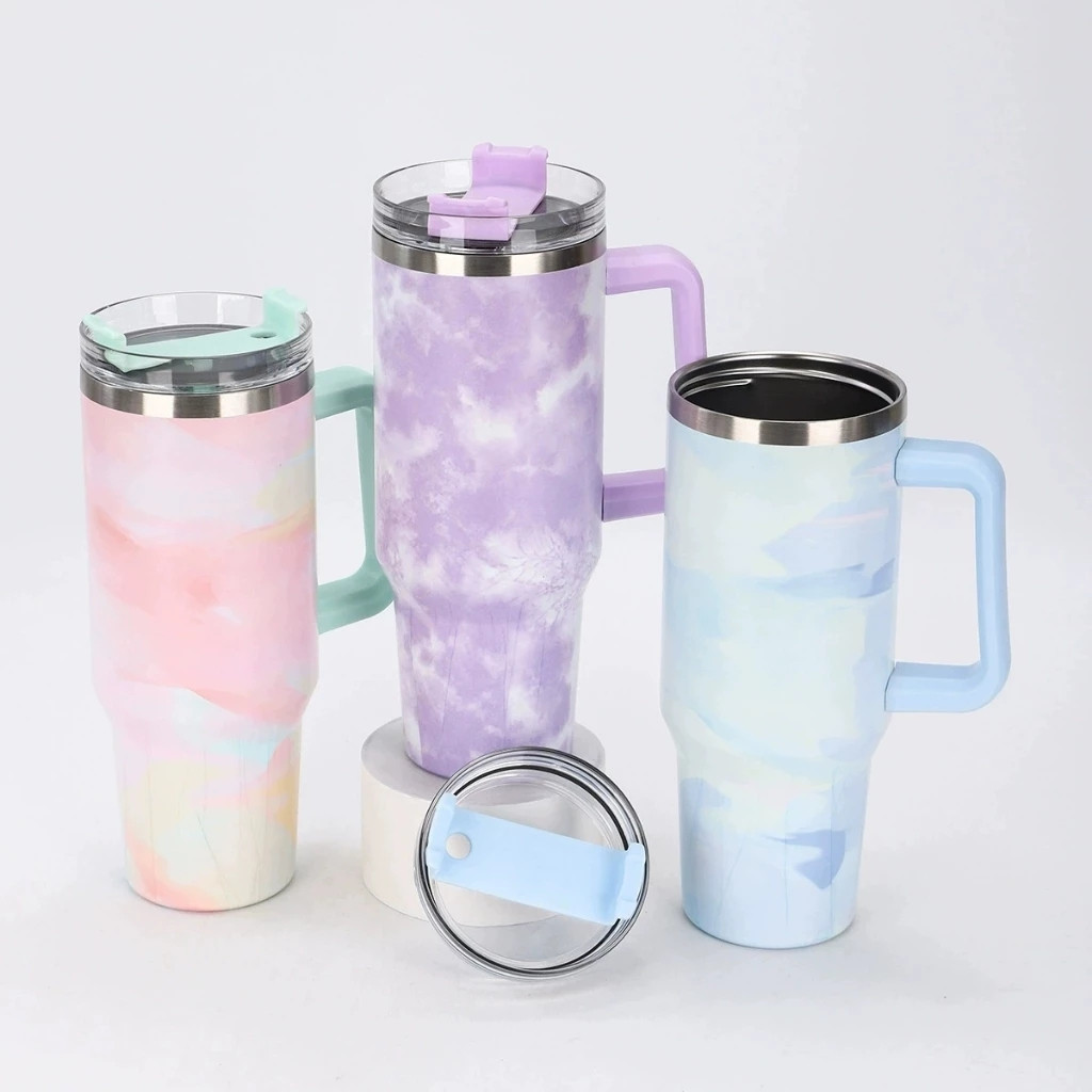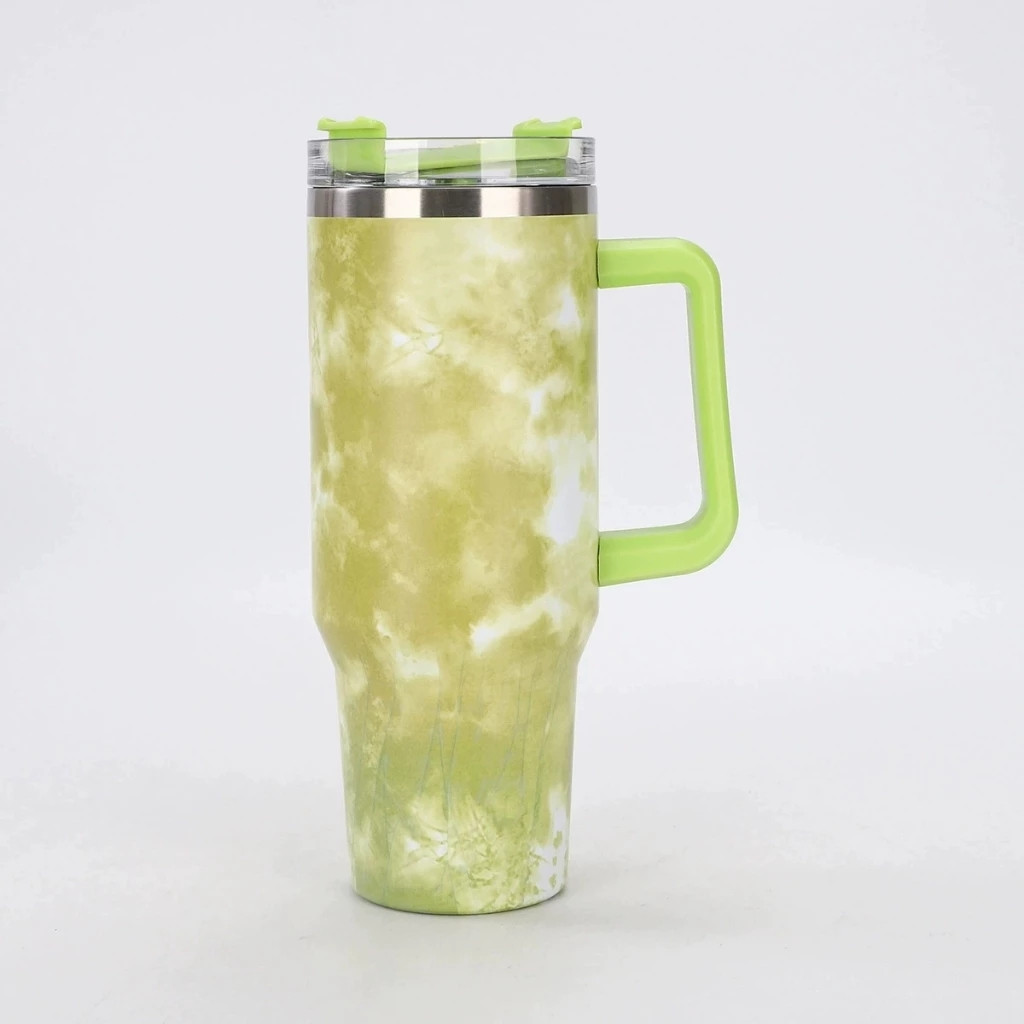 Garrafa térmica portátil de aço inoxidável com pintura marmorizada, capacidade de 1200ml, com tampa e canudo metálico.