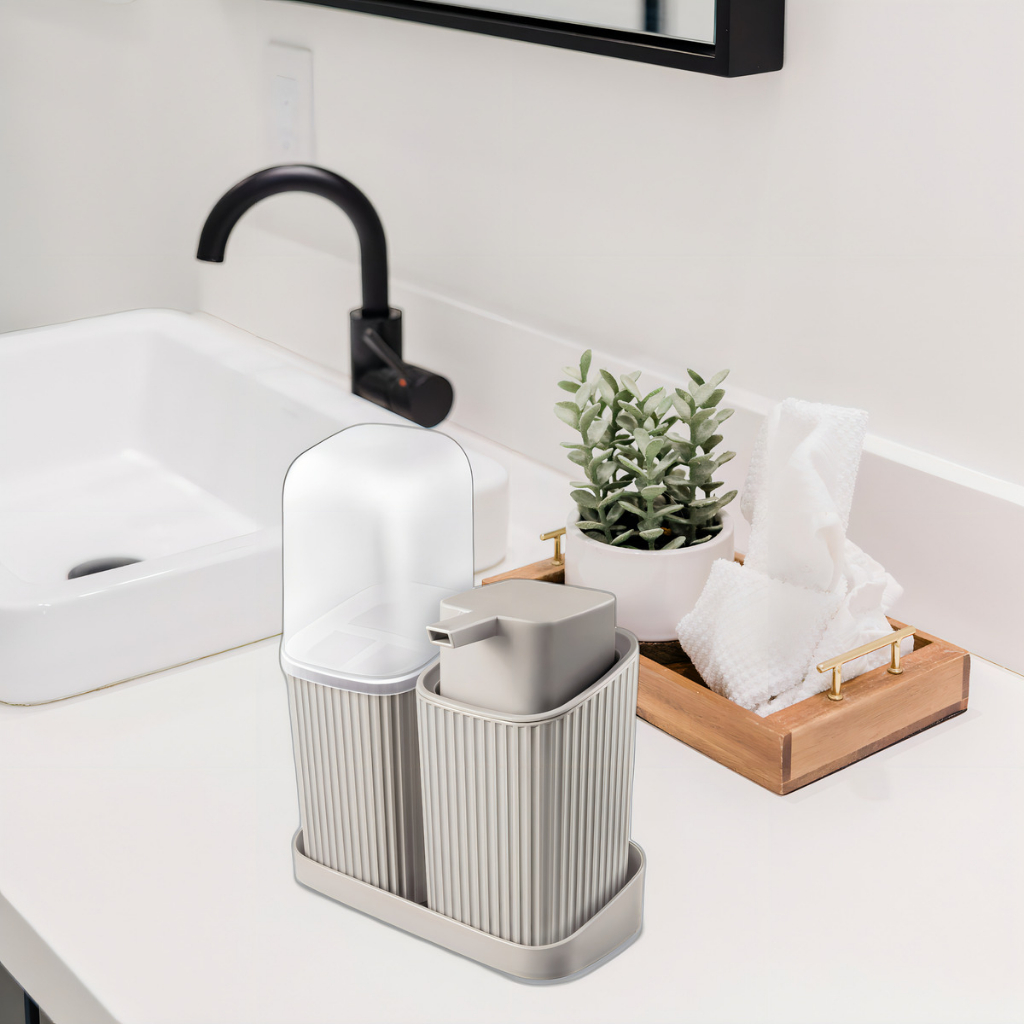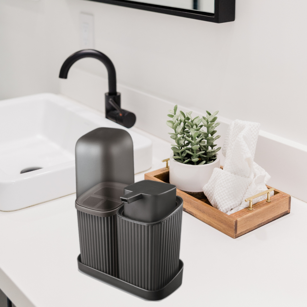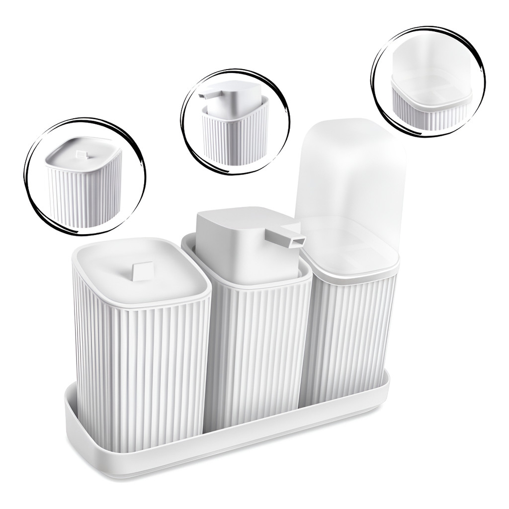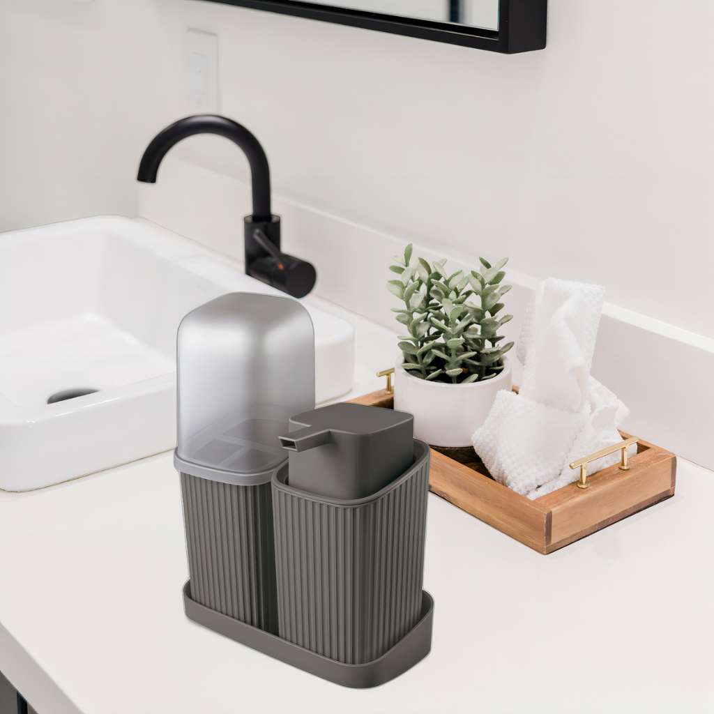 Kit Banheiro Lavabo 3 ou 2 Peças Com Bandeja Porta Escova Algodão e Sabonete Líquido 400ML Decoração Organização