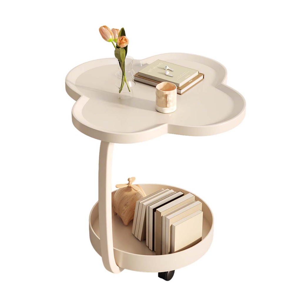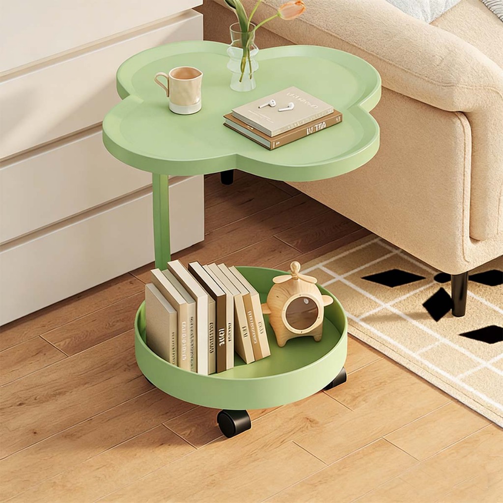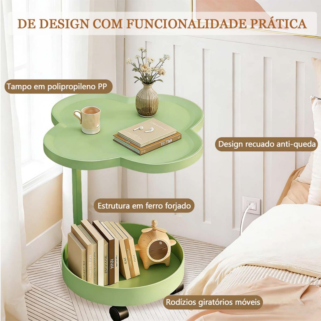Mesa Lateral Trevo com Rodinhas 2 Tampos Moderna em Ferro Premium para Sala e Quarto
