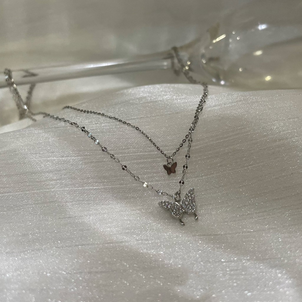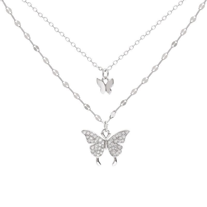 Colar feminino de liga metálica com pingente de borboleta em camada dupla, luxuoso e resistente ao desbotamento.