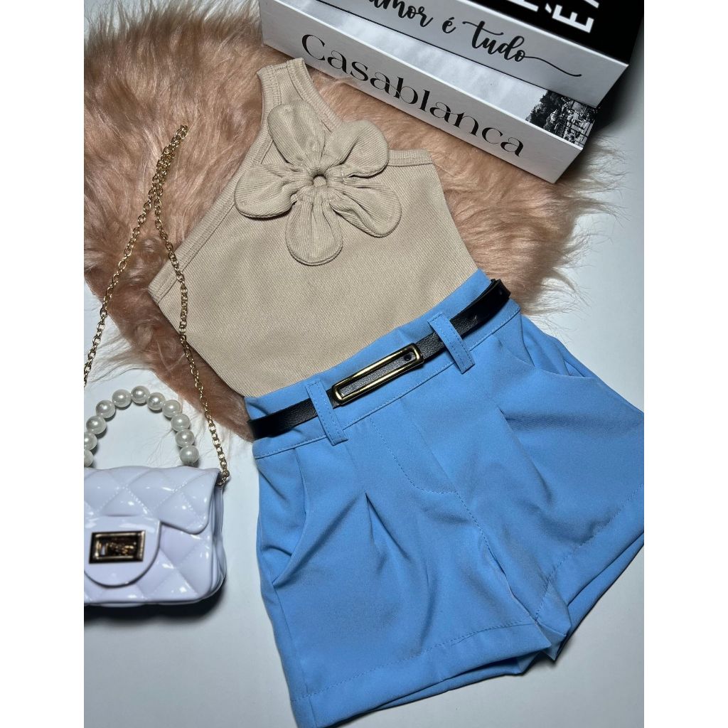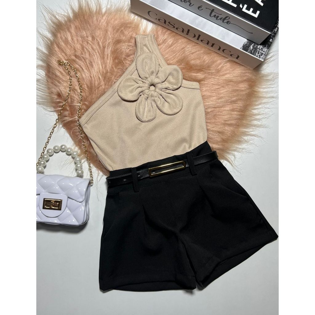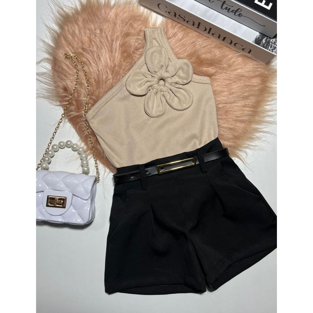 Conjunto Infantil e Juvenil Blusa Flor Short Alfaiataria Luxo Blogueirinha